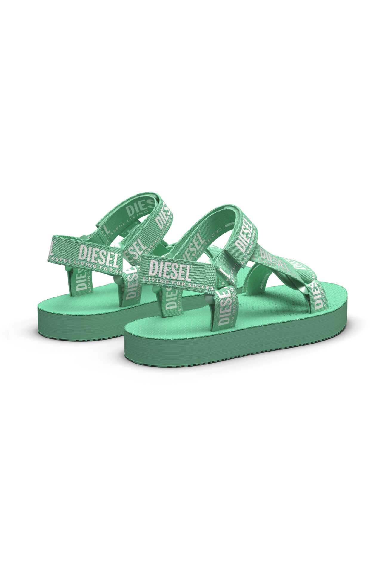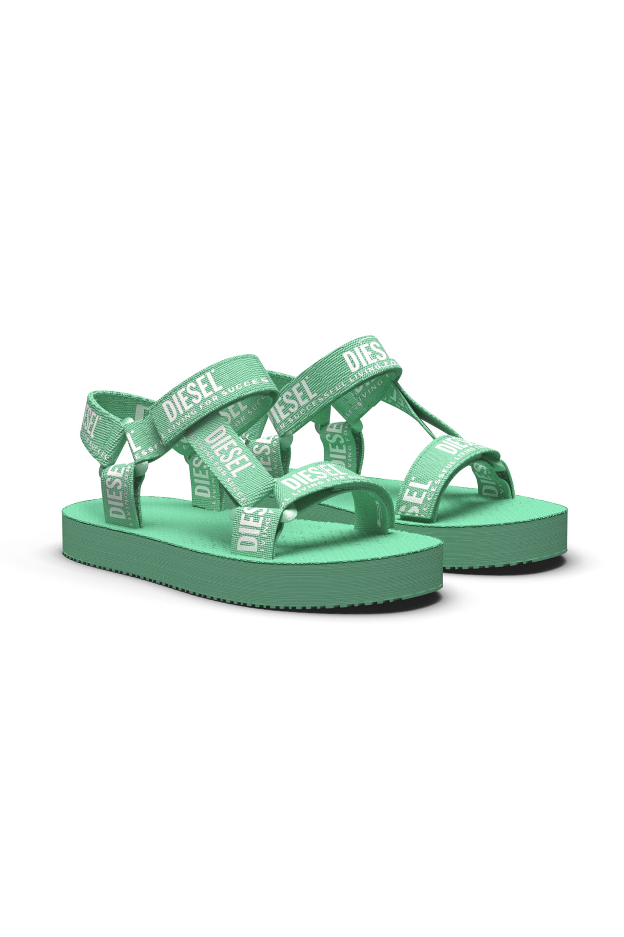 סנדלים עם רצועות מתכווננות בסגירת סקוצ׳ים, בצבע ירוק עם הדפס לוגו חוזר וסוליות עבות