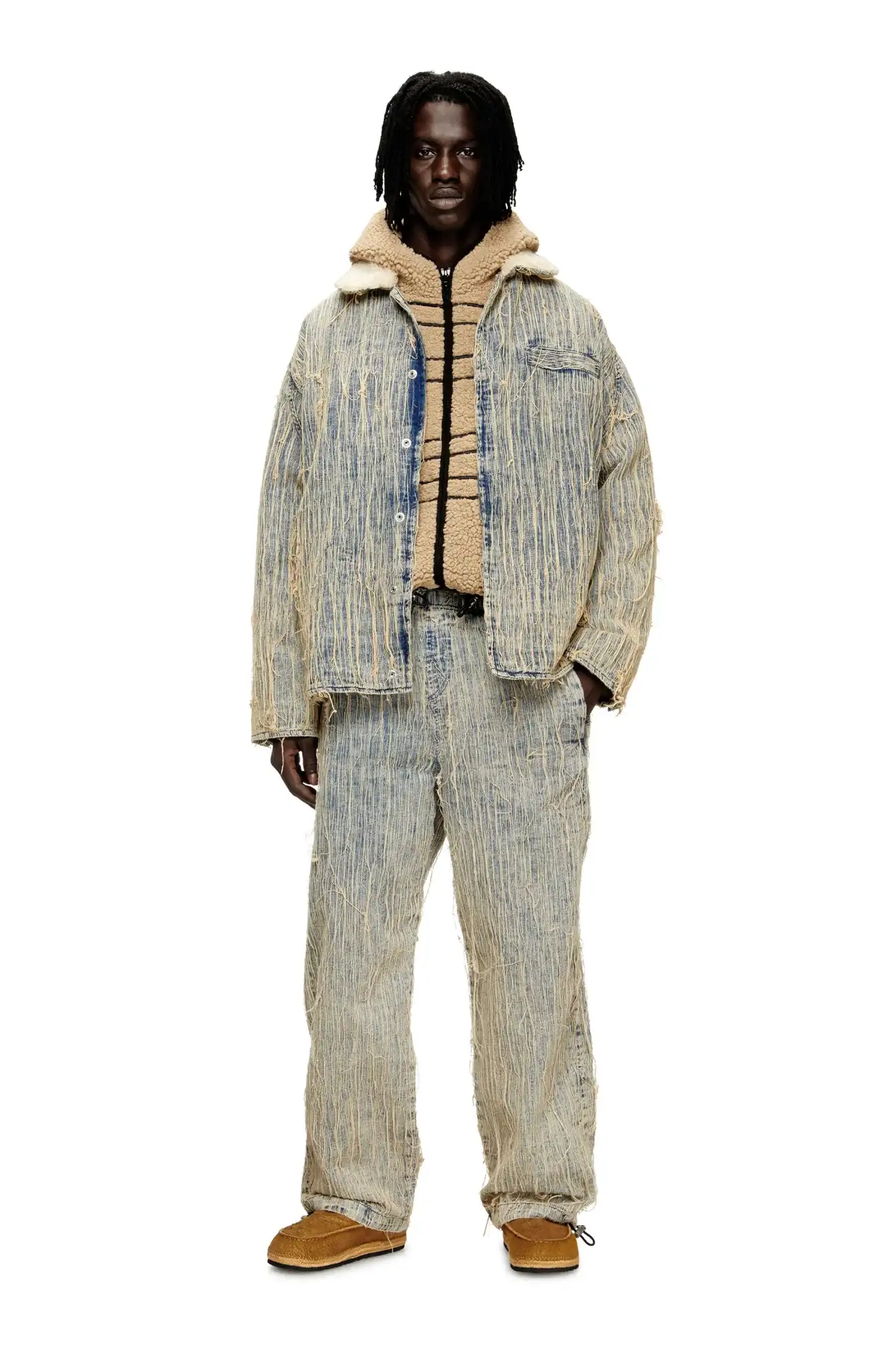 ג׳ינס כחול בהיר בגזרה ישרה ומשוחררת עם חוטים פרומים לאורך שיוצרים טקסטורה ייחודית ושרוכי גומי במותניים ובקרסוליים