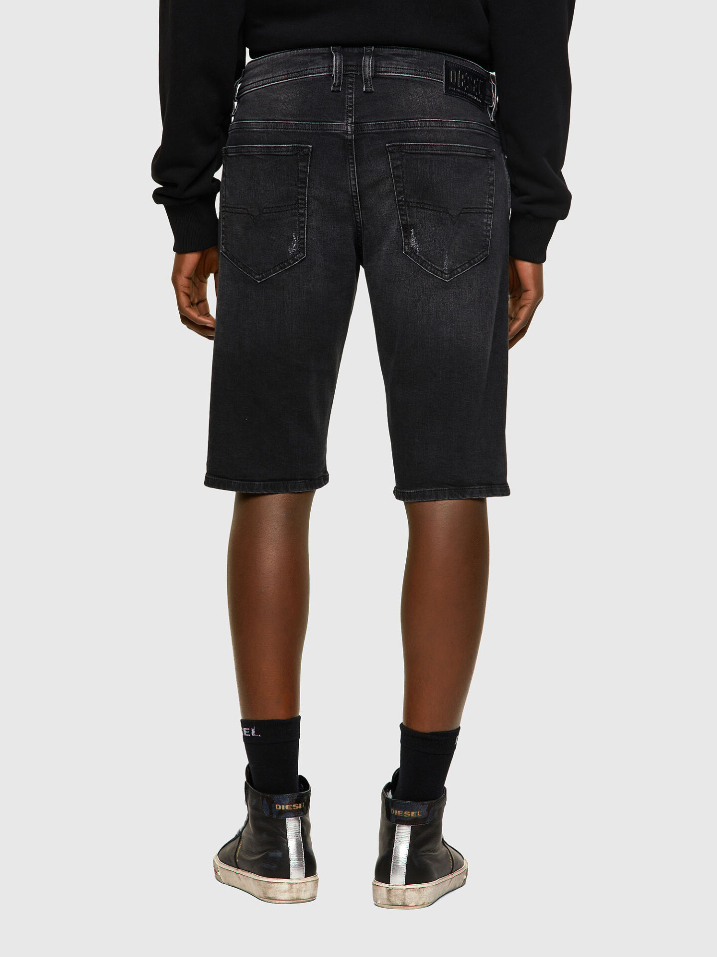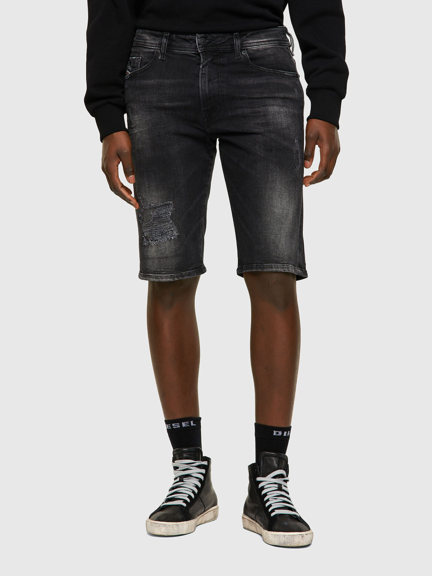 ברמודה ג'ינס, בצבע שחור משופשף, מבד כותנה מעורב באלסטן. על ירך ימין מעל הברך, קרע גדול סגור. באזור המפשעה שפשופים מאוזנים למראה תלת מימדי לבוש ומספר שריטות/קרעים סגורים באפקט מטופל. פאץ׳ מעור עם לוגו המותג מאחורה.