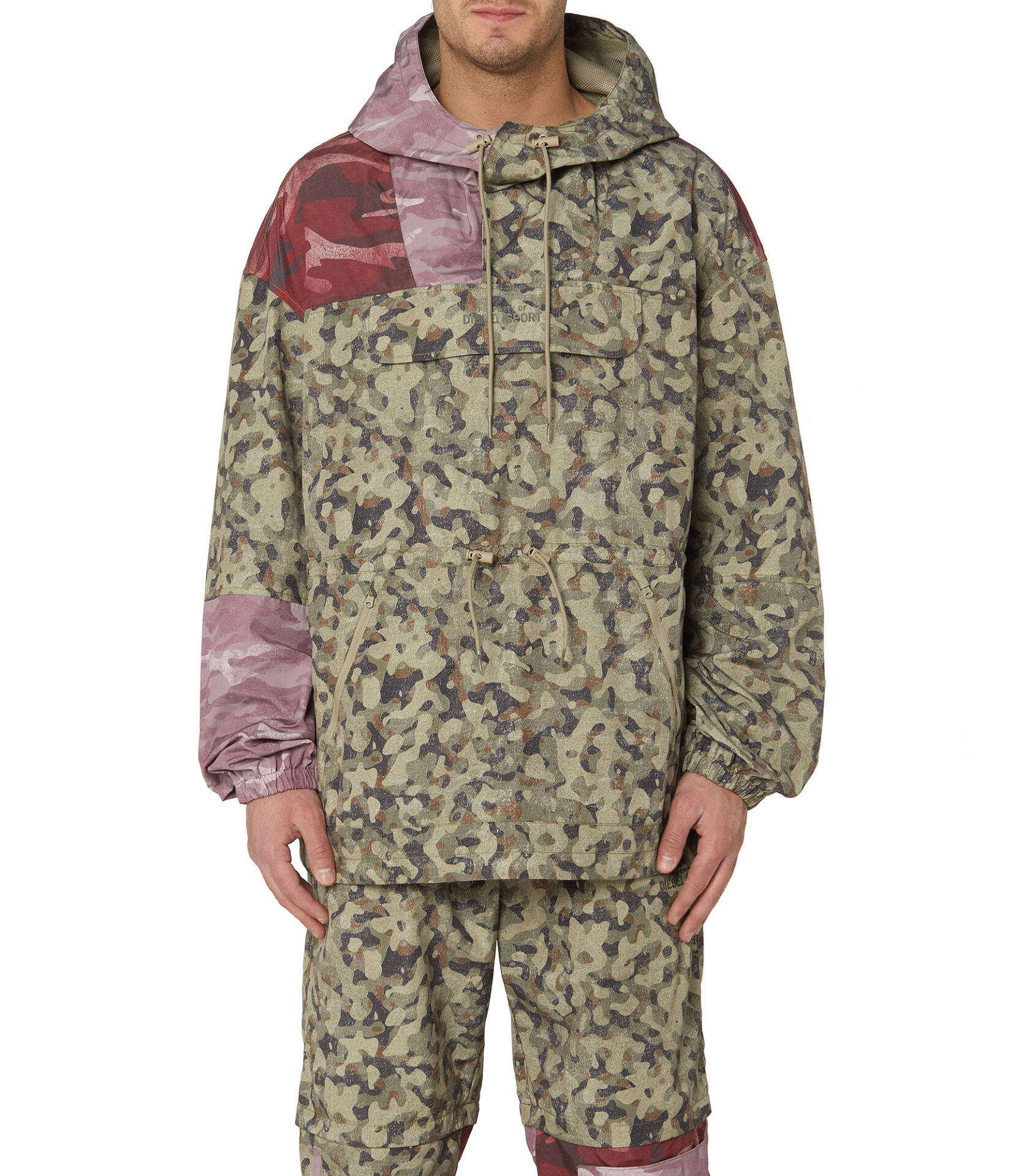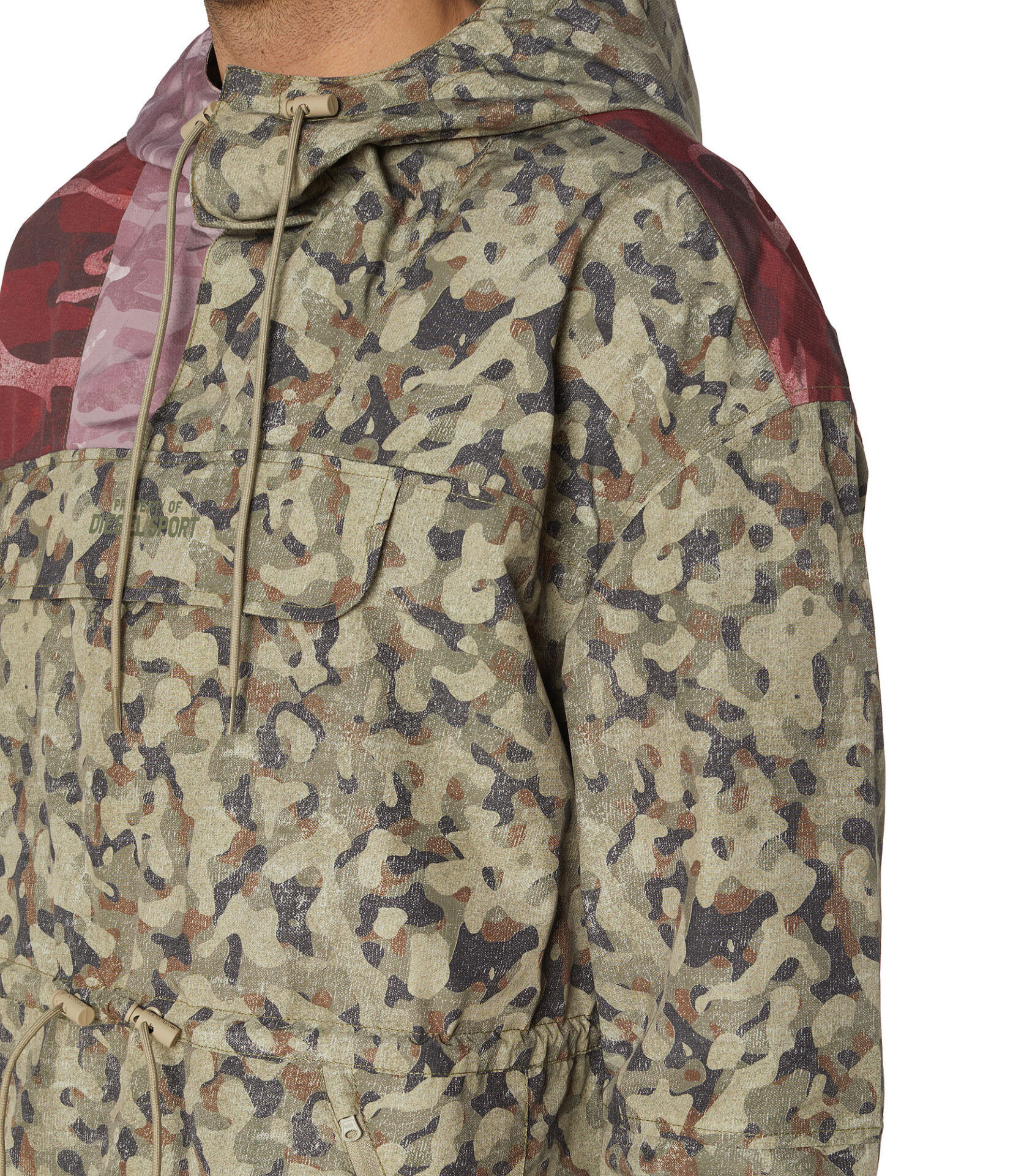 Men's hooded jacket from the DIESEL SPORT range, pieced together from water- and wind-resistant panels with contrasting camo prints. This packable style features a front pocket with logo on the flap.