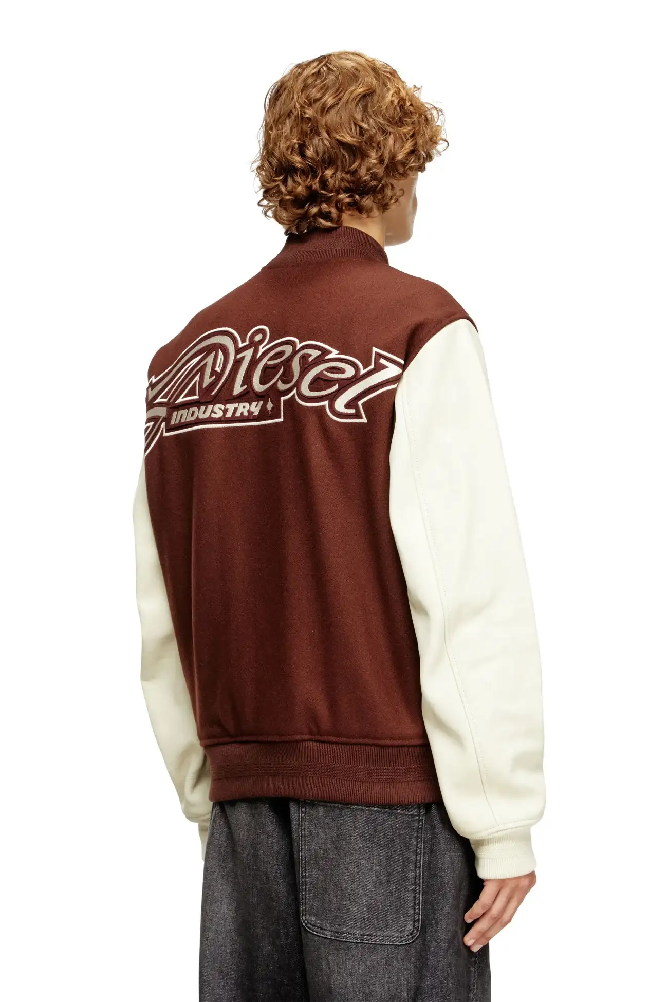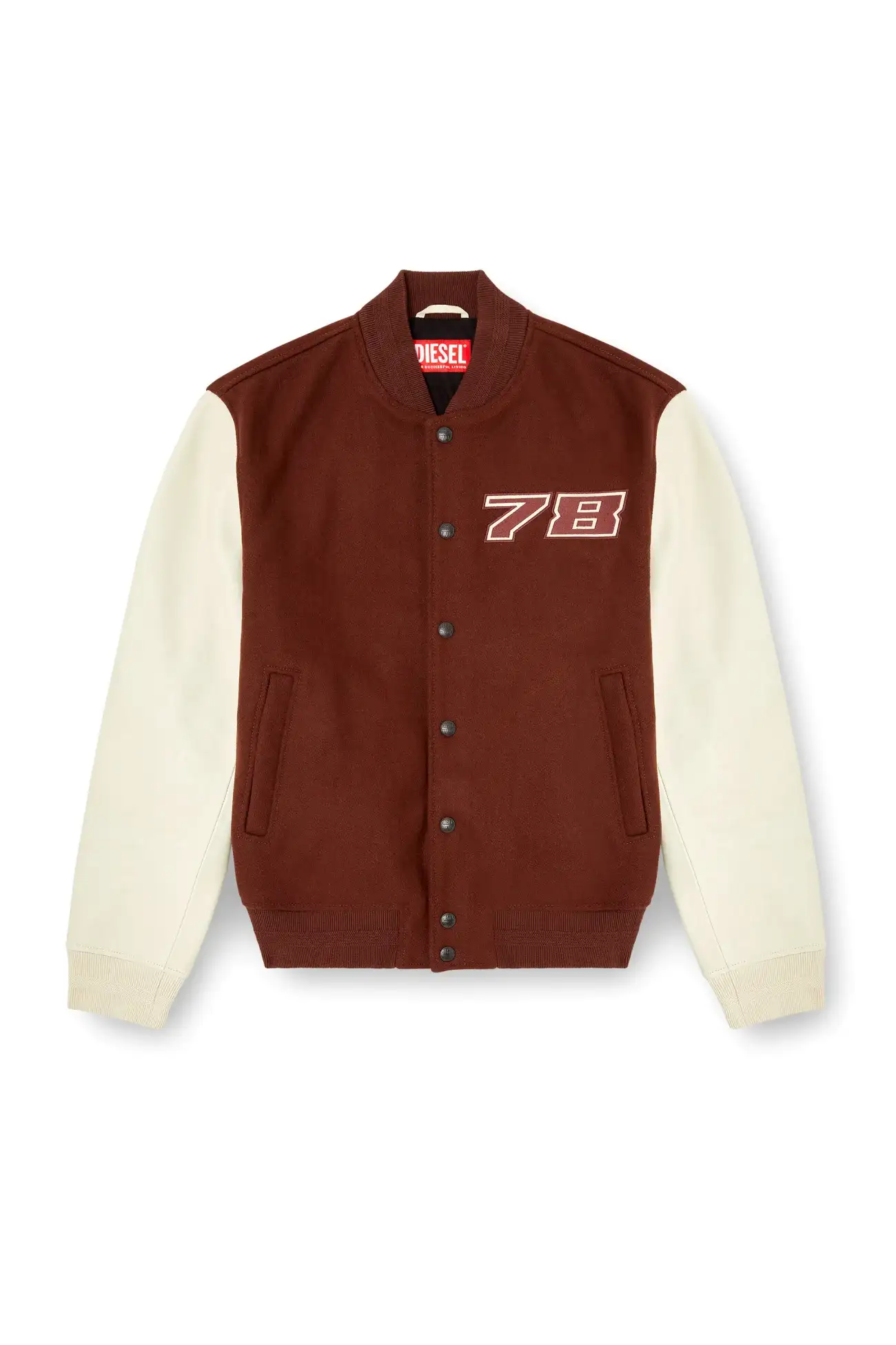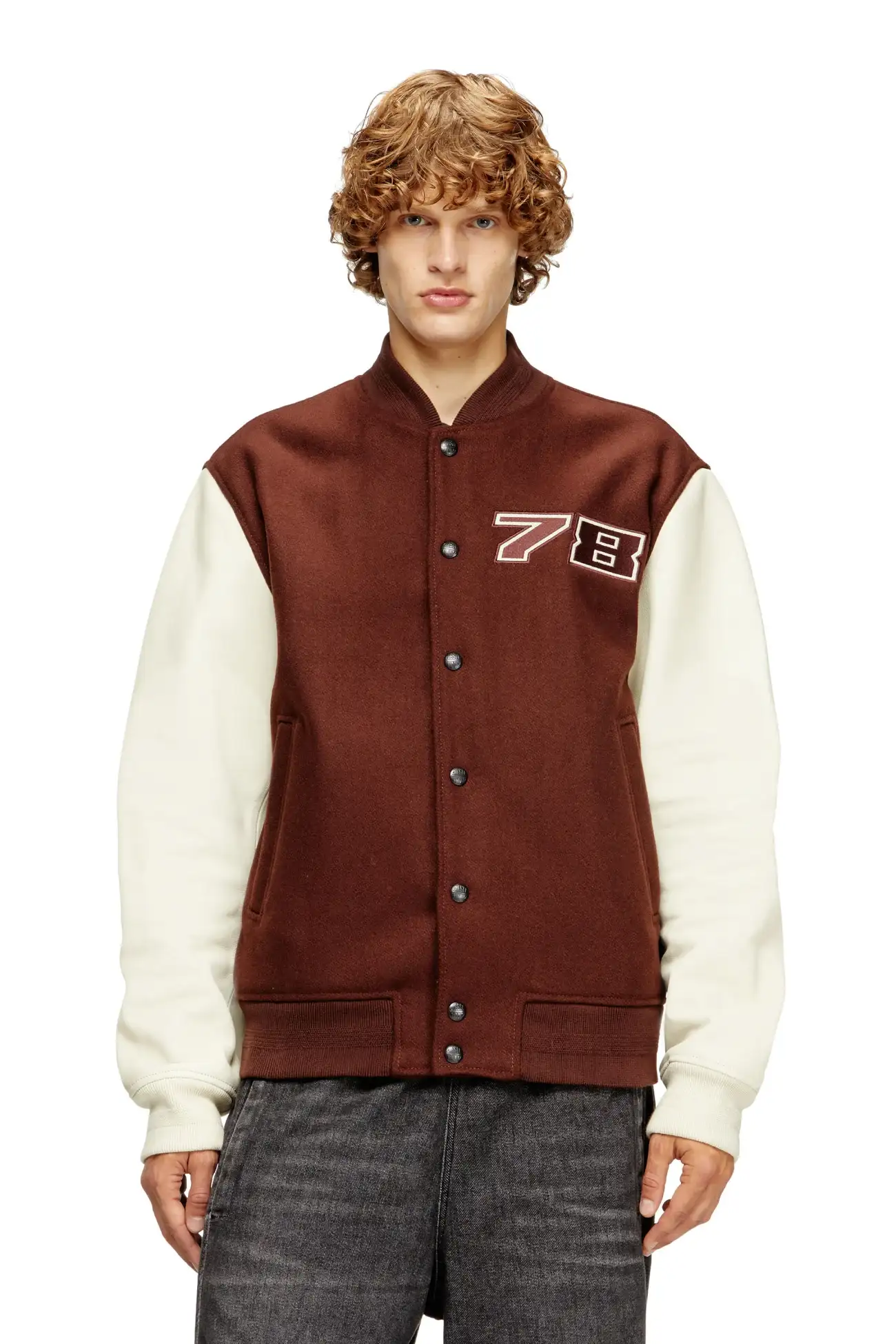 ג'קט בומבר לגברים בצבע חום, בלוק צבעים מצמר עם שרוולי עור לבנים, פאצ'ים של לוגו, כפתורי תיקתק ממותגים ומילוי לבידוד