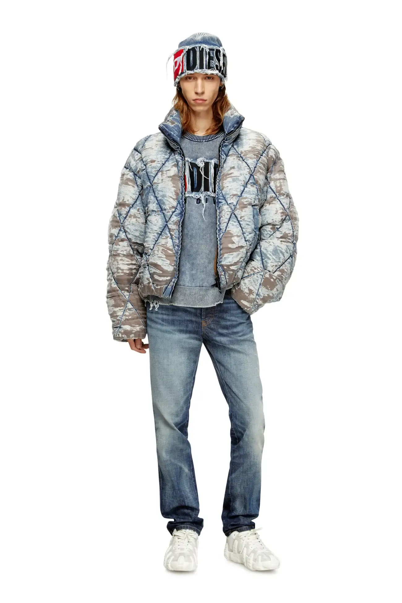 This men’s winter jacket is made from denim with argyle quilting and devoré distressing – the treatment creates areas of sheerness, revealing the garment’s coloured padding. The chunky collar and drawstring-adjustable cuffs and hem help trap heat.