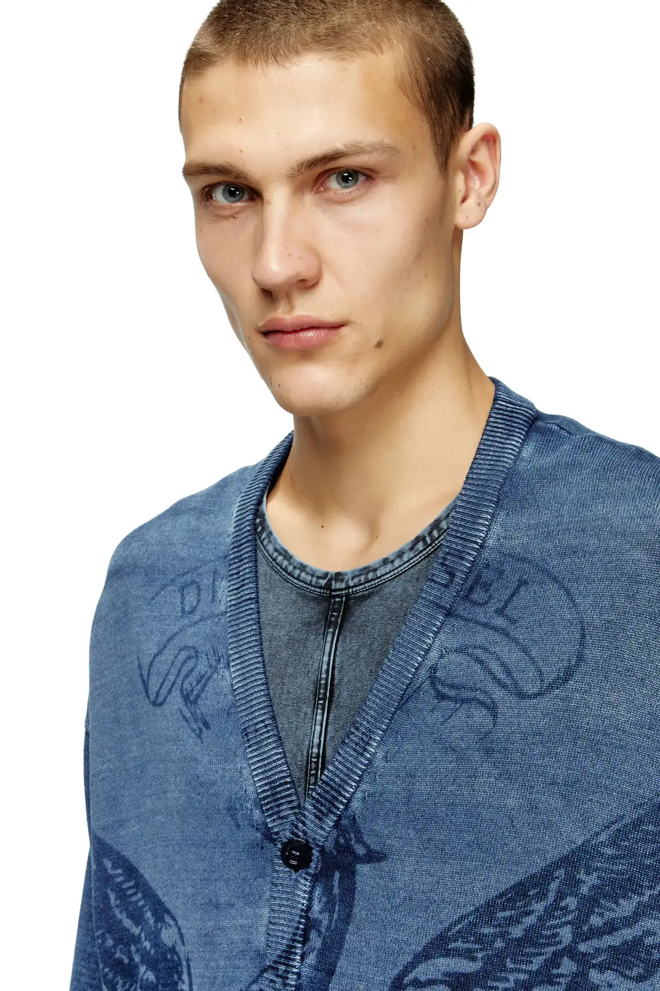 Men's blue cardigan with a V-neck and button closure. Comfortably oversized, this piece has been knitted from organic cotton, dyed in real indigo and treated to recall the iconic look of stonewashed denim. Laser technology is applied to the front, giving rise to the Phoenix logo graphic.