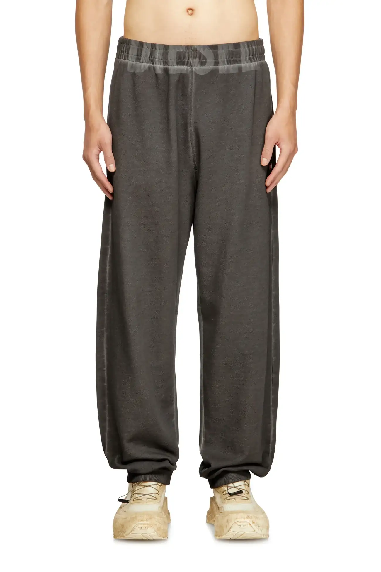 מכנסי ג'וגר כותנה בגזרה רגילה בצבע שחור/חום, מותן אלסטית עם שרוך פנימי וחפתים בסריגת ריב, כיסים קדמיים נסתרים וכיס אחורי, לוגו לייזר בחגורת המותן