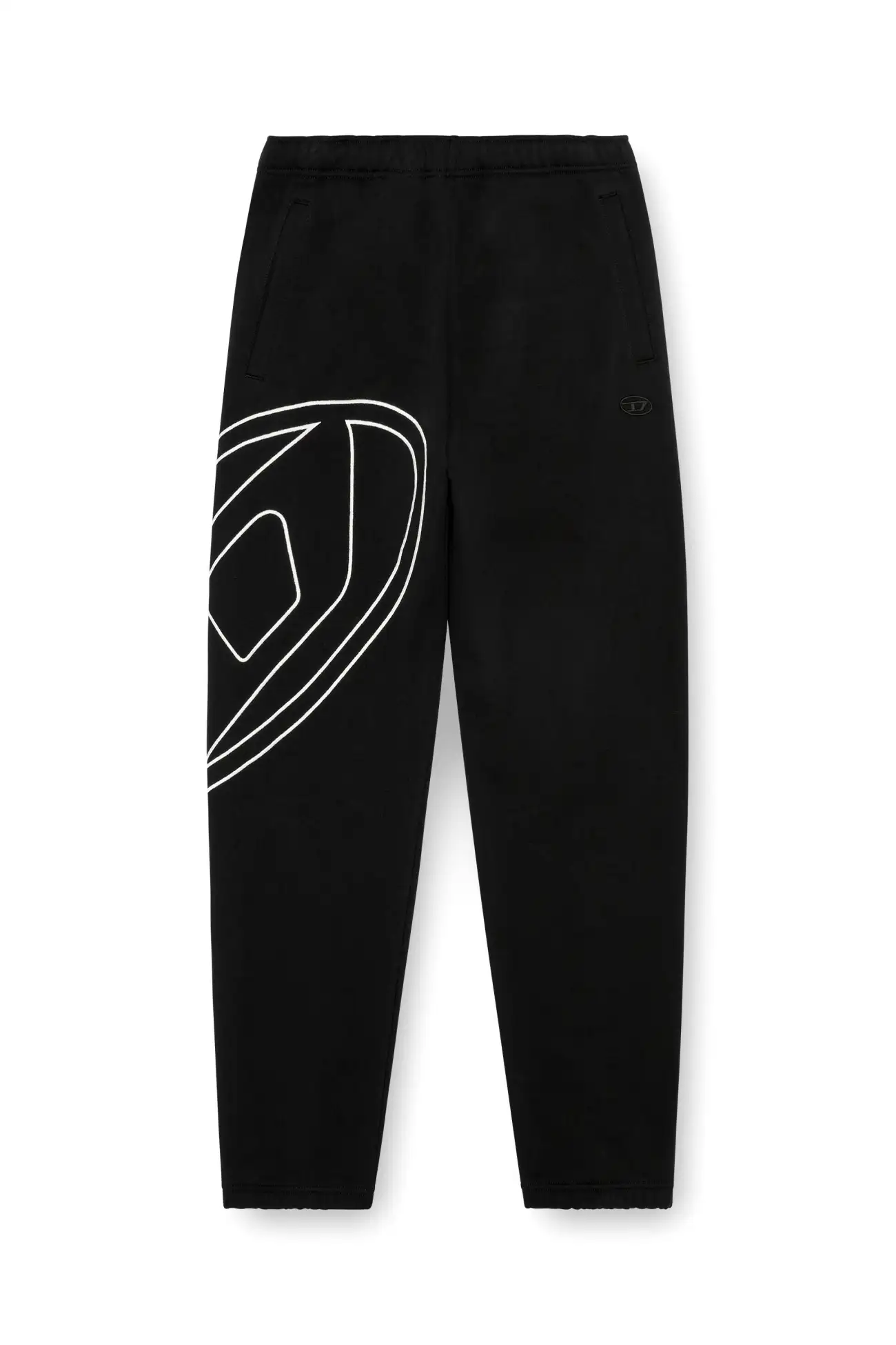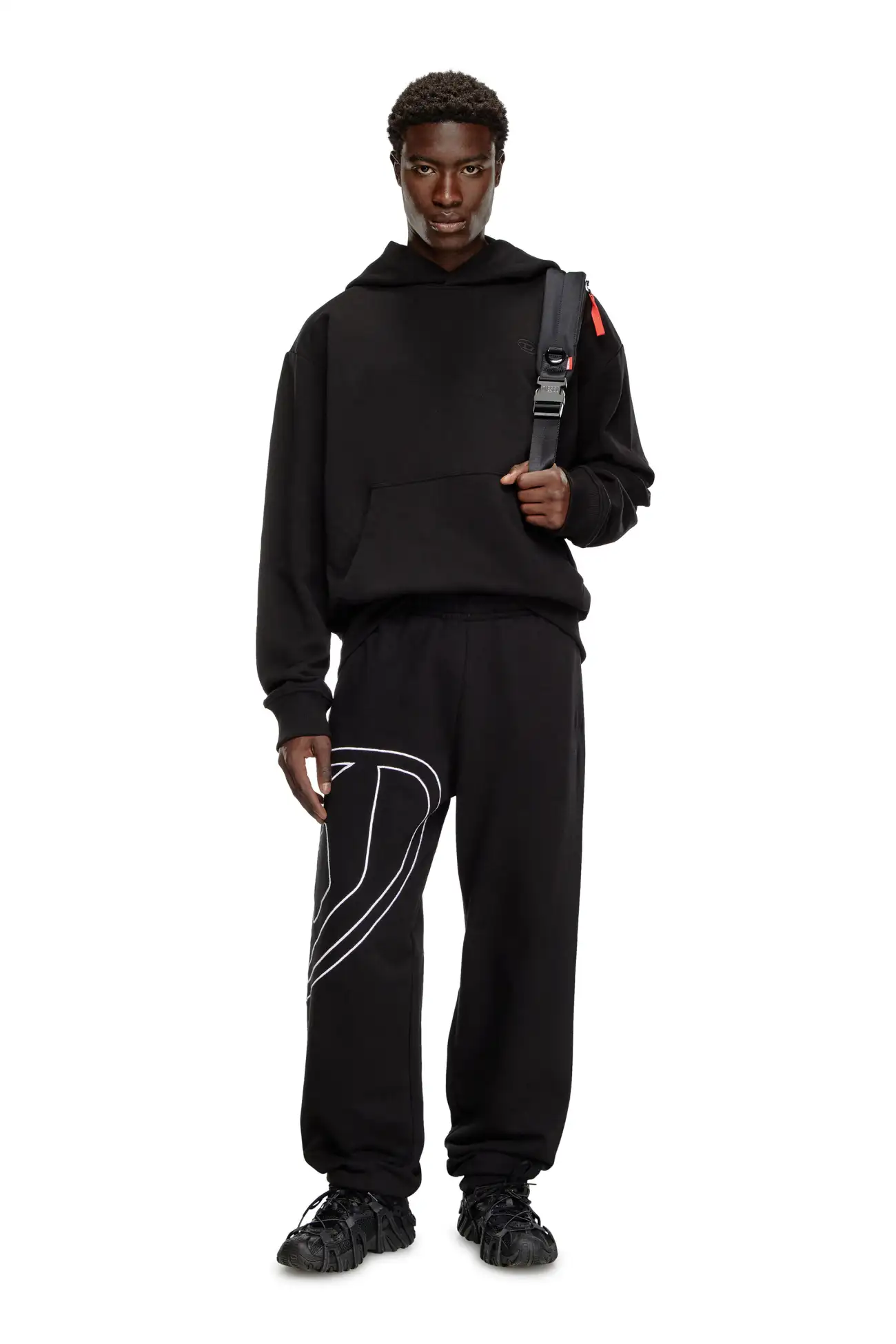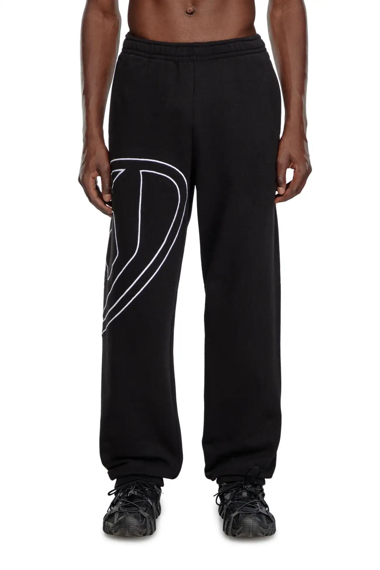 מכנסי טרנינג לגברים בצבע שחור, עשויים ג׳רזי כותנה רכה, בגזרה רגילה, רקמת קונטור גדולה של Oval D על הרגל בחוט בצבע ניגוד