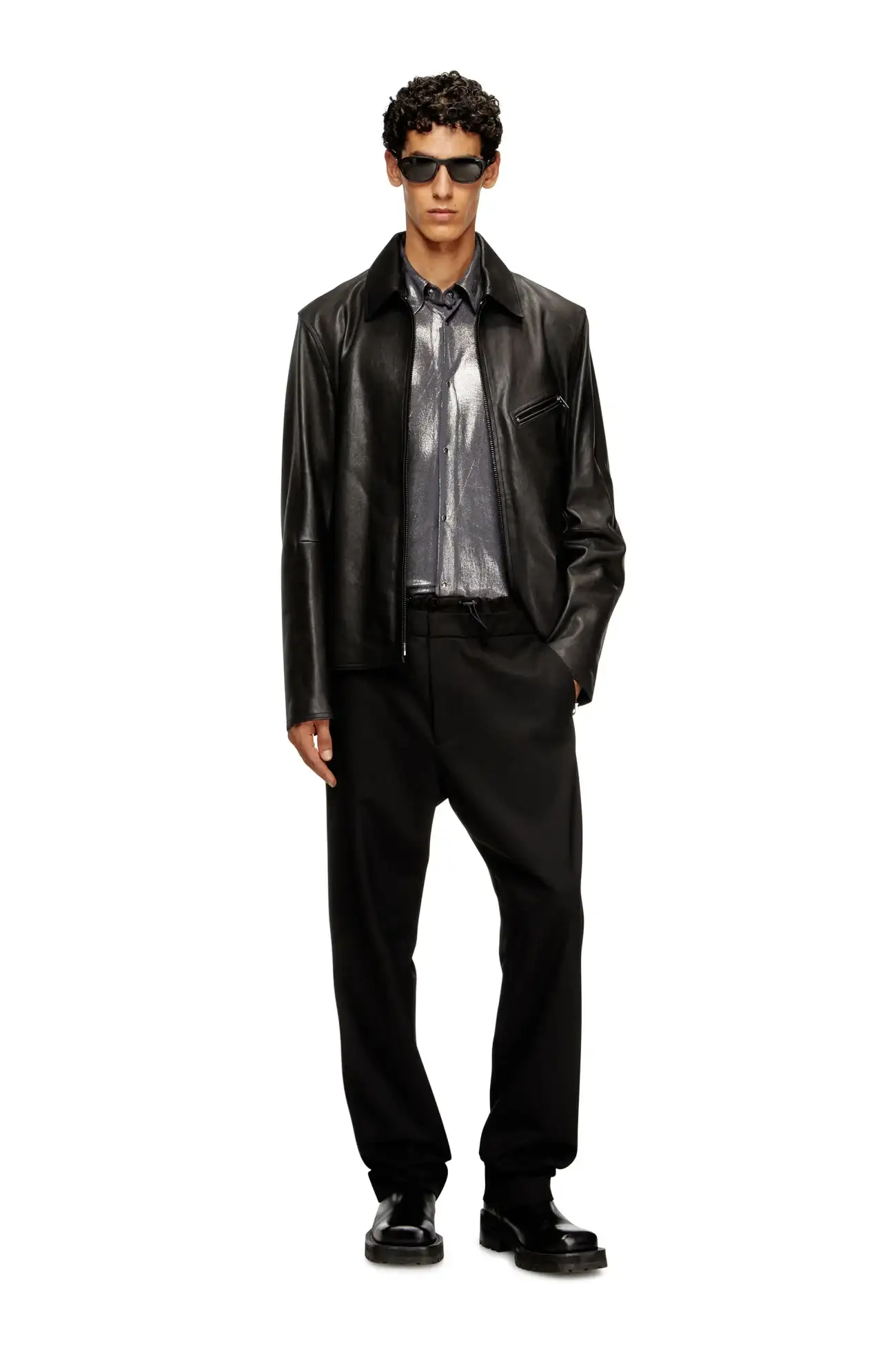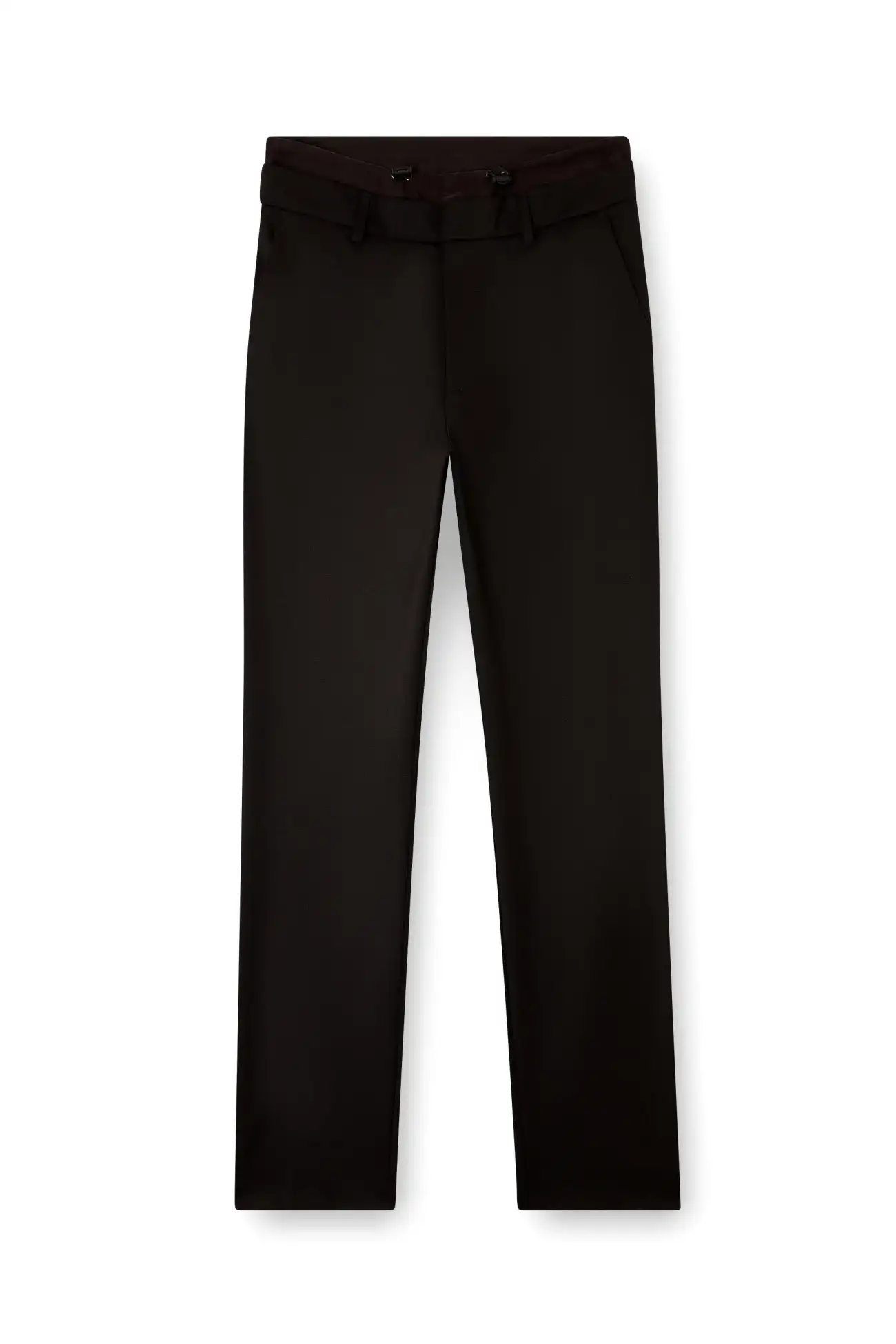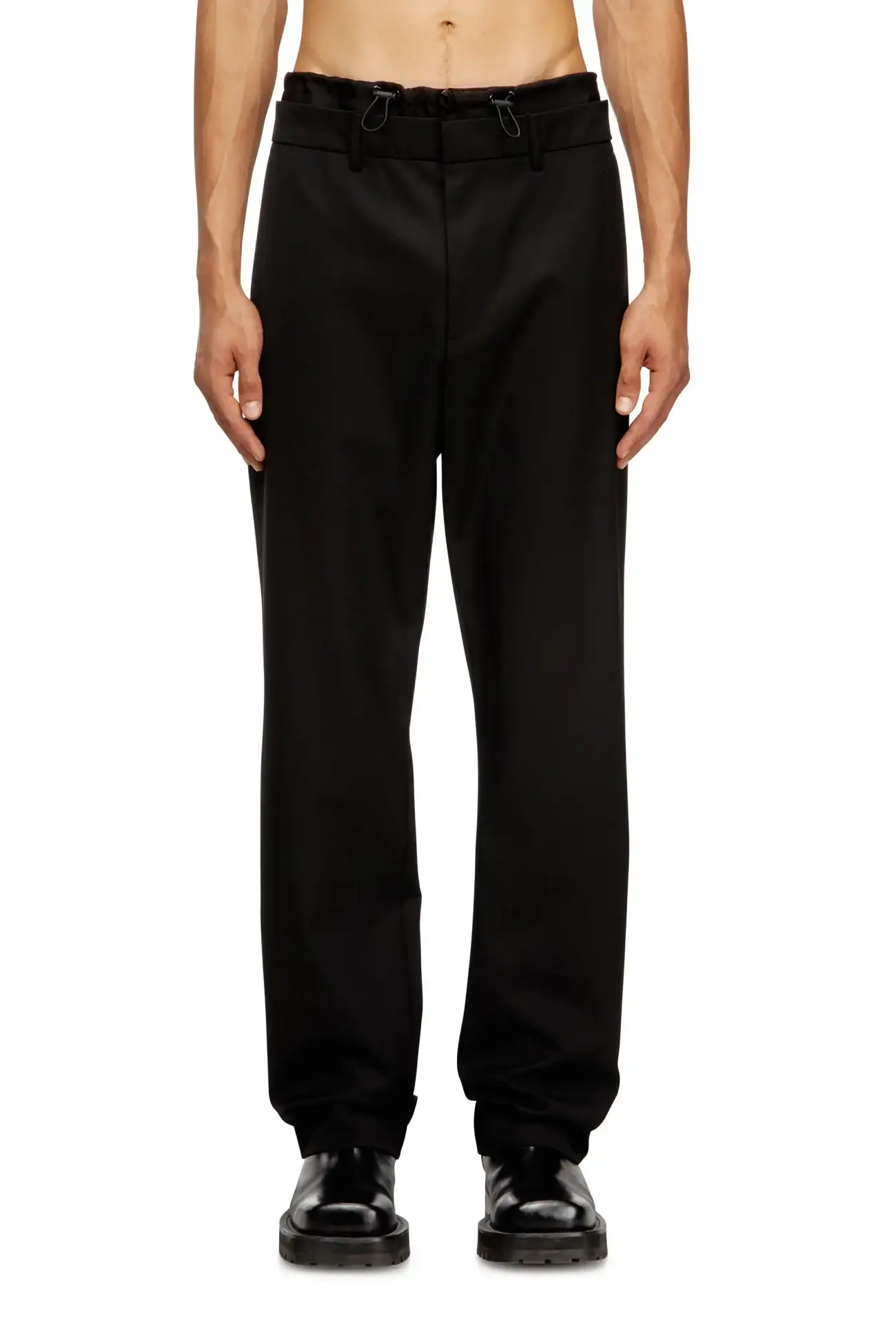 מכנסי צמר לגברים בגזרה רגילה בצבע שחור, חגורת מותן אלסטית עם חגורת ניילון ושרוך, כיסים קדמיים וכיסי פס מאחור, לוחית Oval D מתכת בגב