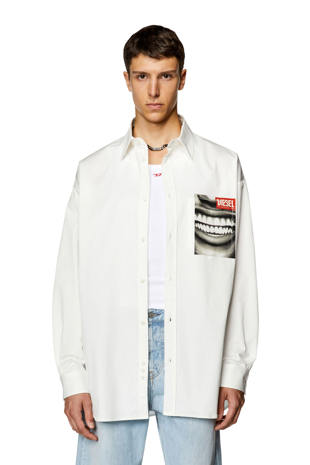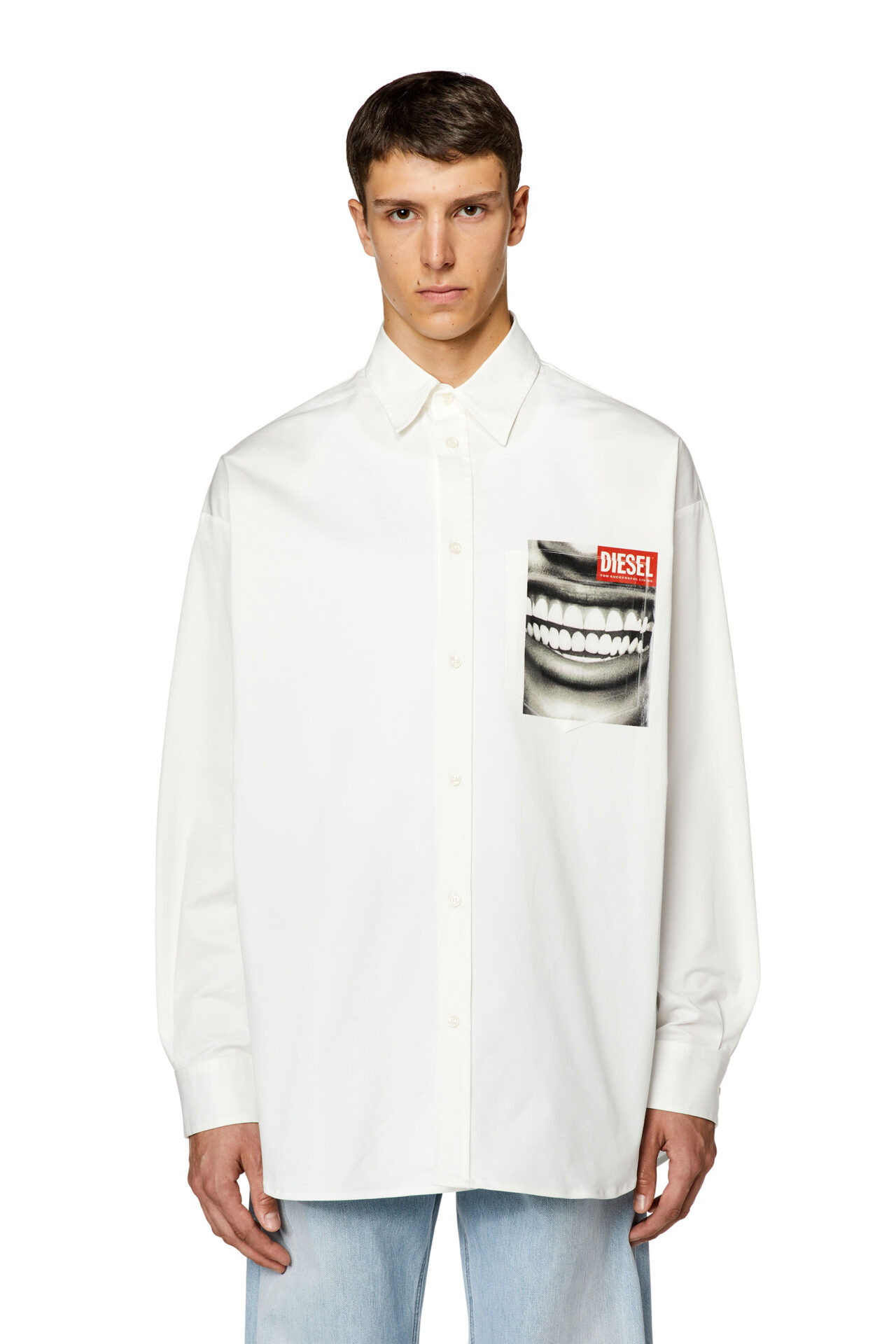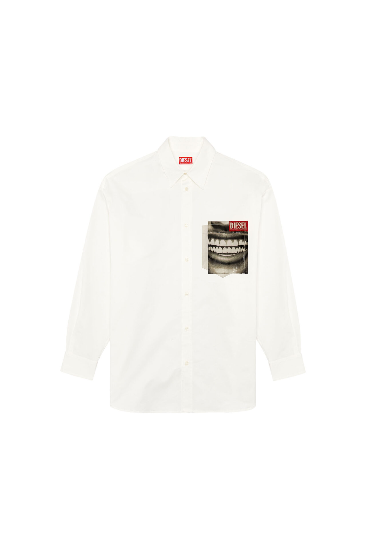 פריט מקולקציית המסלול של דיזל - חולצת כותנה מכופתרת ארוכה בצבע לבן עם הדפס של פה מחייך