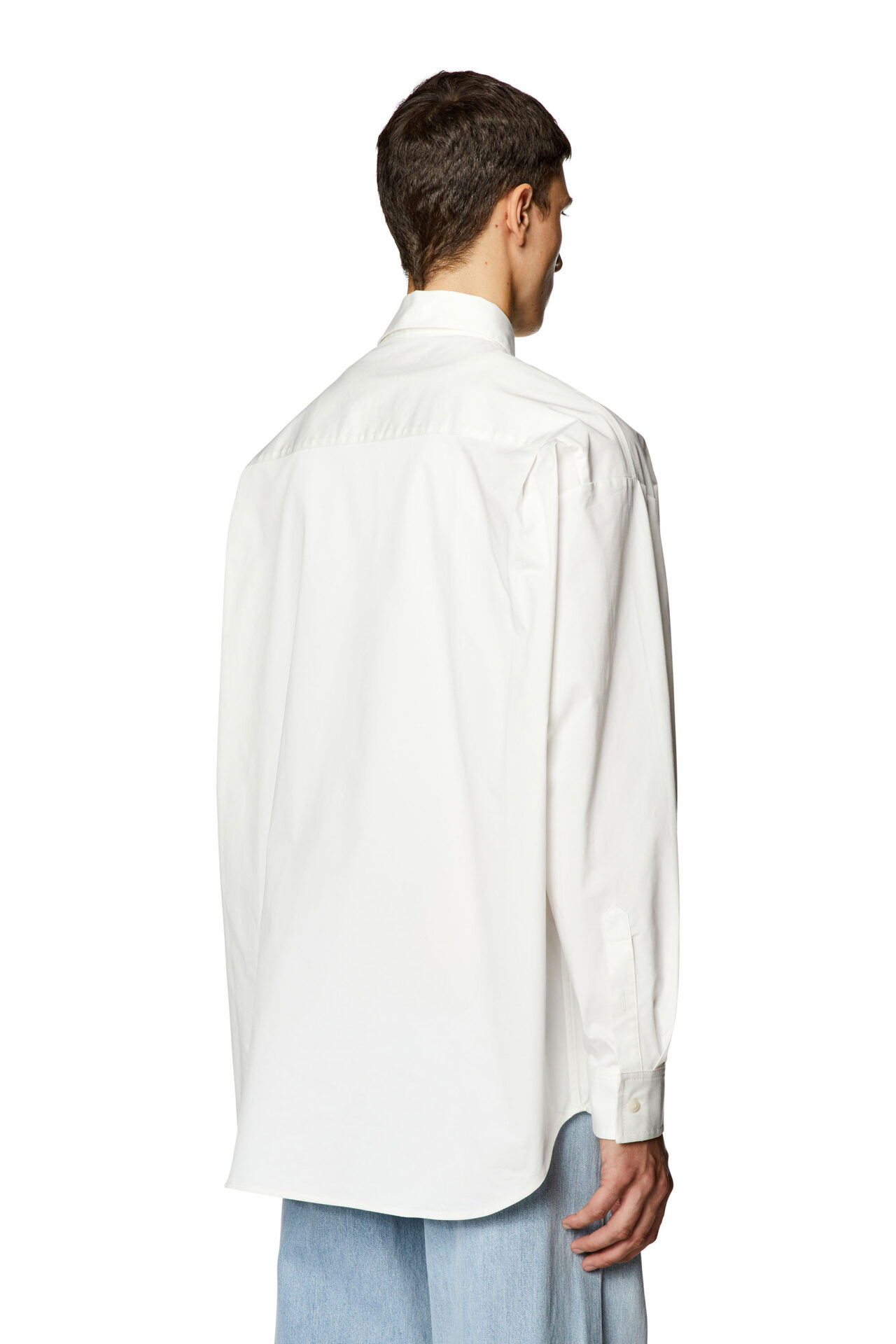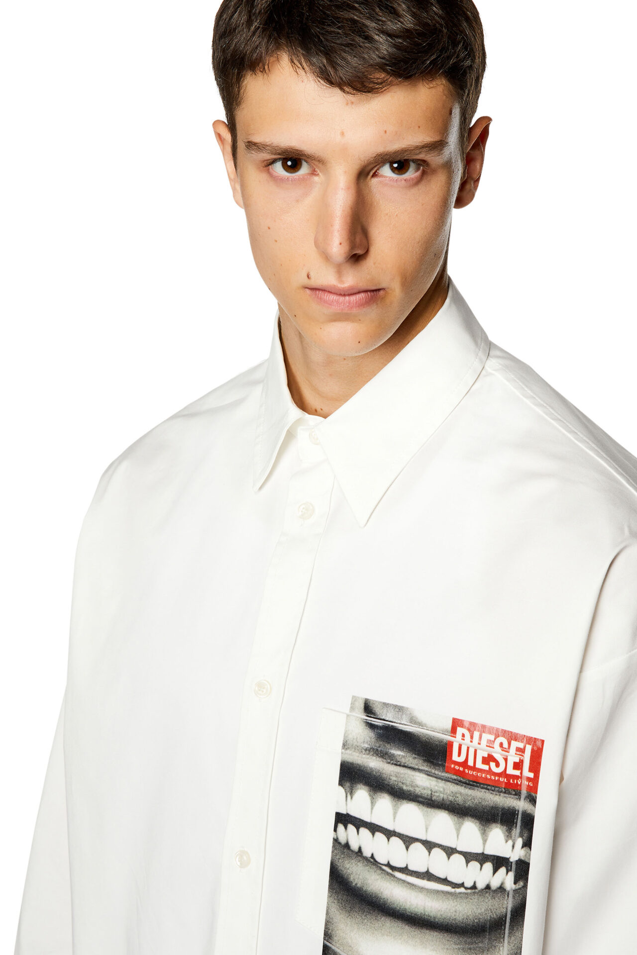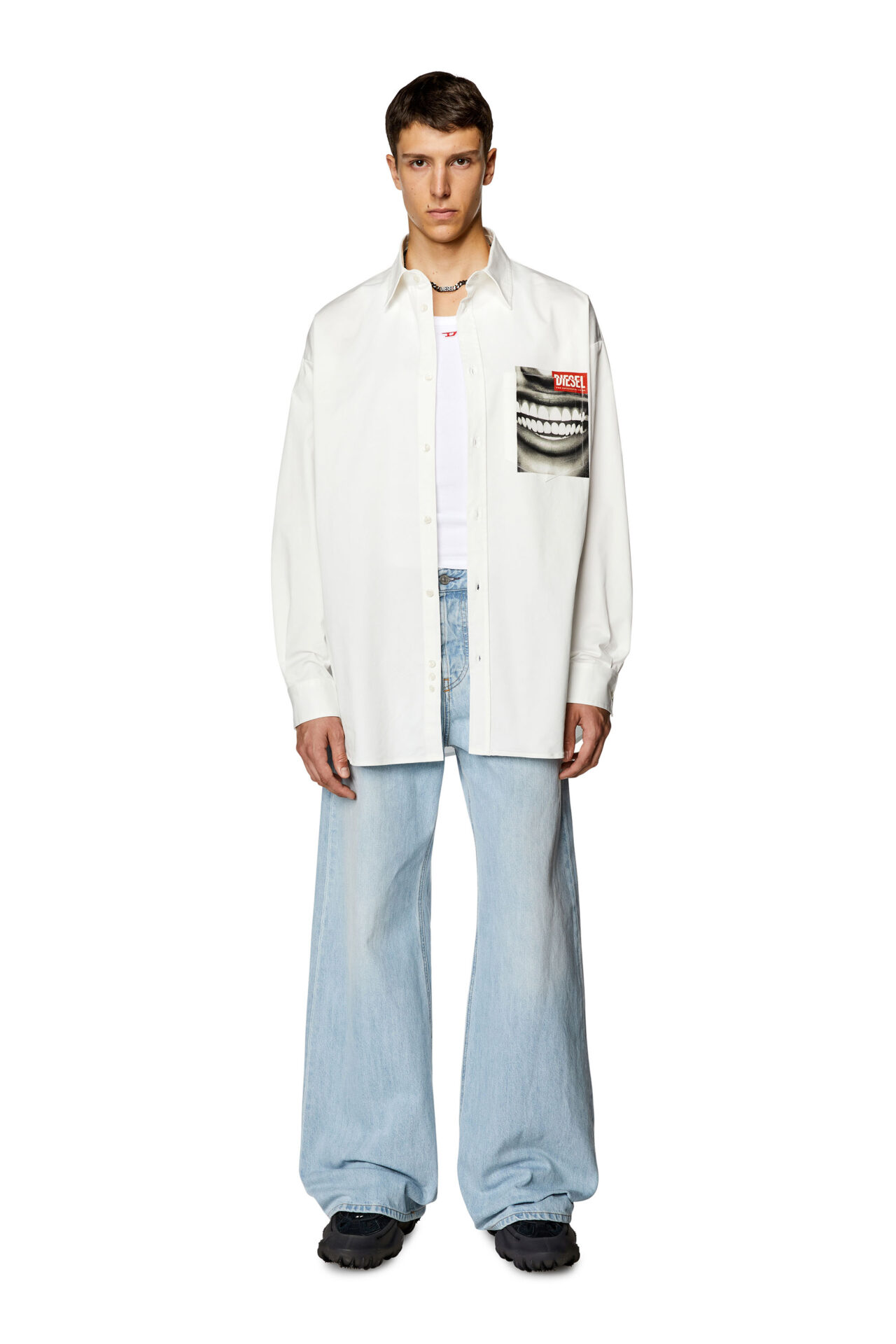 פריט מקולקציית המסלול של דיזל - חולצת כותנה מכופתרת ארוכה בצבע לבן עם הדפס של פה מחייך