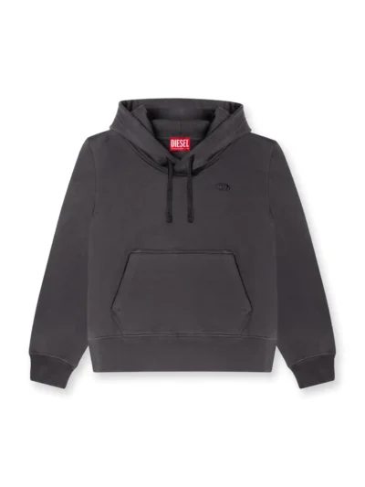 סווטשירט קפוצ'ון לגברים מכותנה אורגנית בצבע שחור, פאצ'ים צילום בגזירה גולמית עם לוגואים של דיזל