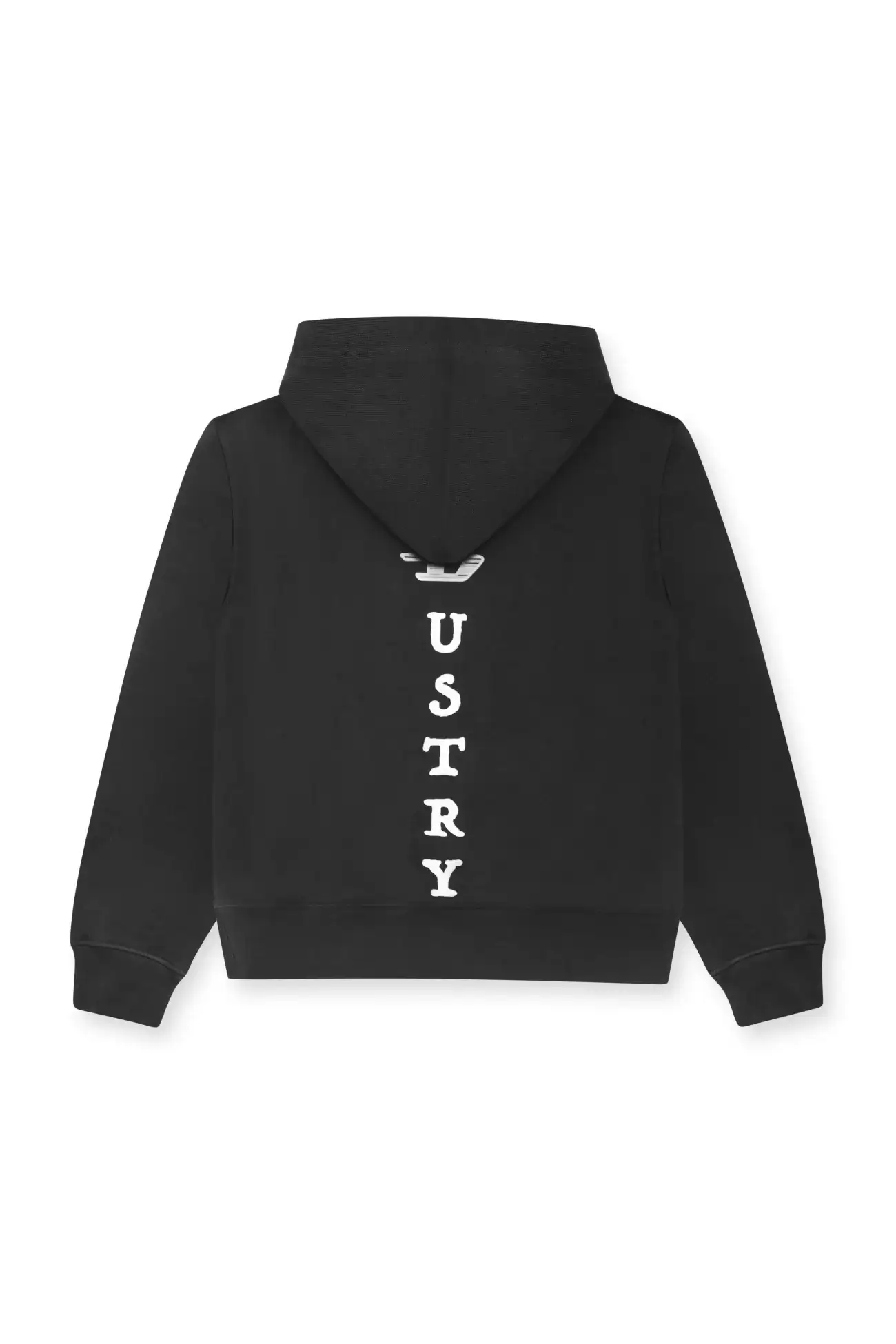 סווטשרט שחור עם הדפס לוגו אנכי מאויר על הגב, רקמת לוגו קטנה בצד החזה, כובע קפוצ׳ון וכיס קדמי