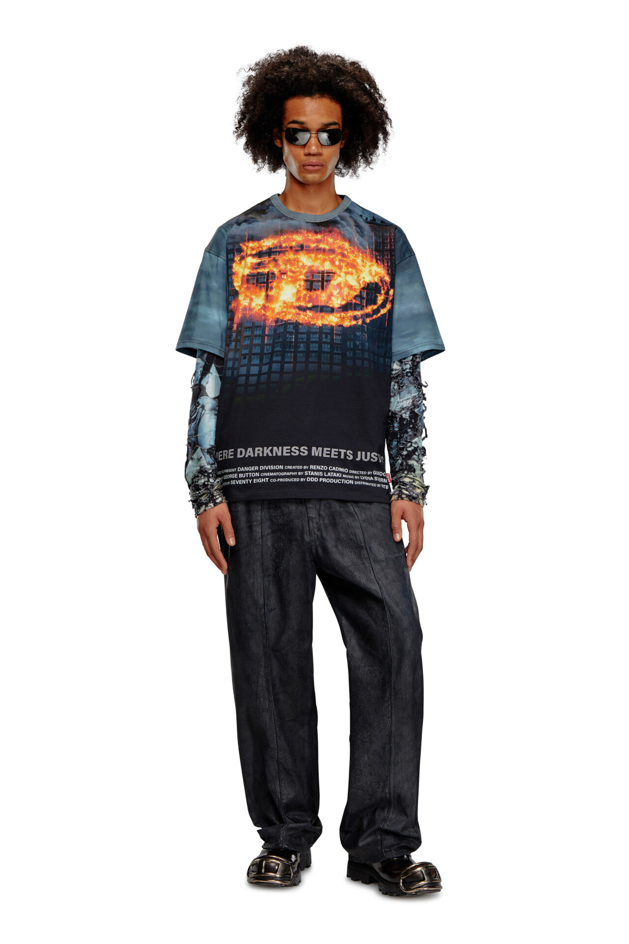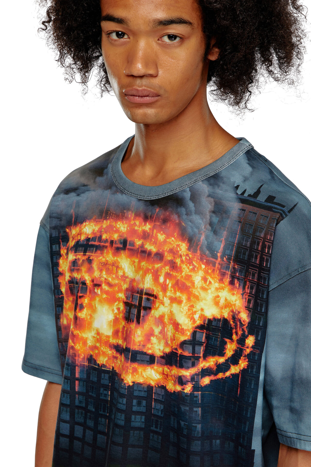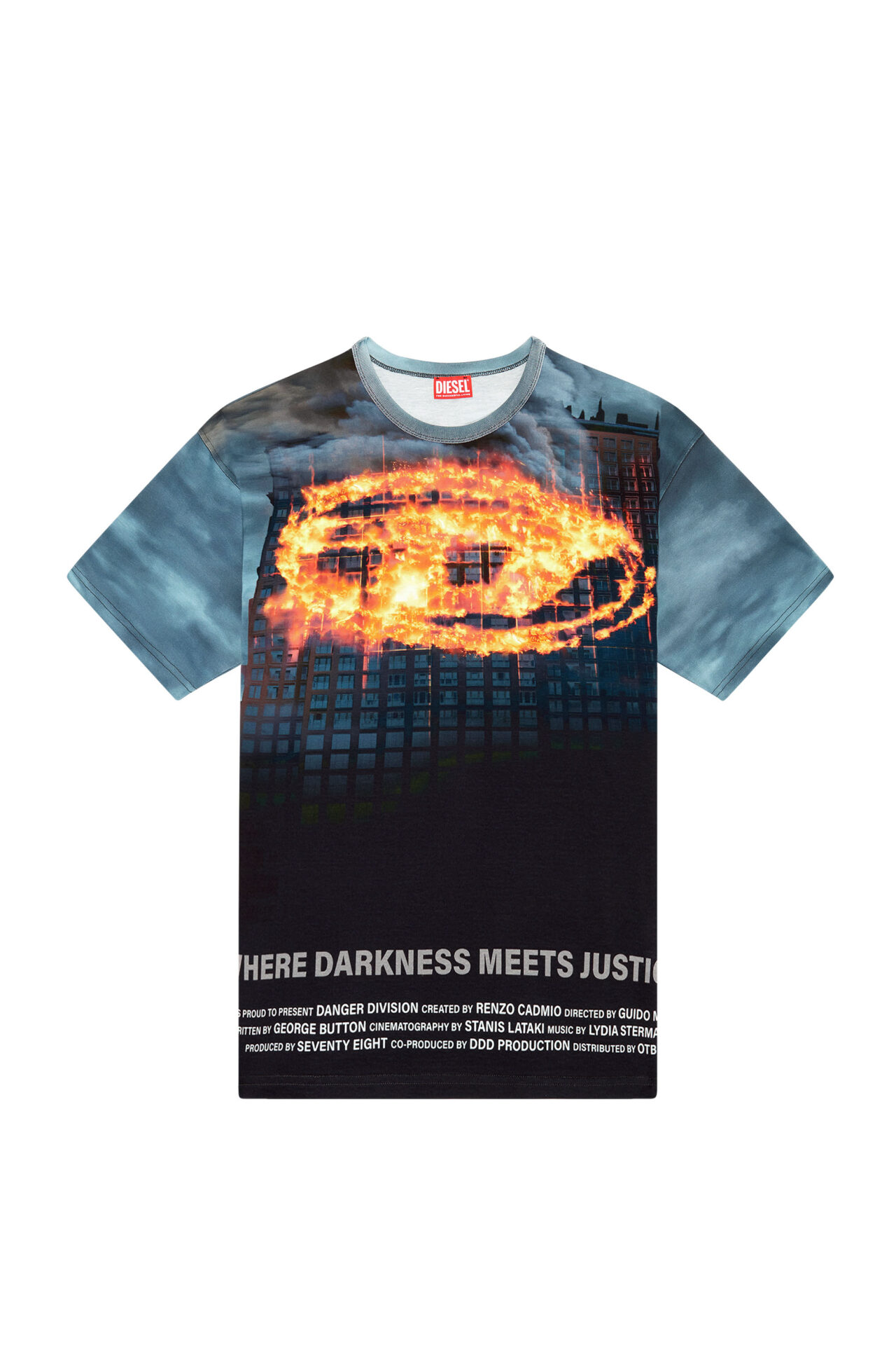 Cut from vintage-effect cotton jersey, this men's regular-fit tee flaunts one of the many Diesel film posters showcased in the Fall Winter 2024 Runway Show. This one features a burning building against a cloudy sky, ablaze with the iconic Oval D logo. Complete with the tagline 'Where Darkness Meets Justice' at the bottom.