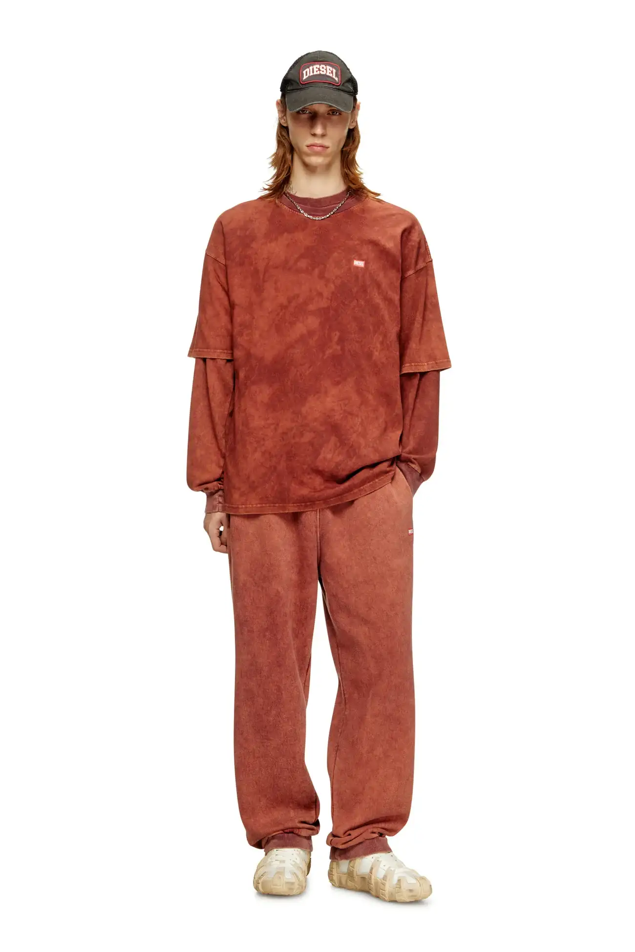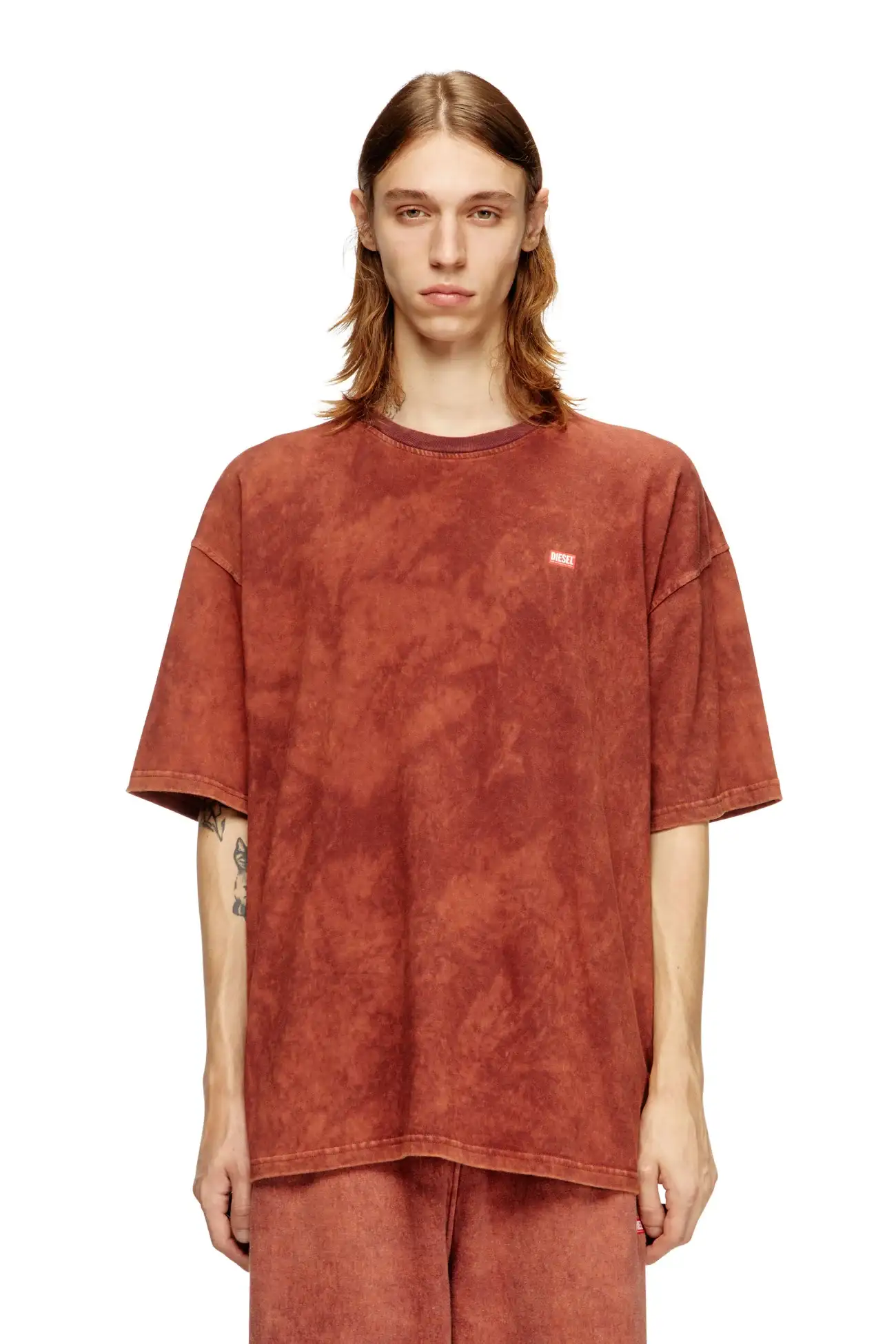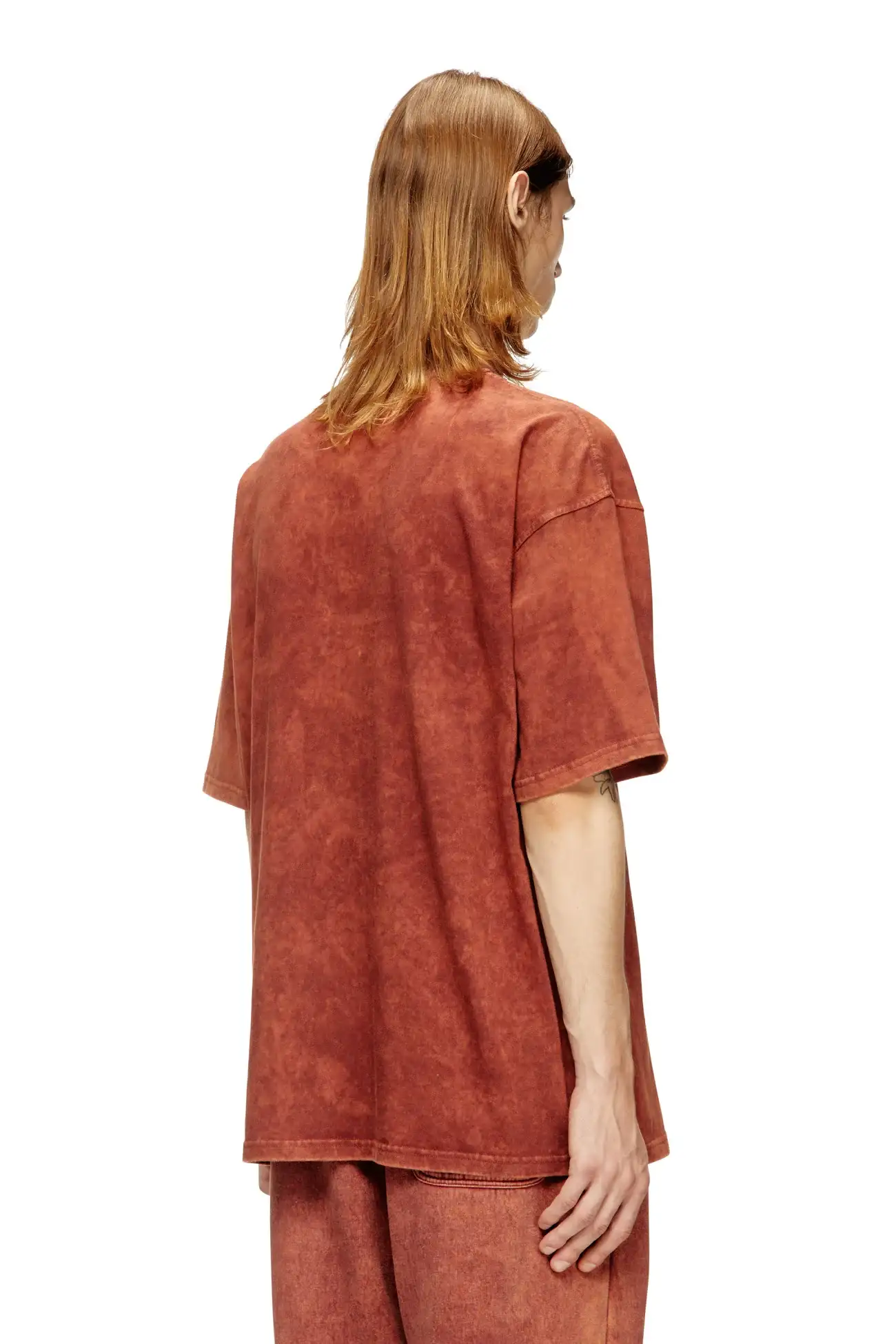 טישרט צוואר עגול שרוול קצר בגזרה משוחררת מבד ג׳רזי ואניזה בצבע חום, צביעת חומצה אקראית ליצירת מראה משופשף, לוגו בצד שמאל של החזה