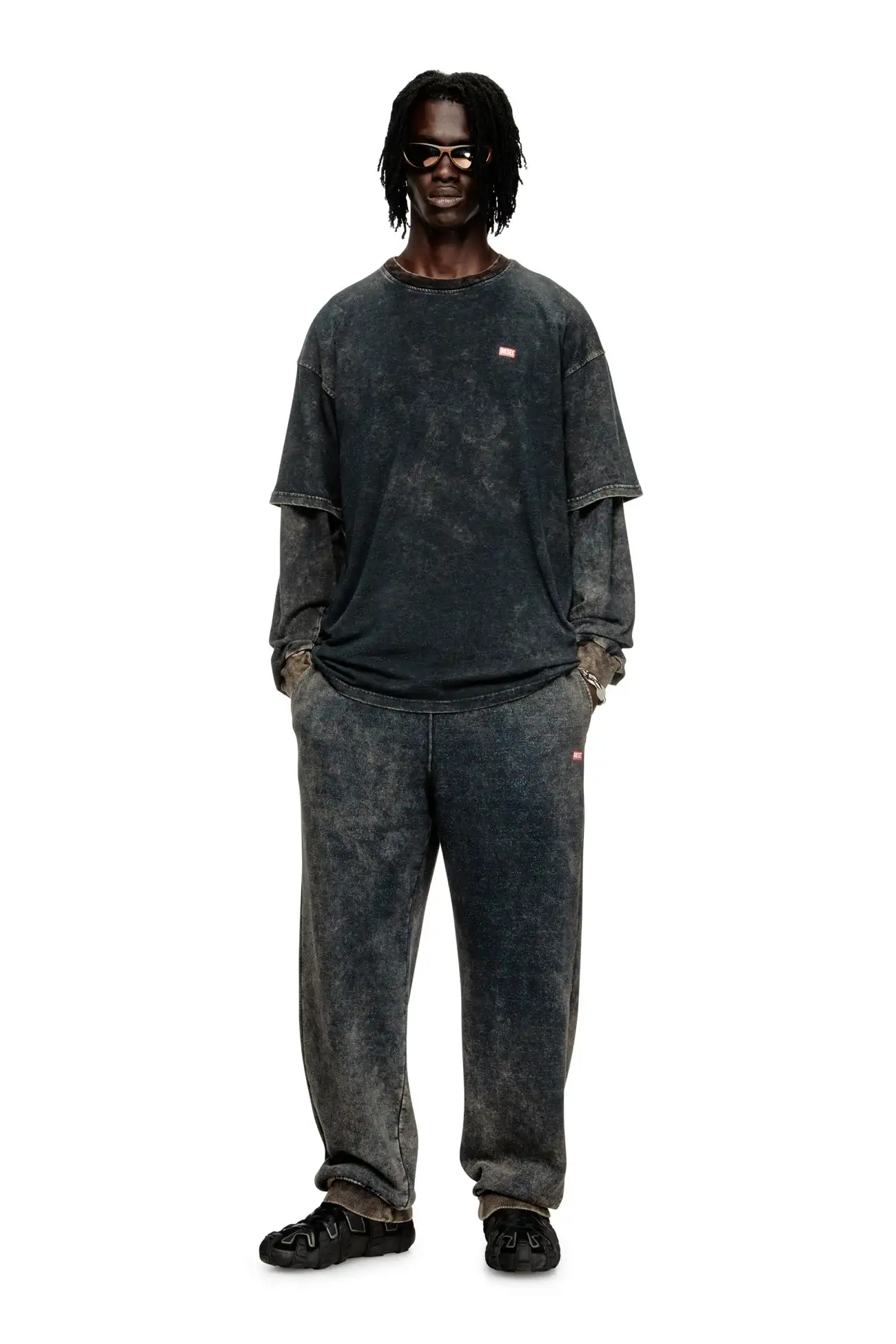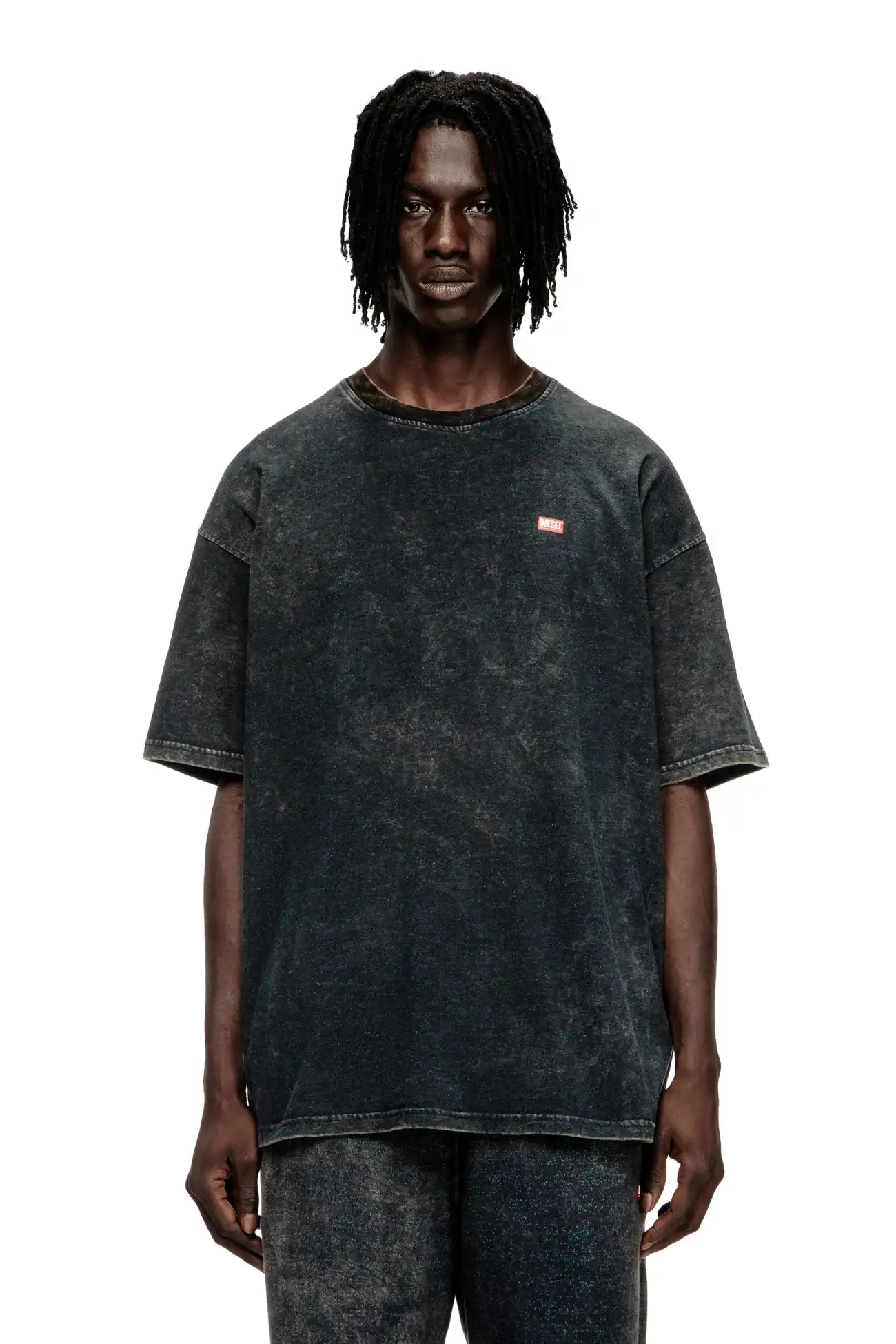 טישרט צוואר עגול שרוול קצר בגזרה משוחררת מבד ג׳רזי ואניזה בצבע שחור, צביעת חומצה אקראית ליצירת מראה משופשף, לוגו בצד שמאל של החזה