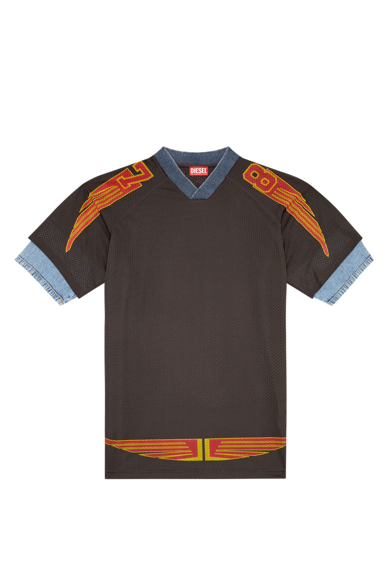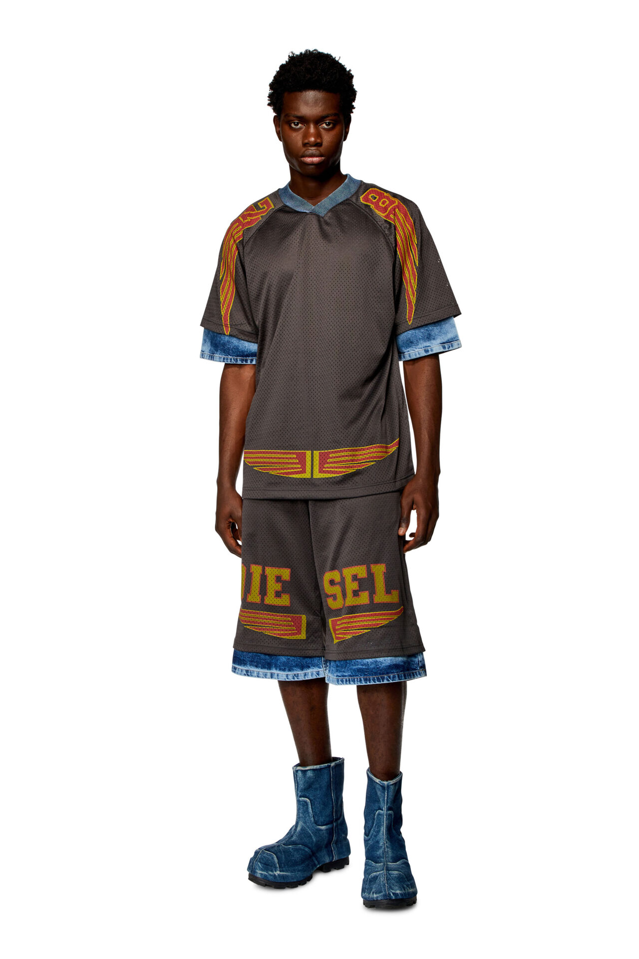 This men's T-shirt flaunts a relaxed silhouette that layers loose grey basketball mesh and contrast cotton jersey. Graphic prints take cues from '80s retro-collegiate styles, while the faded indigo ribbed V-neck and cuffs pay homage to Diesel's DNA fabric – denim.