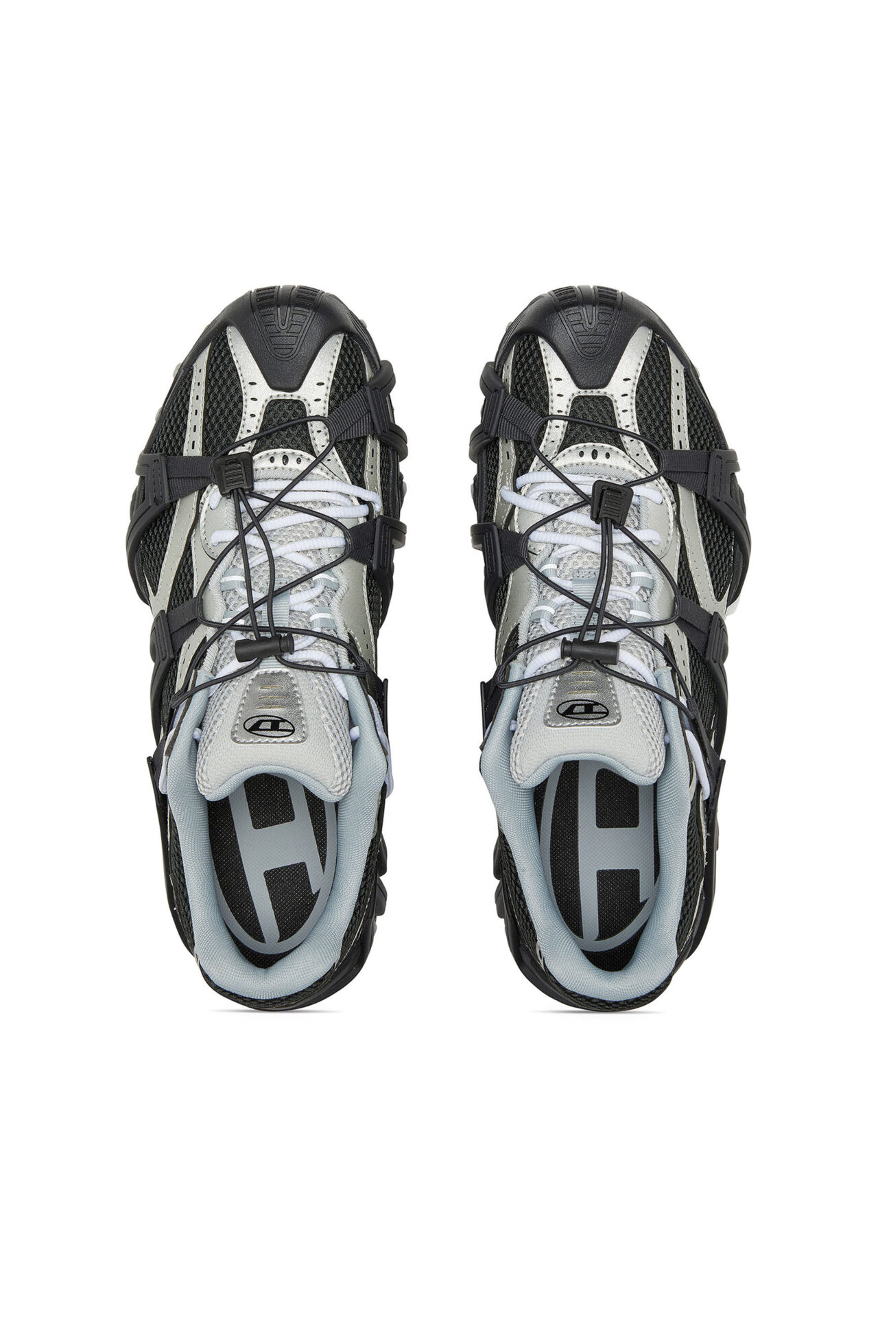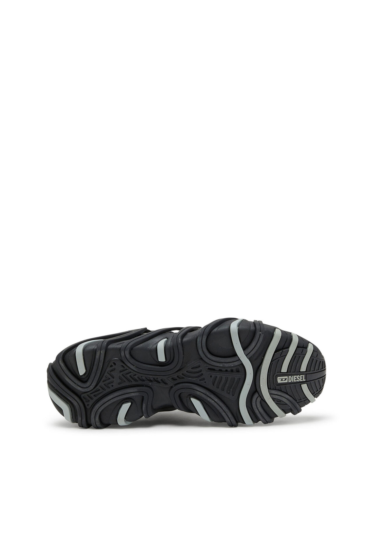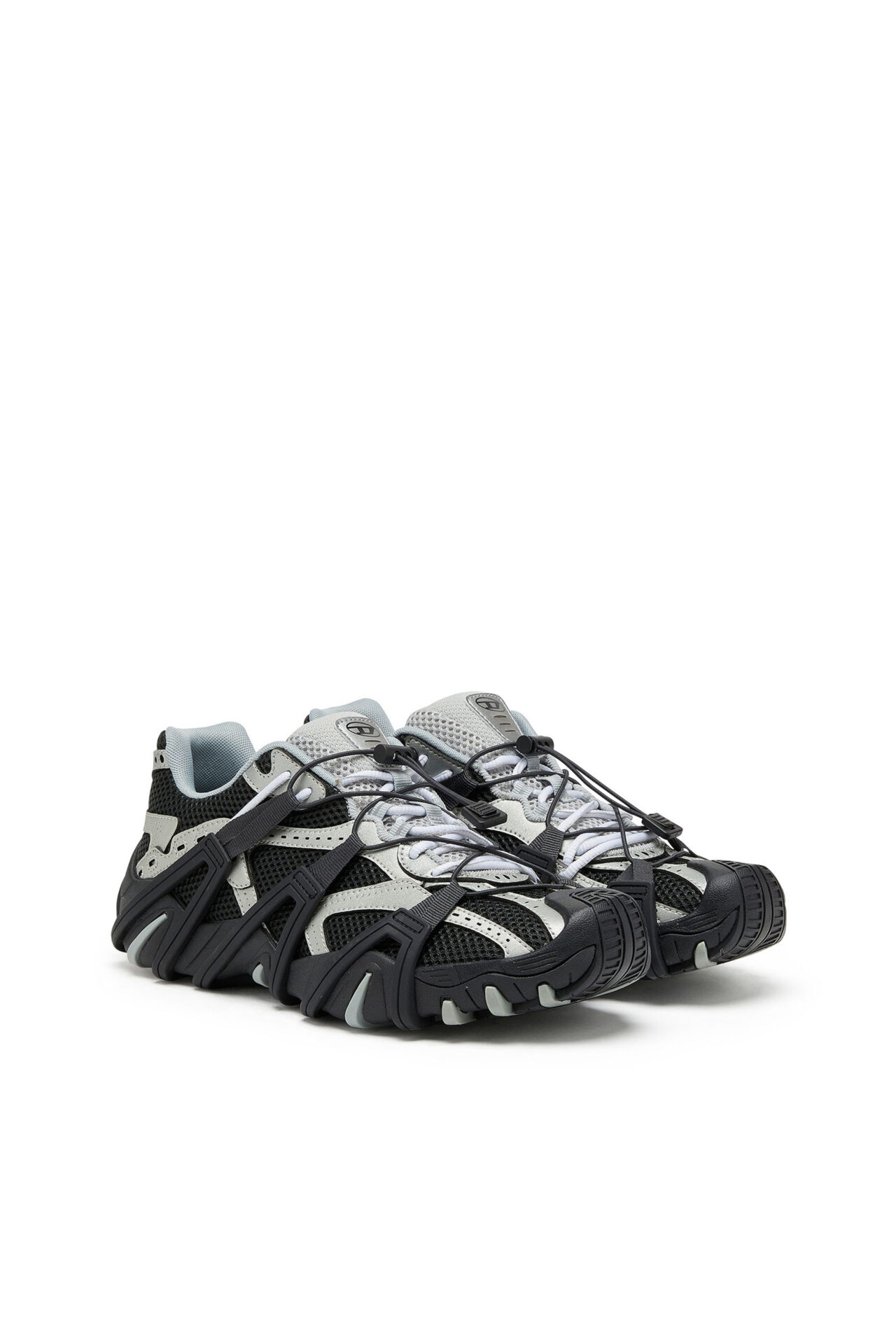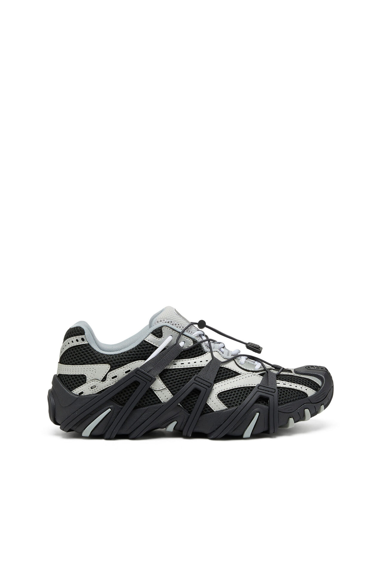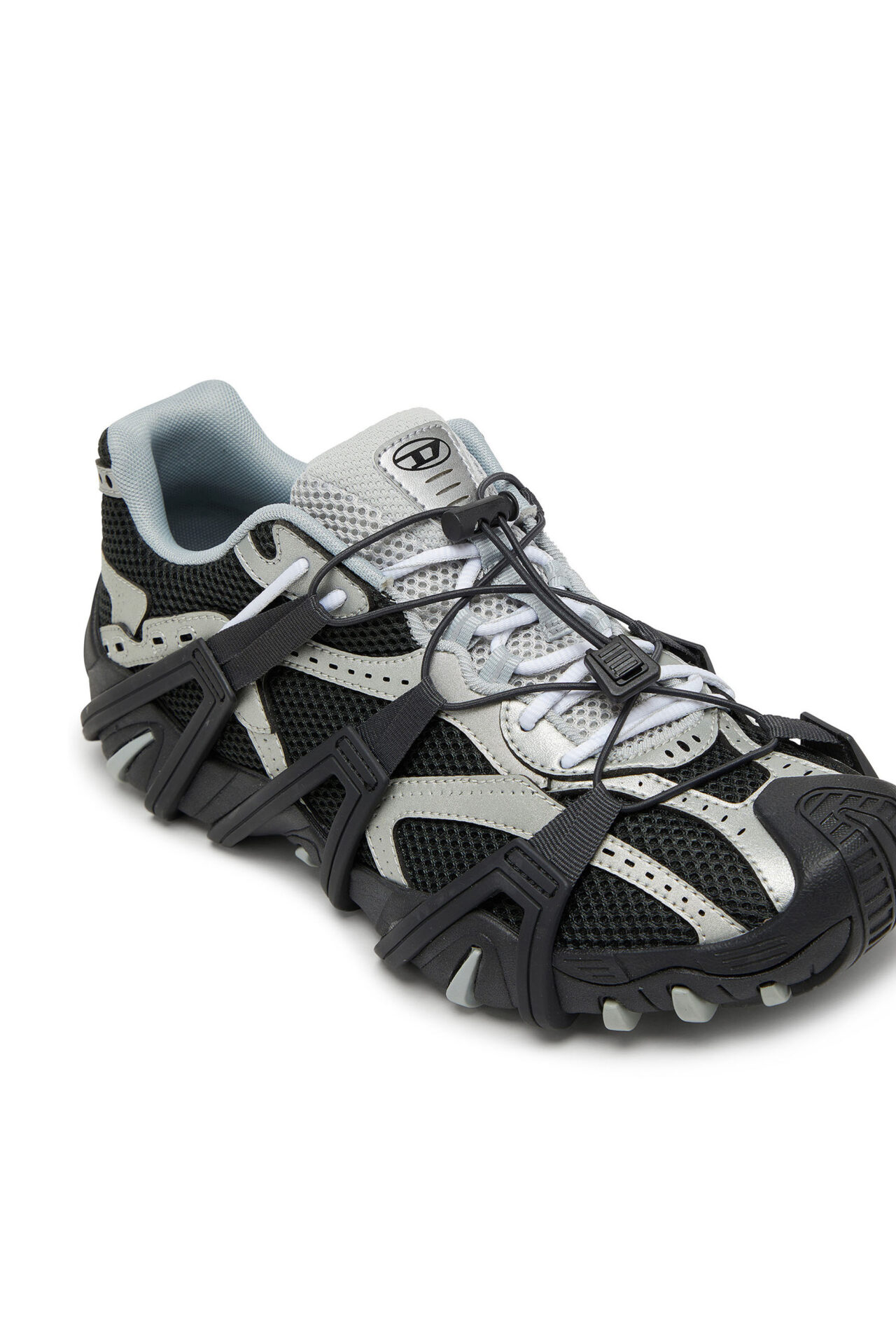 These men's futuristic sneakers sport a chunky industrial sole with plenty of character. Engineered with unique rubber ‘teeth’ ripped from archival designs, the sole wraps over the toe and climbs up the sides forming a cage. The shoes are built from breathable mesh with slender PU overlays and fasten with a dual classic and speed lacing system for a versatile and supportive fit.