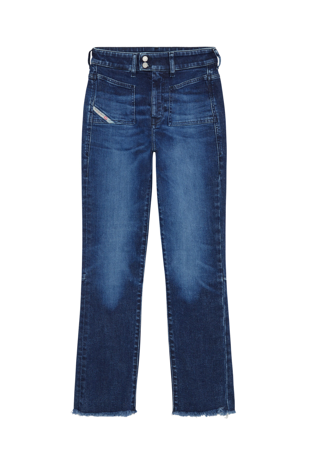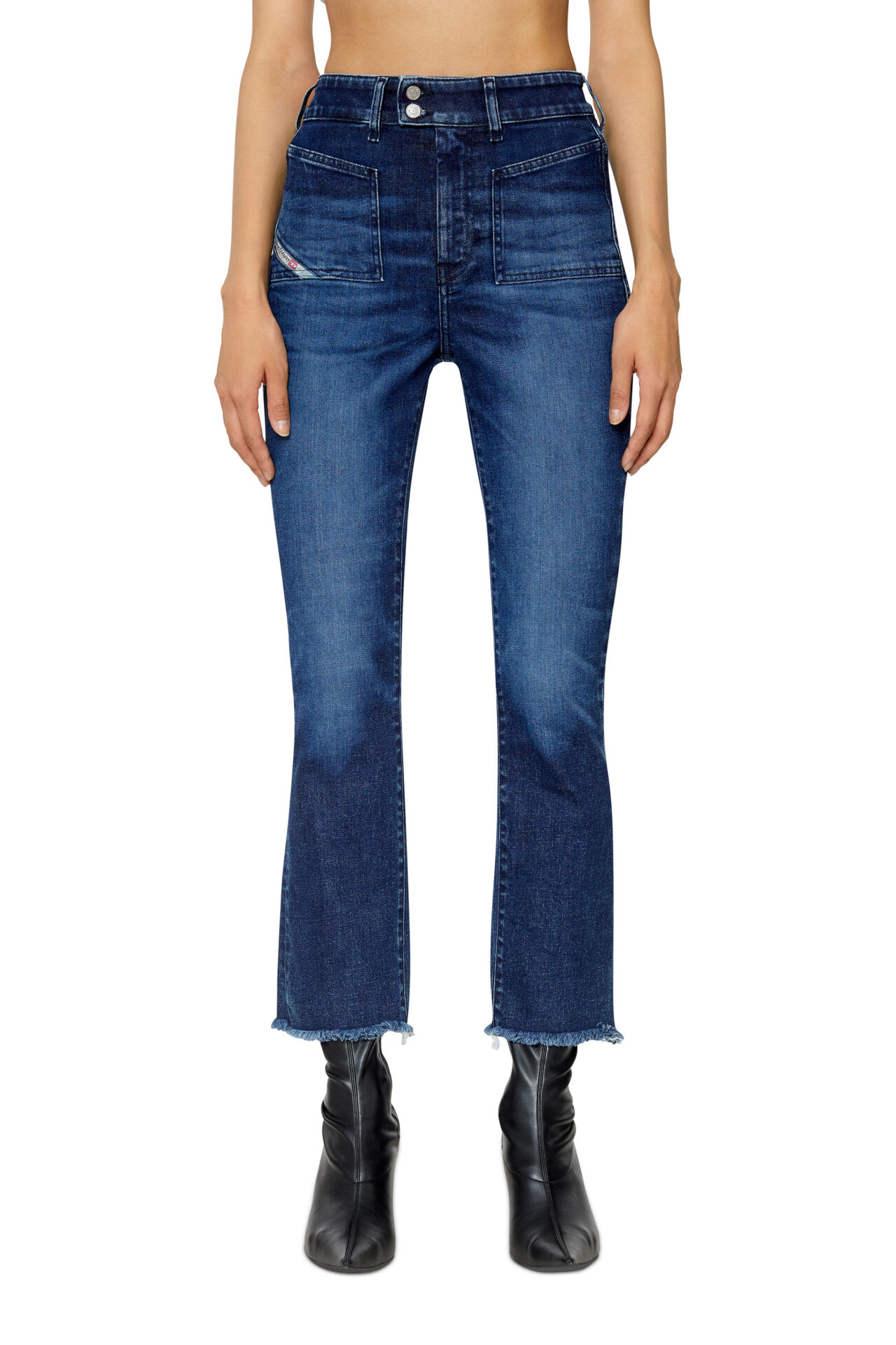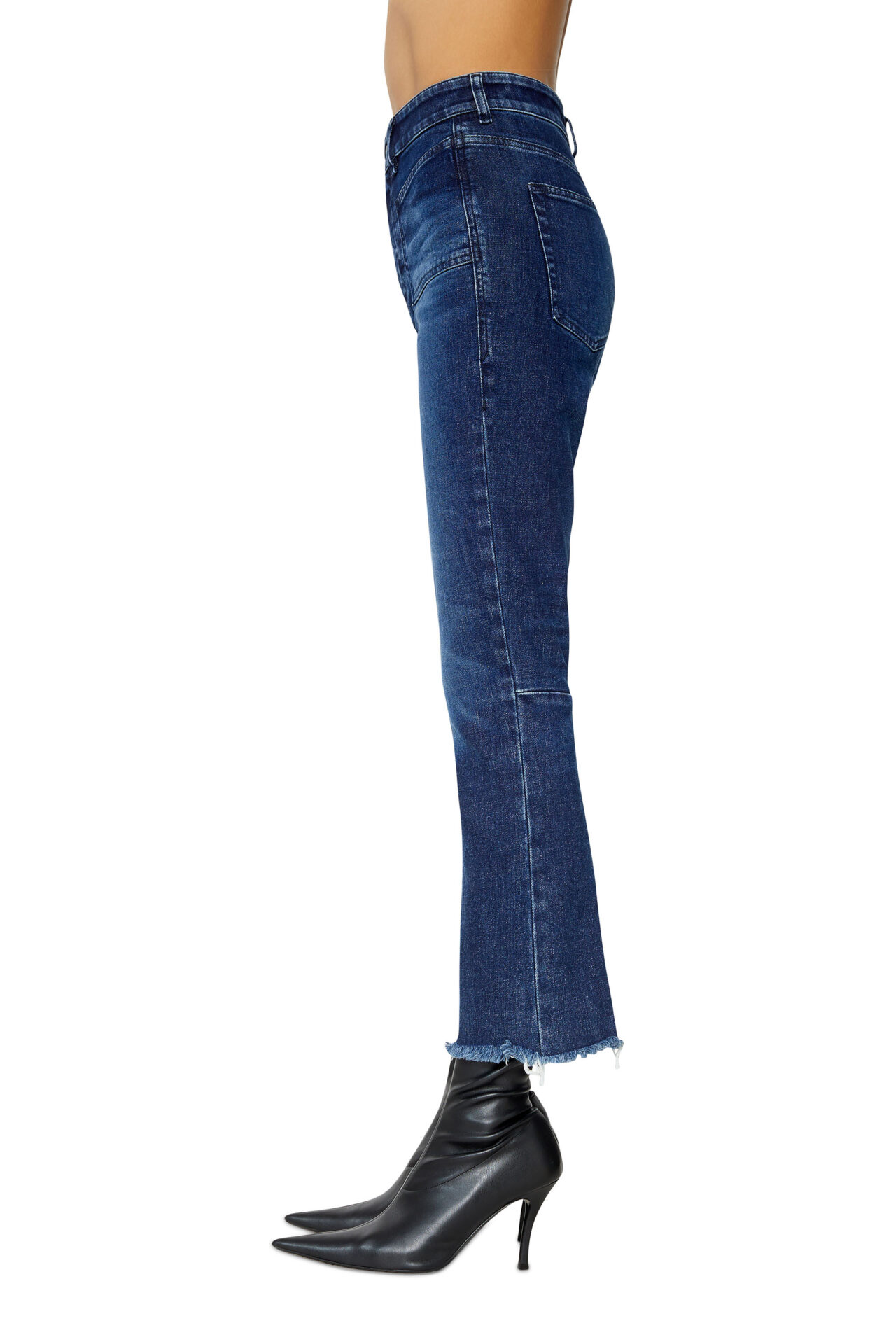 ג׳ינס כחול כהה בגזרה גבוהה, צמוד בירכיים ומתרחב מהברכיים ומטה, באורך קרופ עם קצוות פרומים