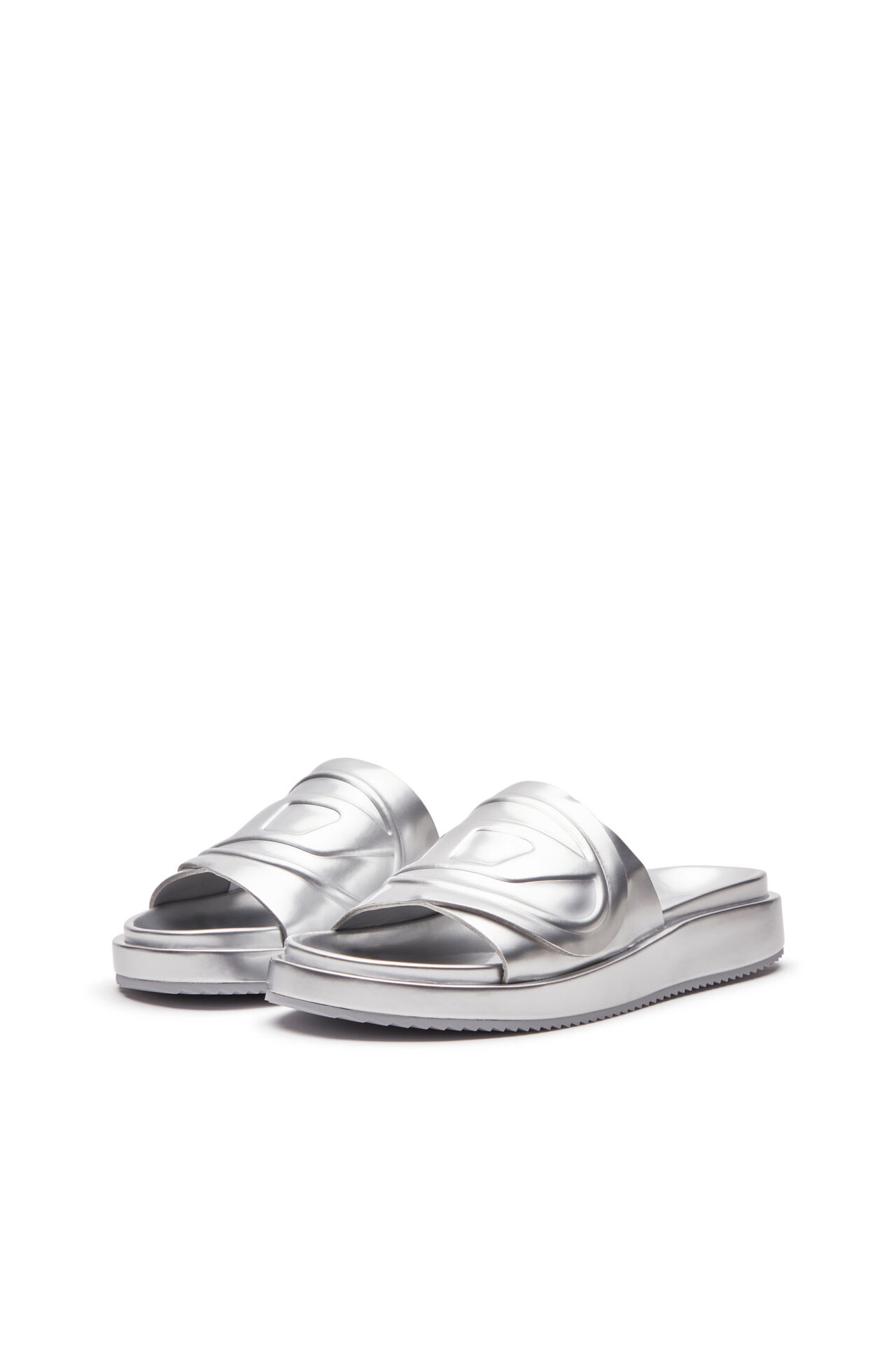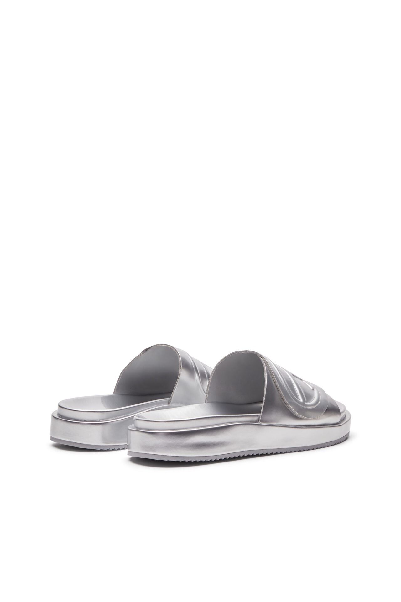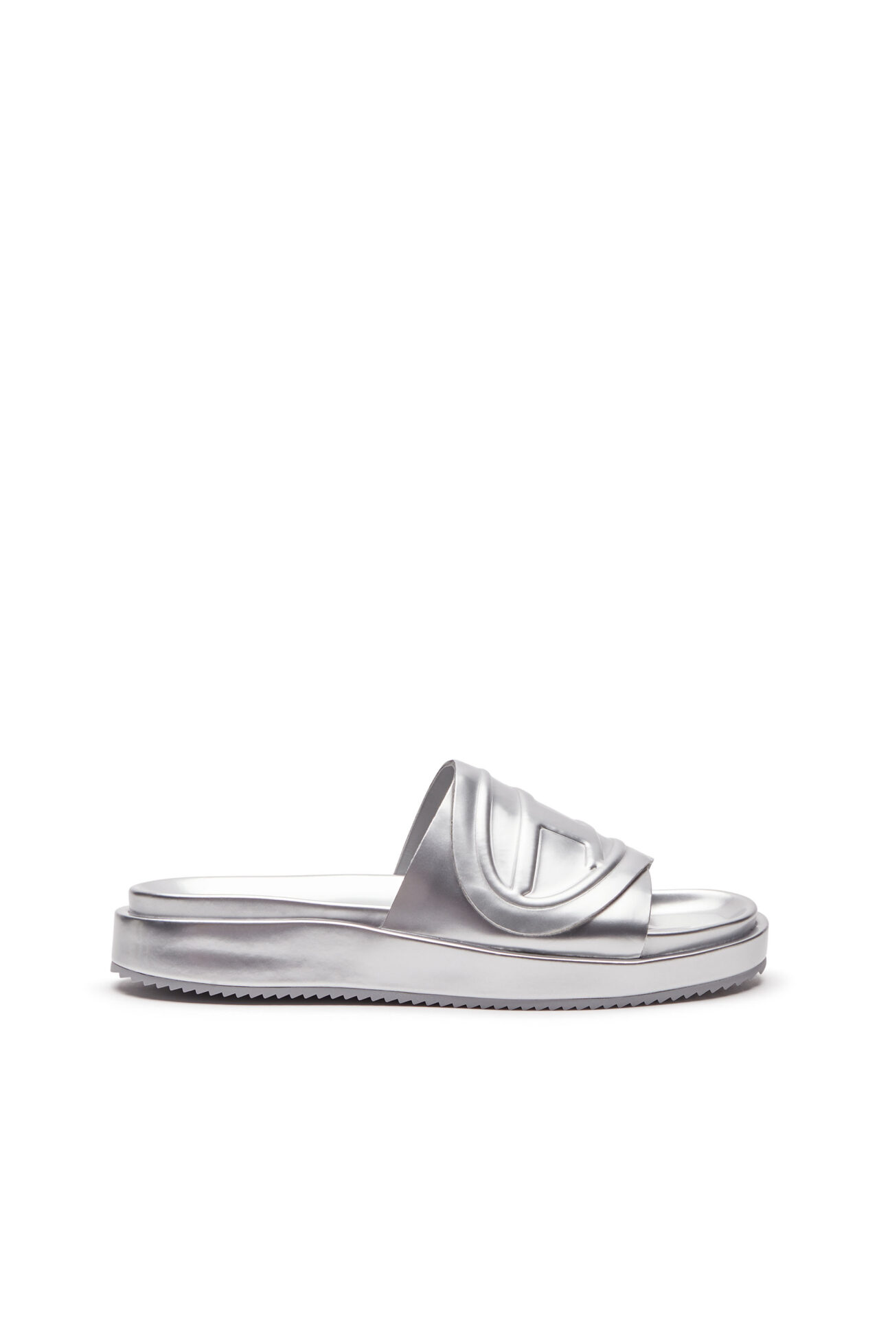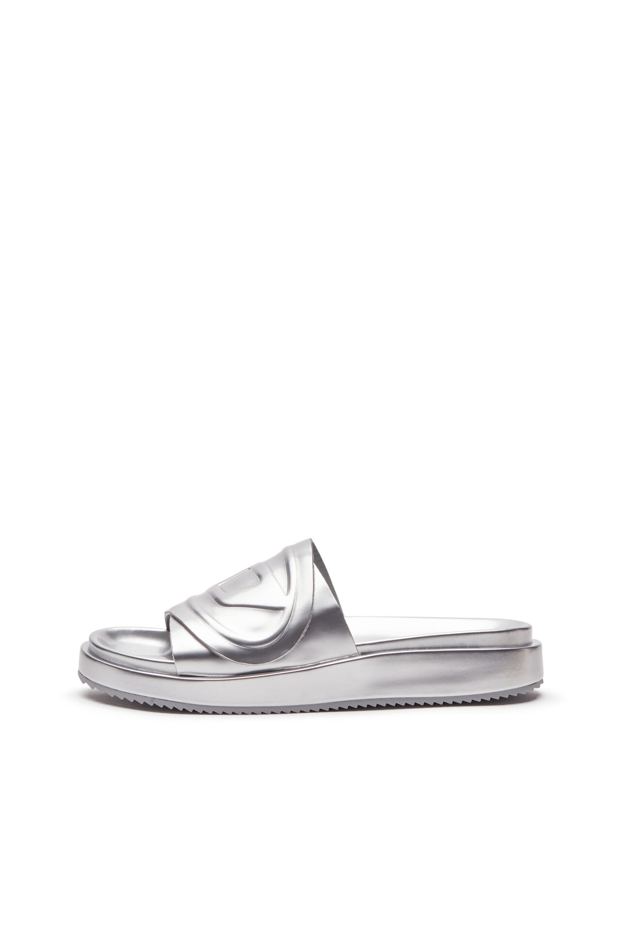 כפכפי סלייד מטאליים כסופים עם רצועה עבה ועליה לוגו D אליפטי