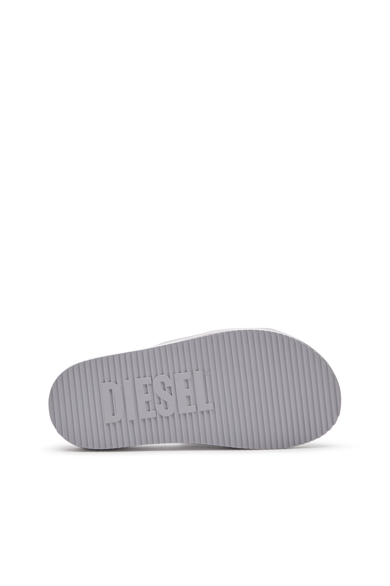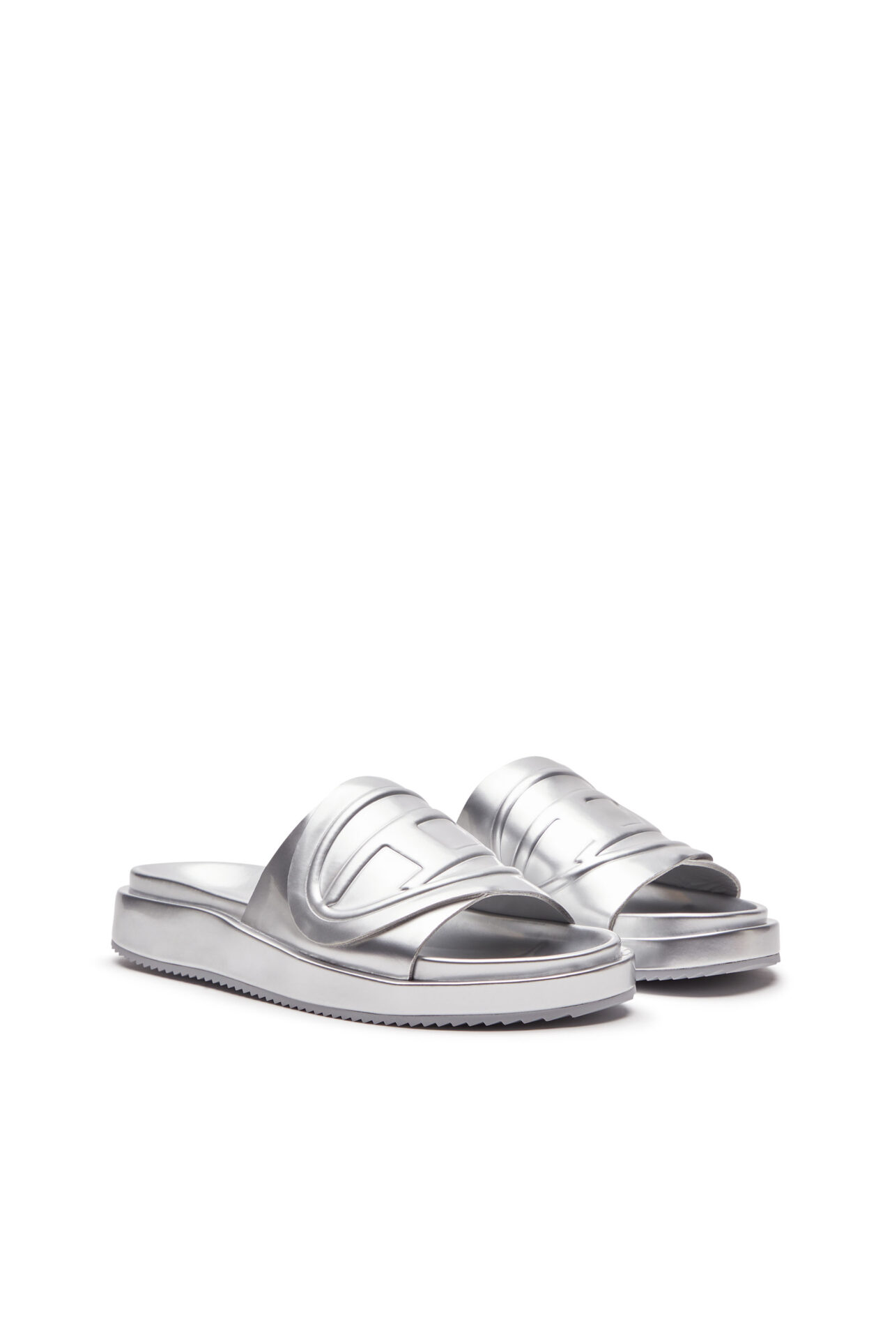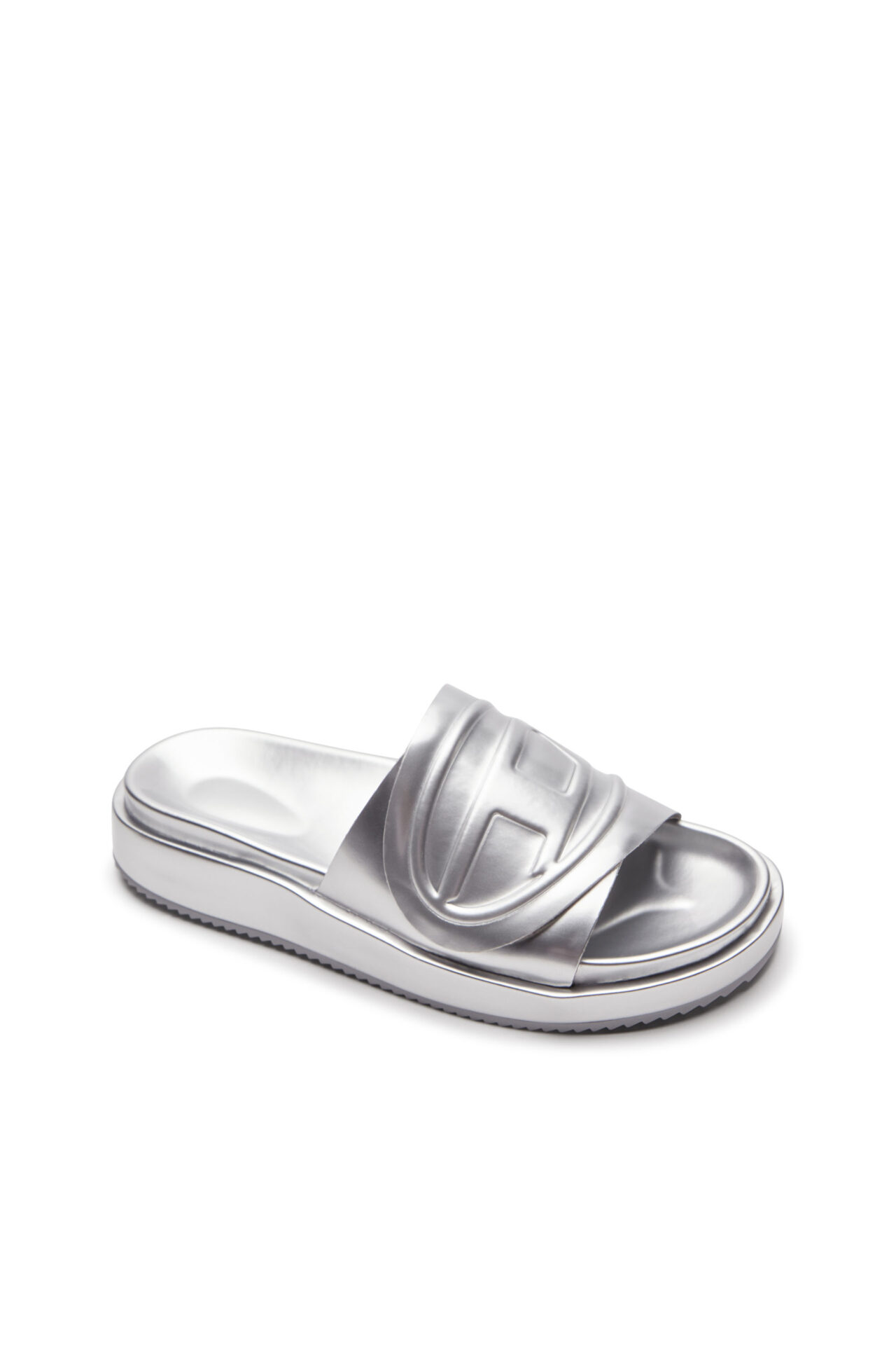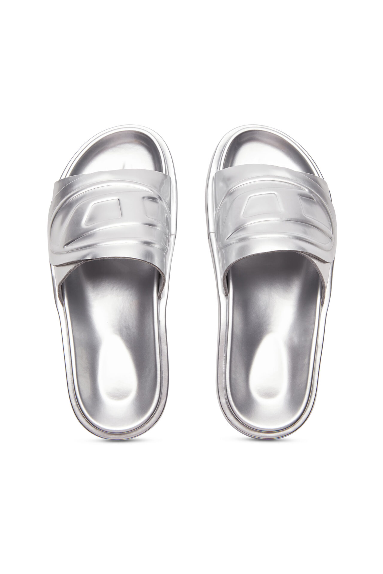 כפכפי סלייד מטאליים כסופים עם רצועה עבה ועליה לוגו D אליפטי