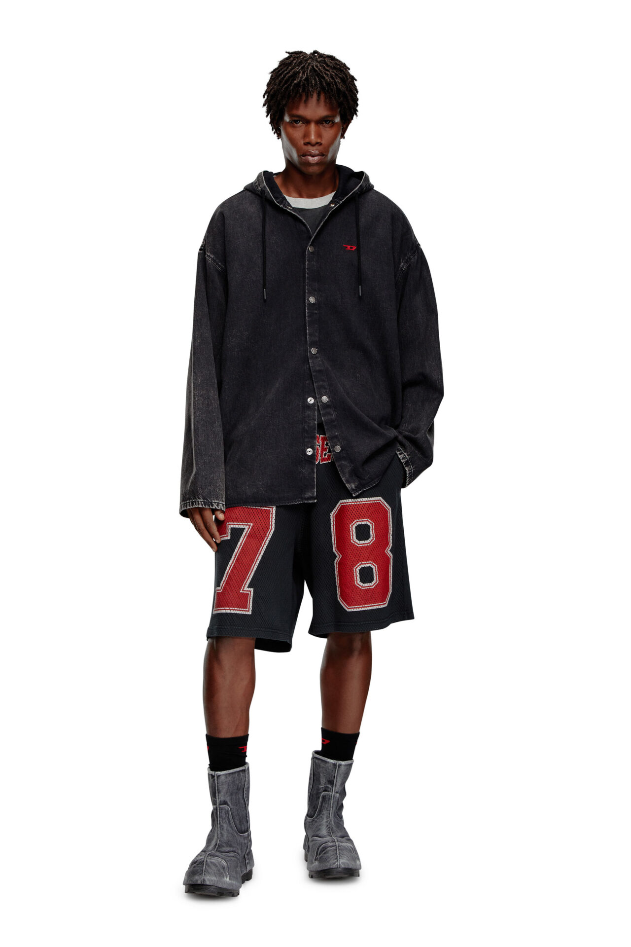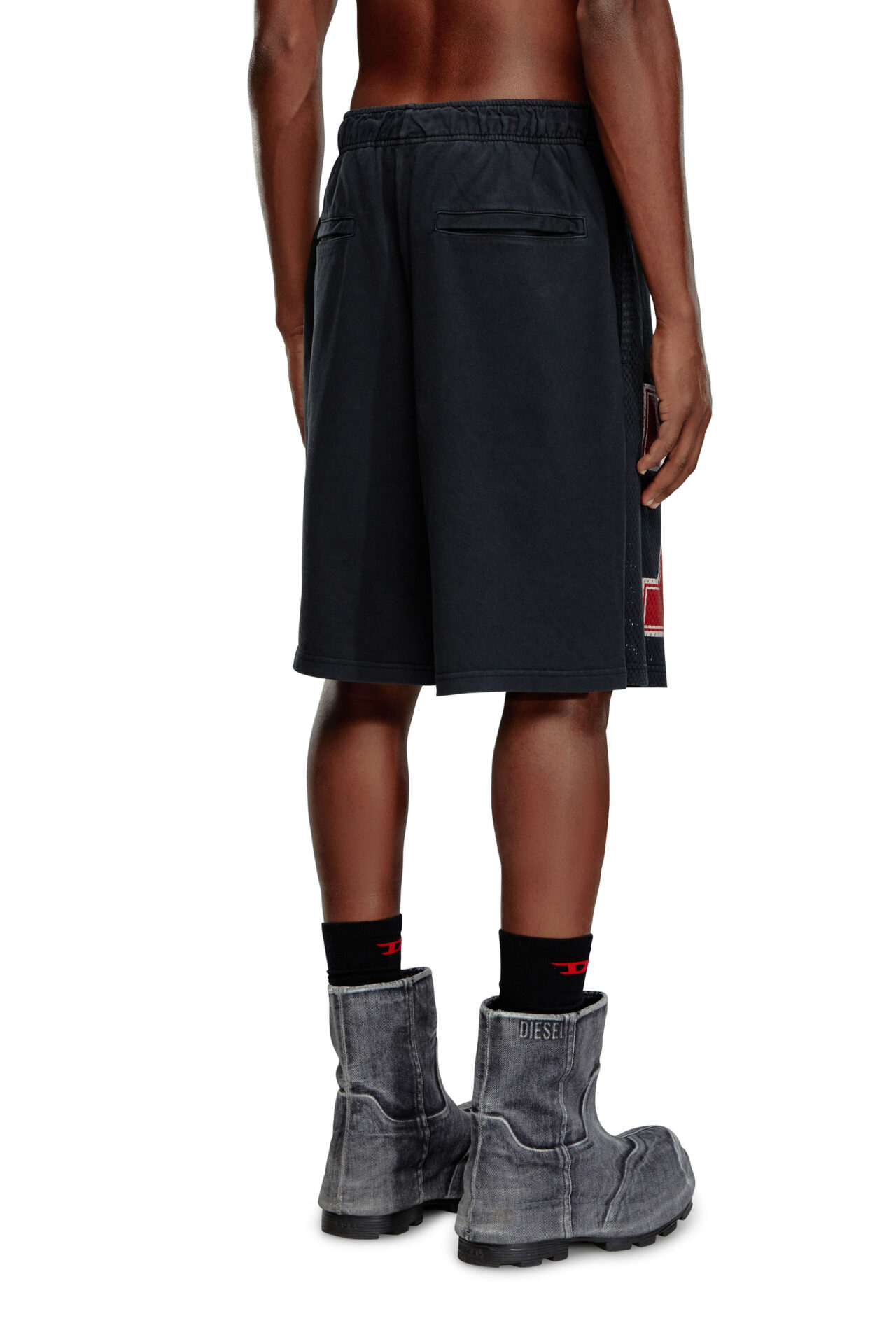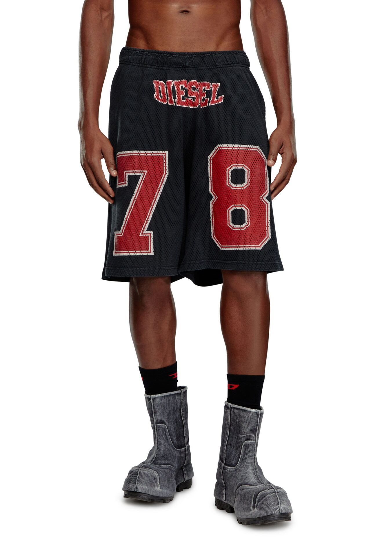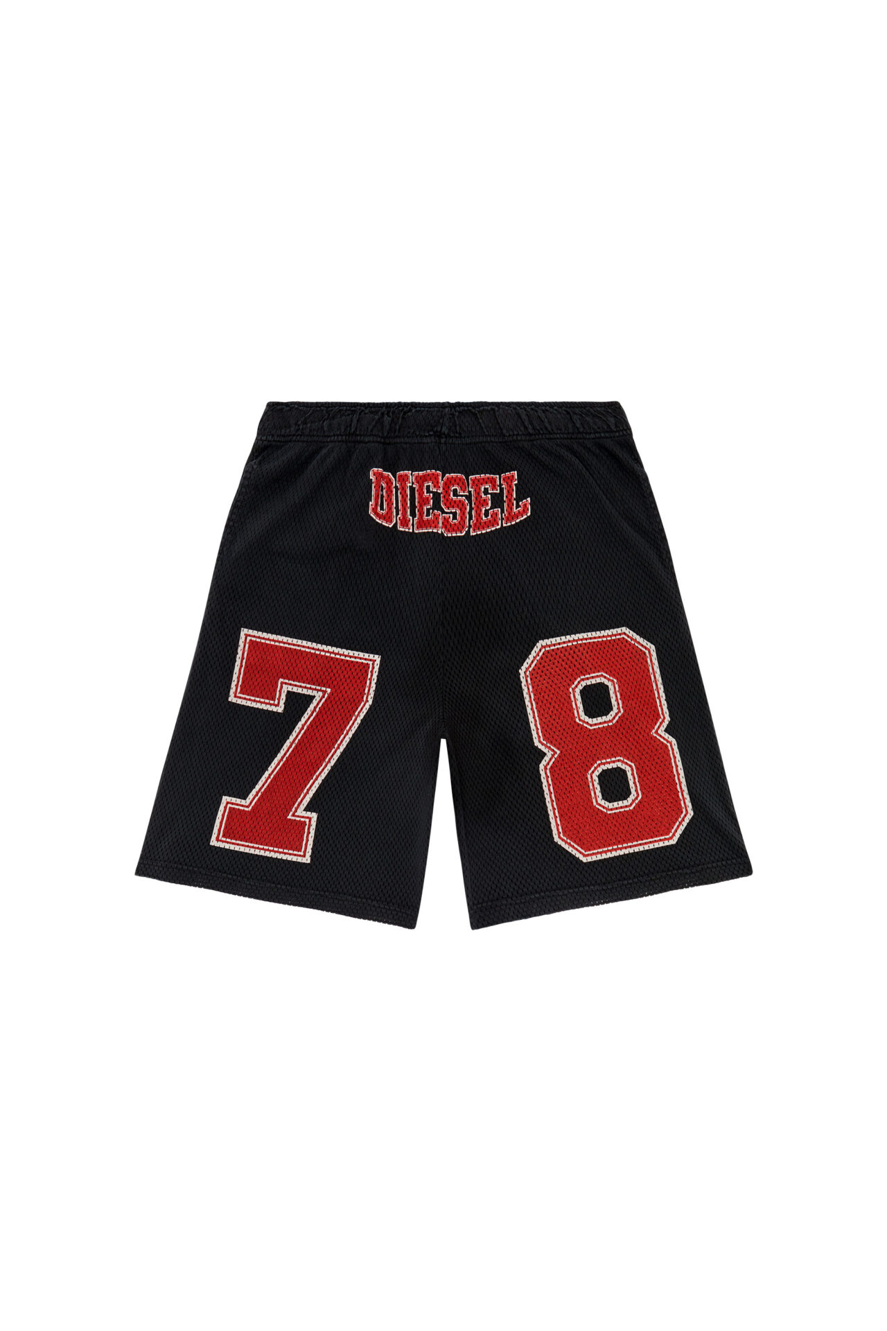 Cut for a regular fit, these men's black shorts sport a dual fabric construction. The front is made from mesh printed with collegiate-style 'Diesel 78' branding, while the back is in weighty loopback cotton jersey. A pigment-dyed finish imparts a soft fade.