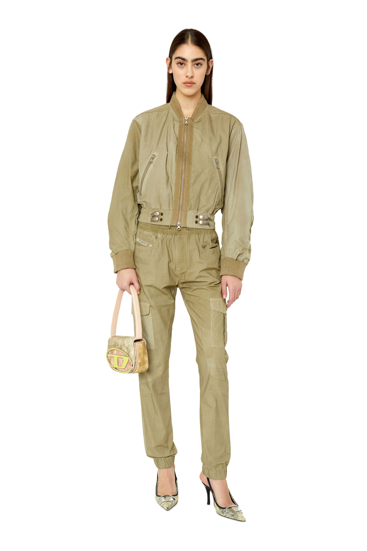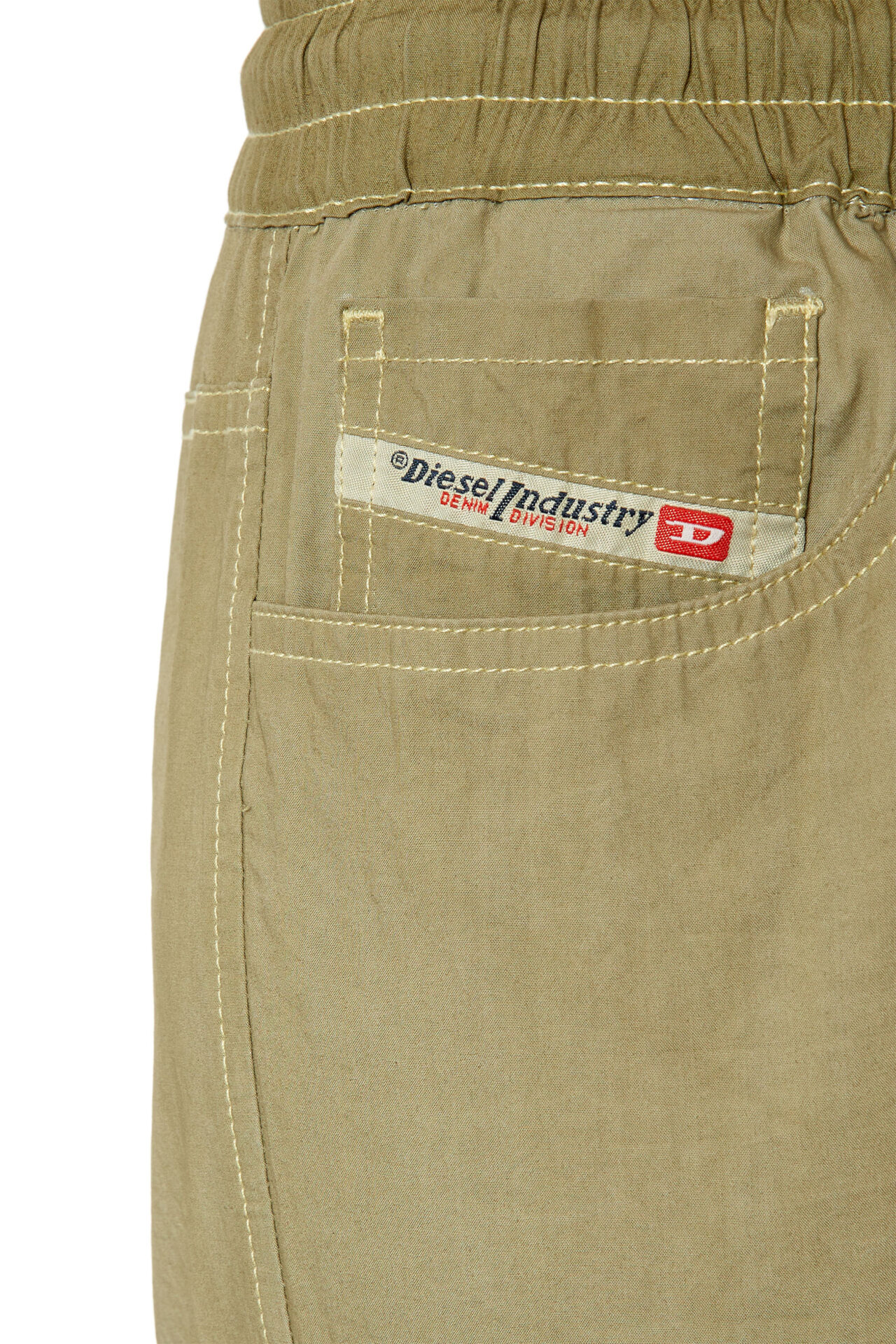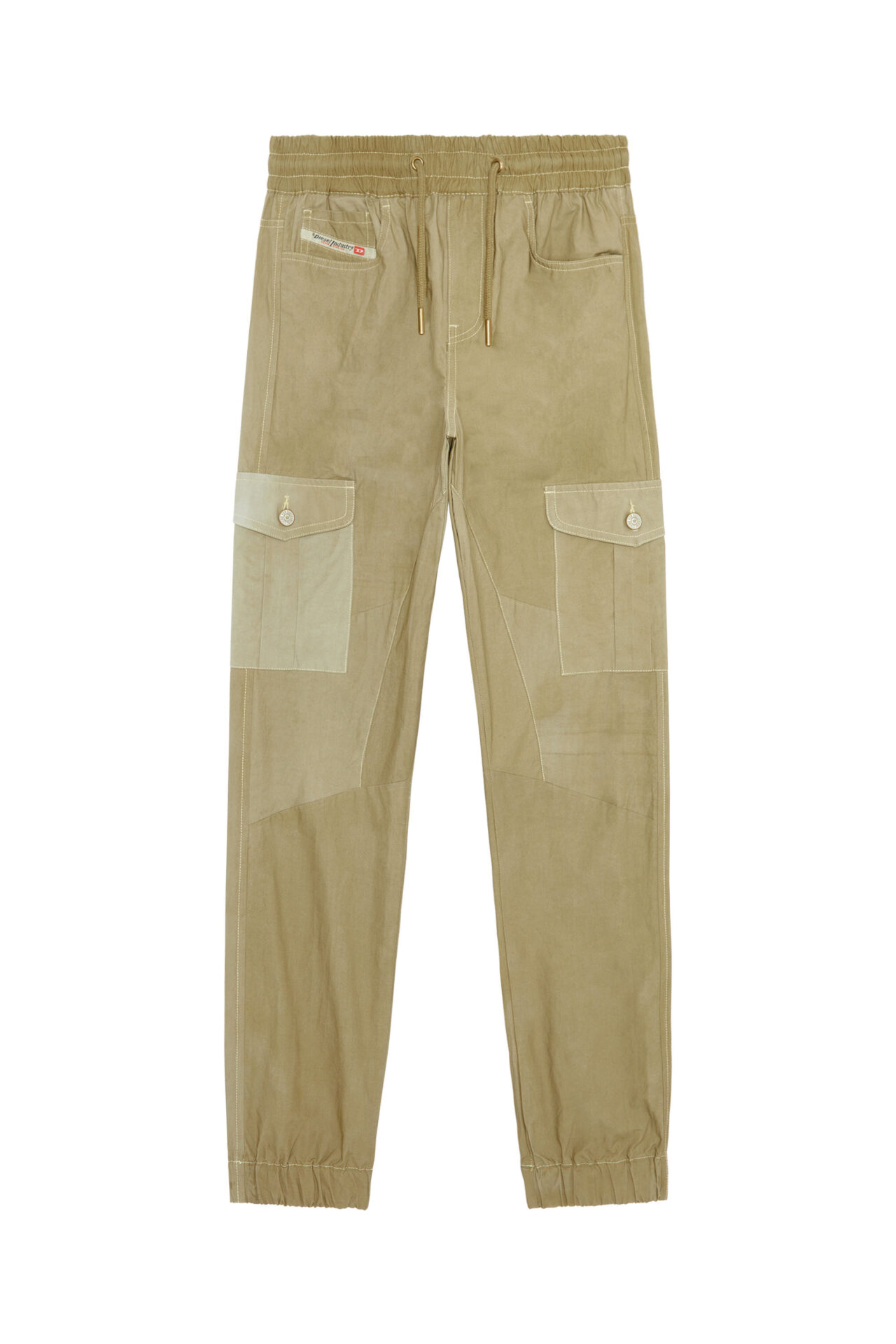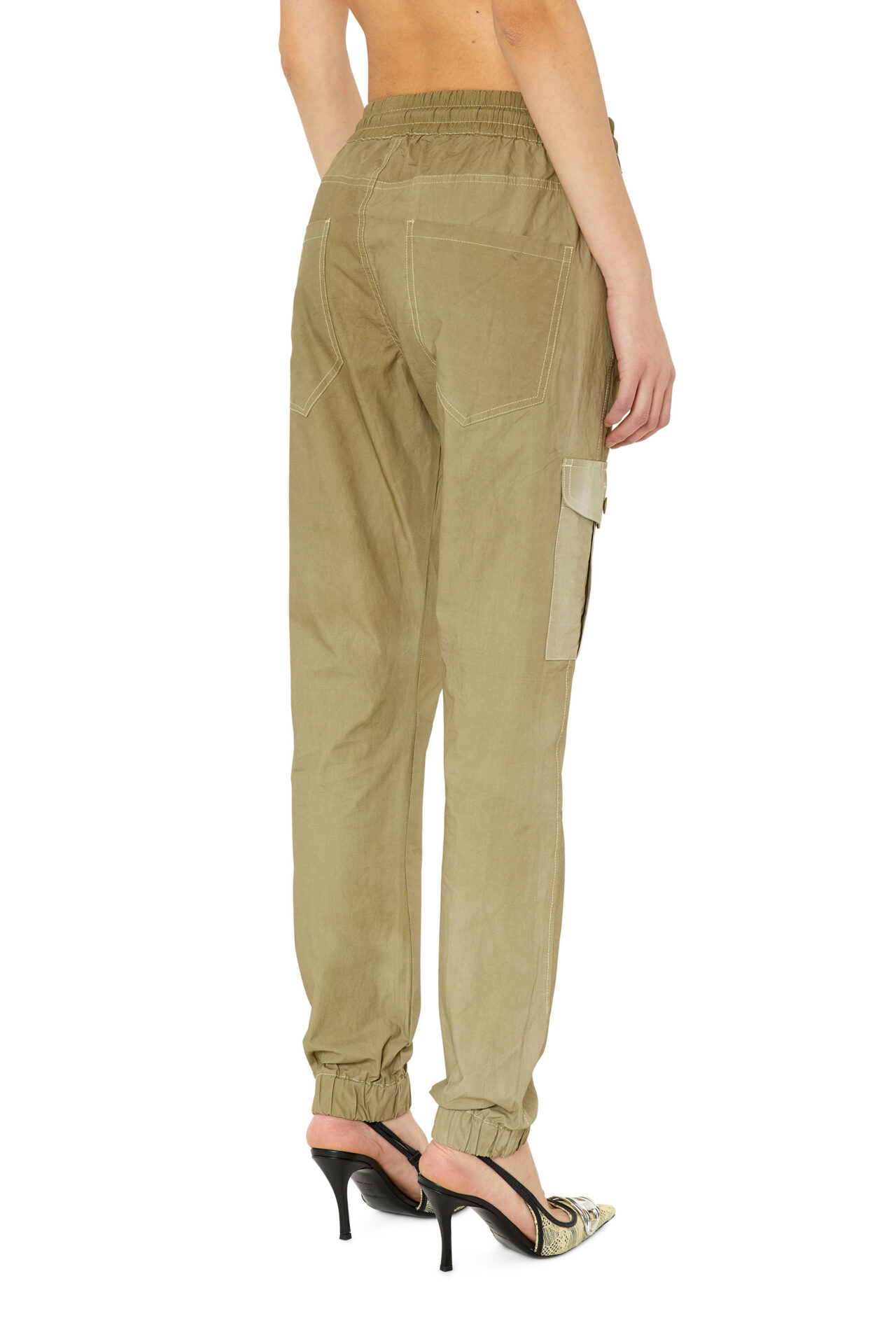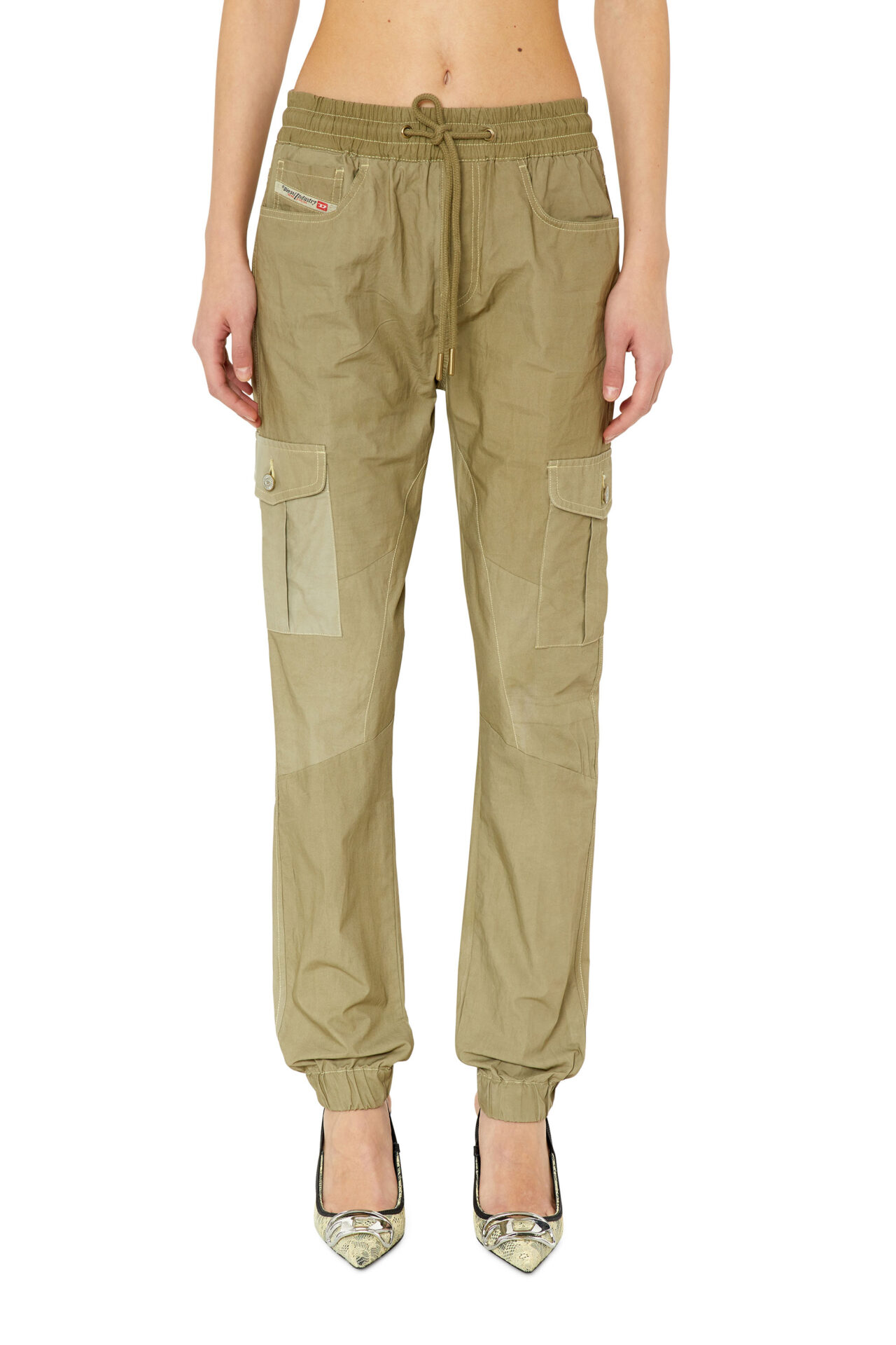 Women's regular-fit trousers cut from heavy cotton poplin, specially treated for a subtle vintage look in khaki hues. This five-pocket style features an elasticated drawstring waist, buttoned flap pockets and Diesel's iconic flag detail.