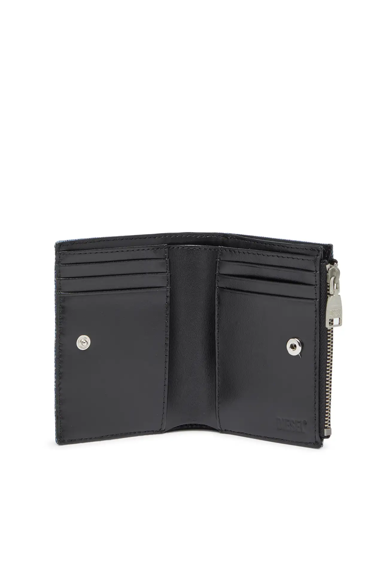 This women's denim wallet combines the casual feel of Diesel's DNA fabric with the understated elegance of the matte-finish metal Oval D hardware. A compact, bi-fold design, it has a snap-fastening section for cards and notes and a quick-access coin pocket fastened with a zip.