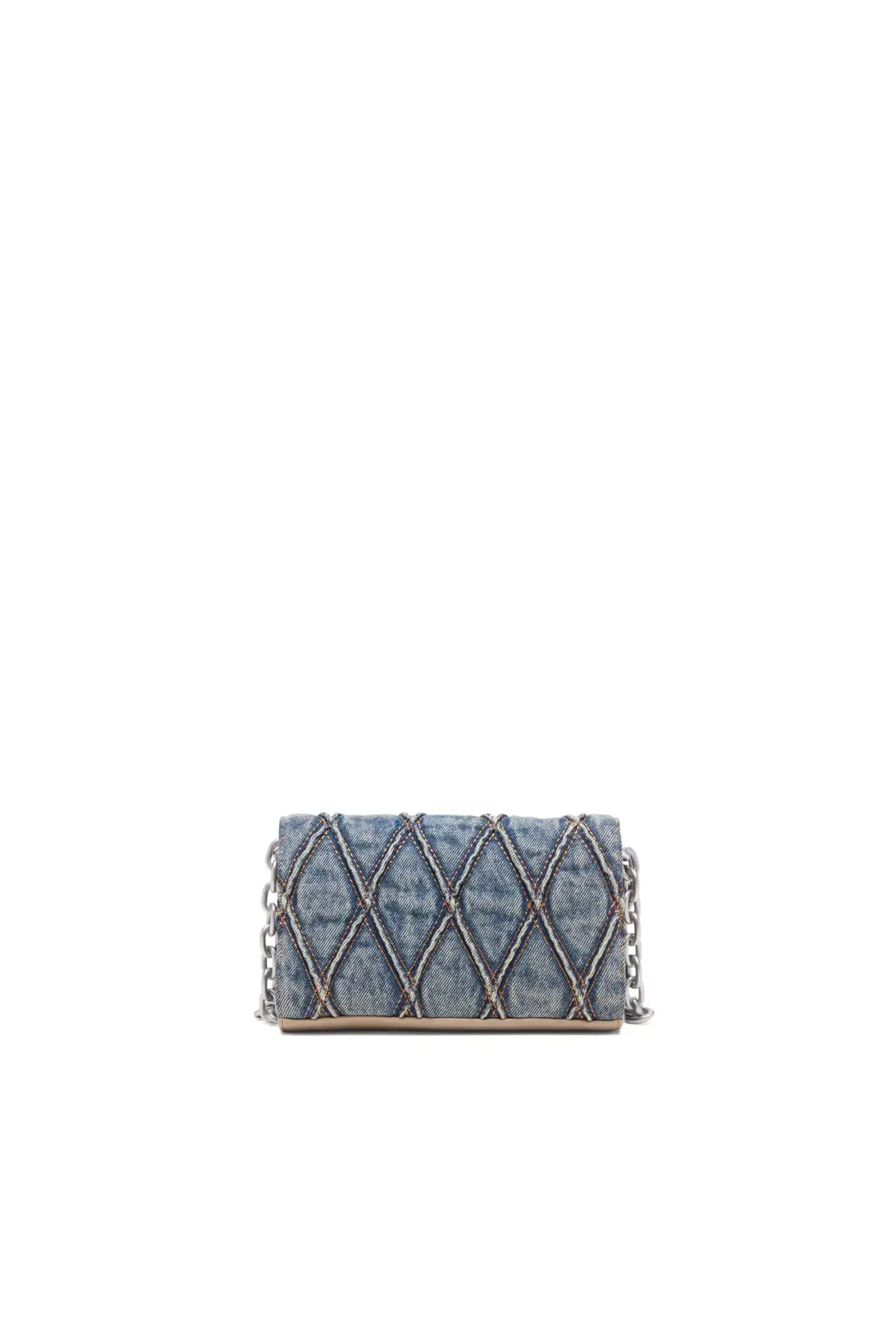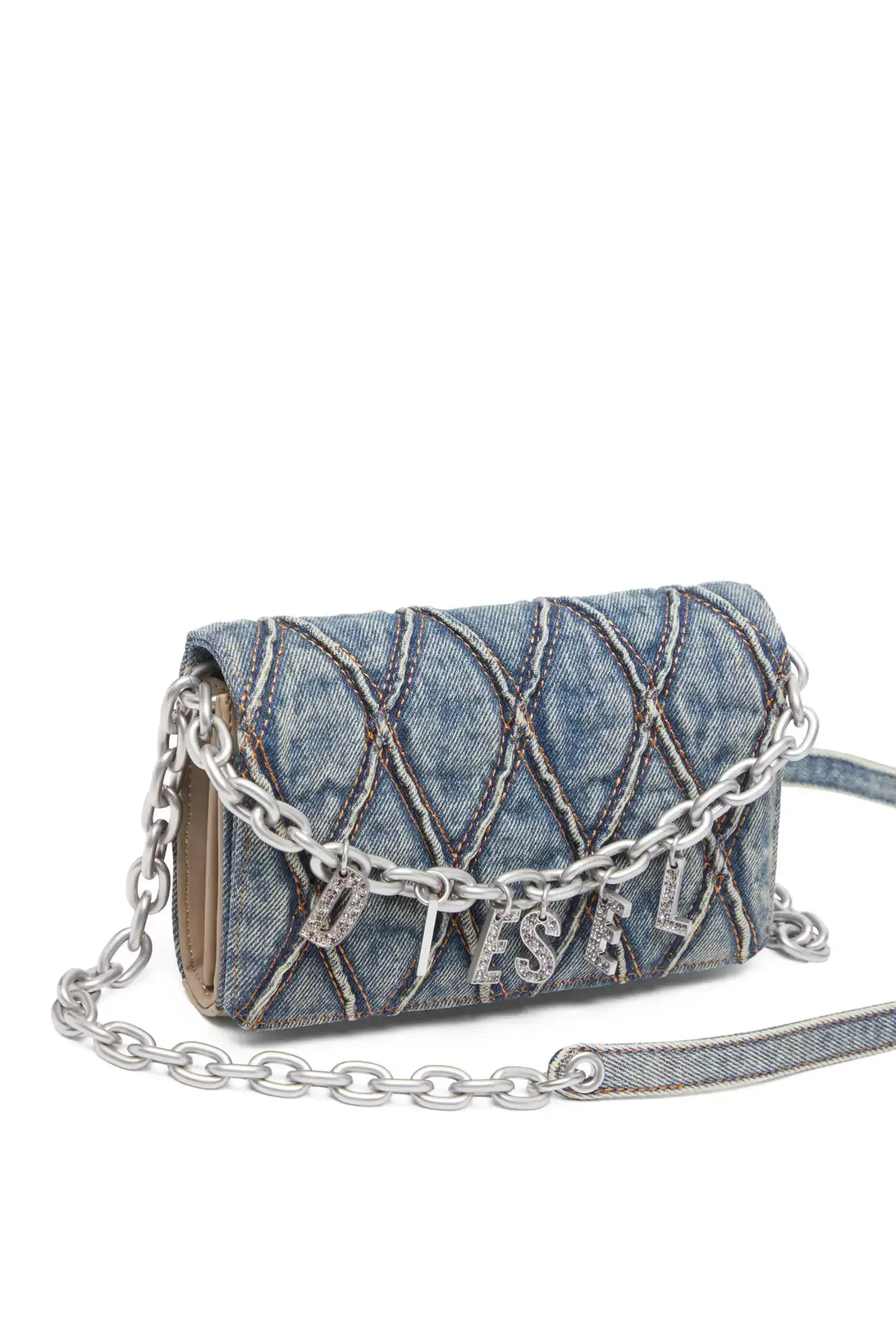 This women's wallet doubles as a minibag thanks to the detachable chain and denim strap. Made from dirty-wash denim quilted in a diamond pattern, it has a snap-fastening gusseted design and a zipped coin pocket. The accessory is adorned with a chunky chain detail with crystal-encrusted logo letters.