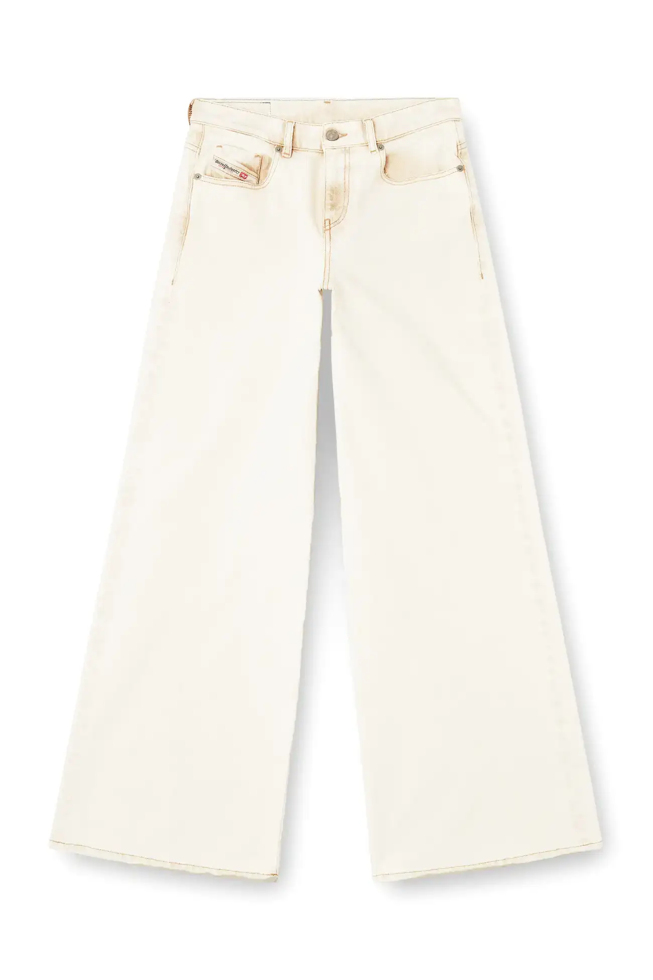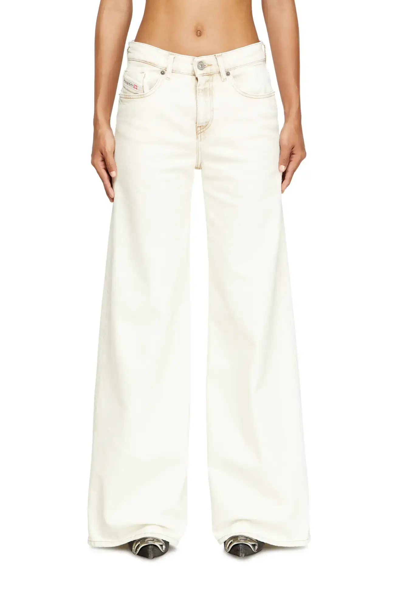 ג׳ינס בגוון אוף ווייט בגזרה צרה במותניים ומתרחבת ברגליים, בהשראת שנות השבעים