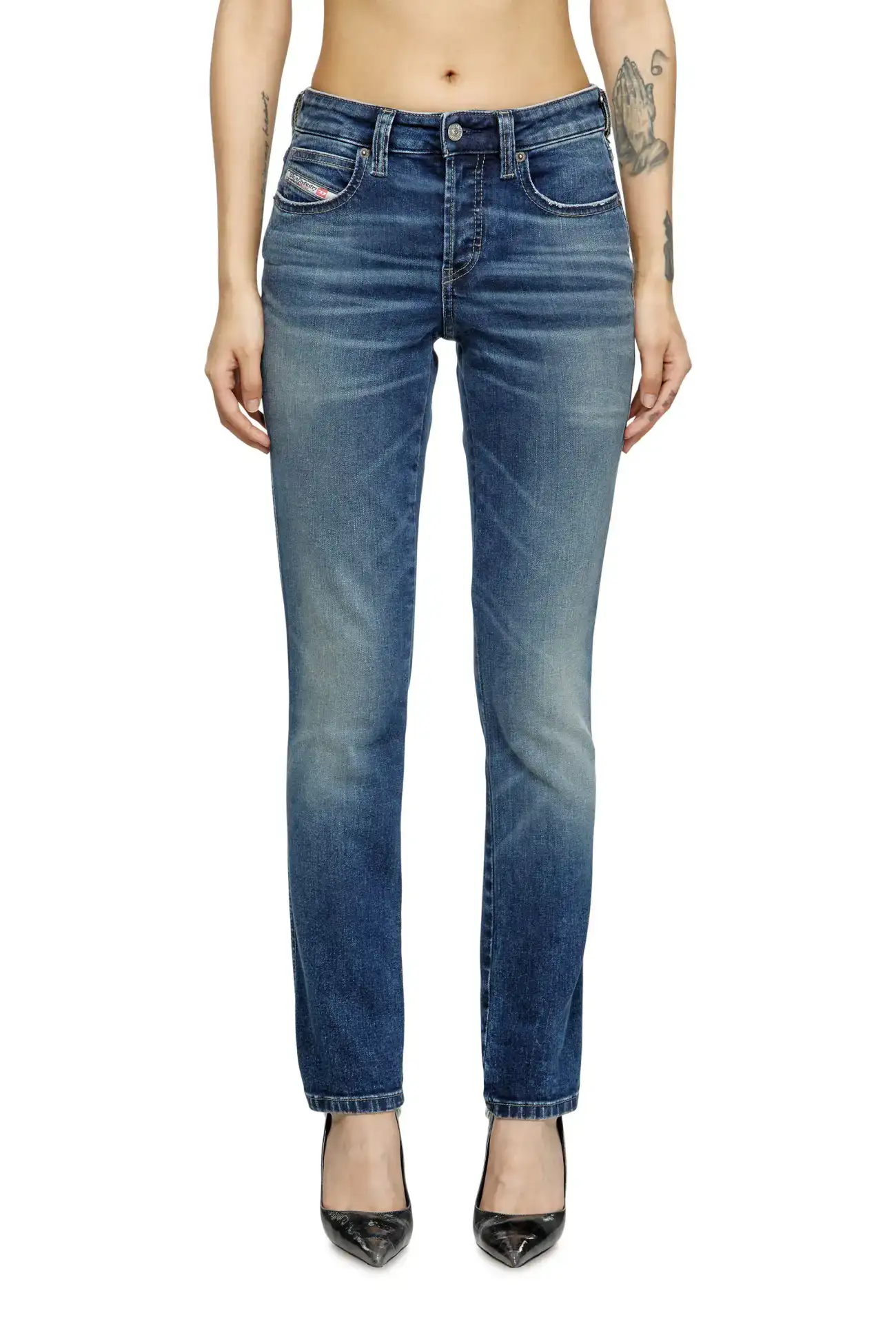 ג׳ינס כחול בגזרה צרה ונמוכה, שהיא גרסה עכשווית לגזרות של שנות ה-90