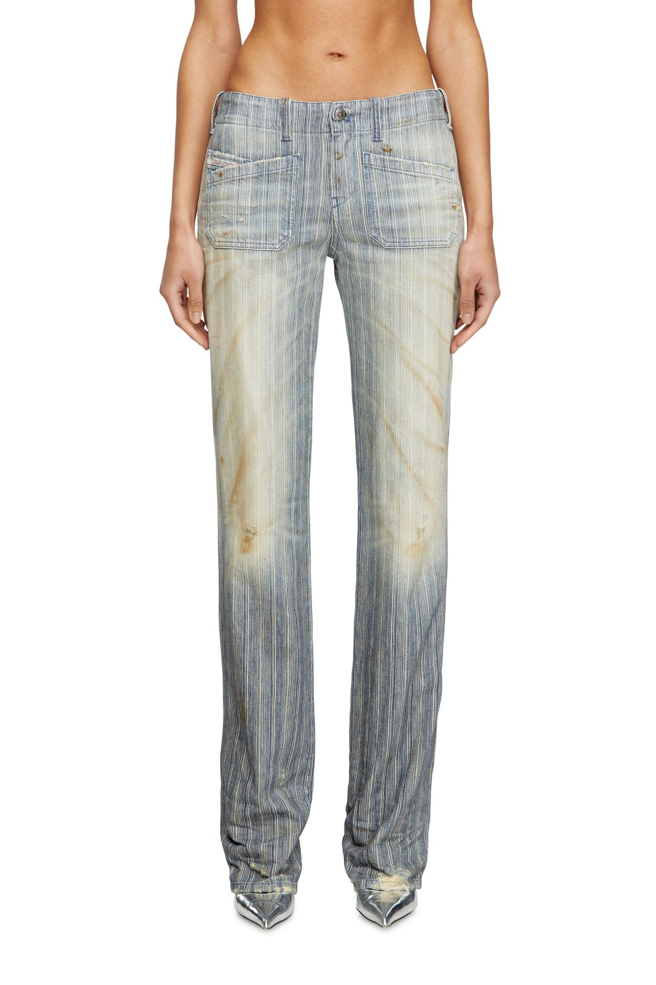 ג׳ינס בגזרה נמוכה ומתרחבת (בוט-קאט), בצבע כחול בהיר עם טקסטורת פסים ומראה מלוכלך, עם כיסים קדמיים אלכסוניים למראה נוסטלגי