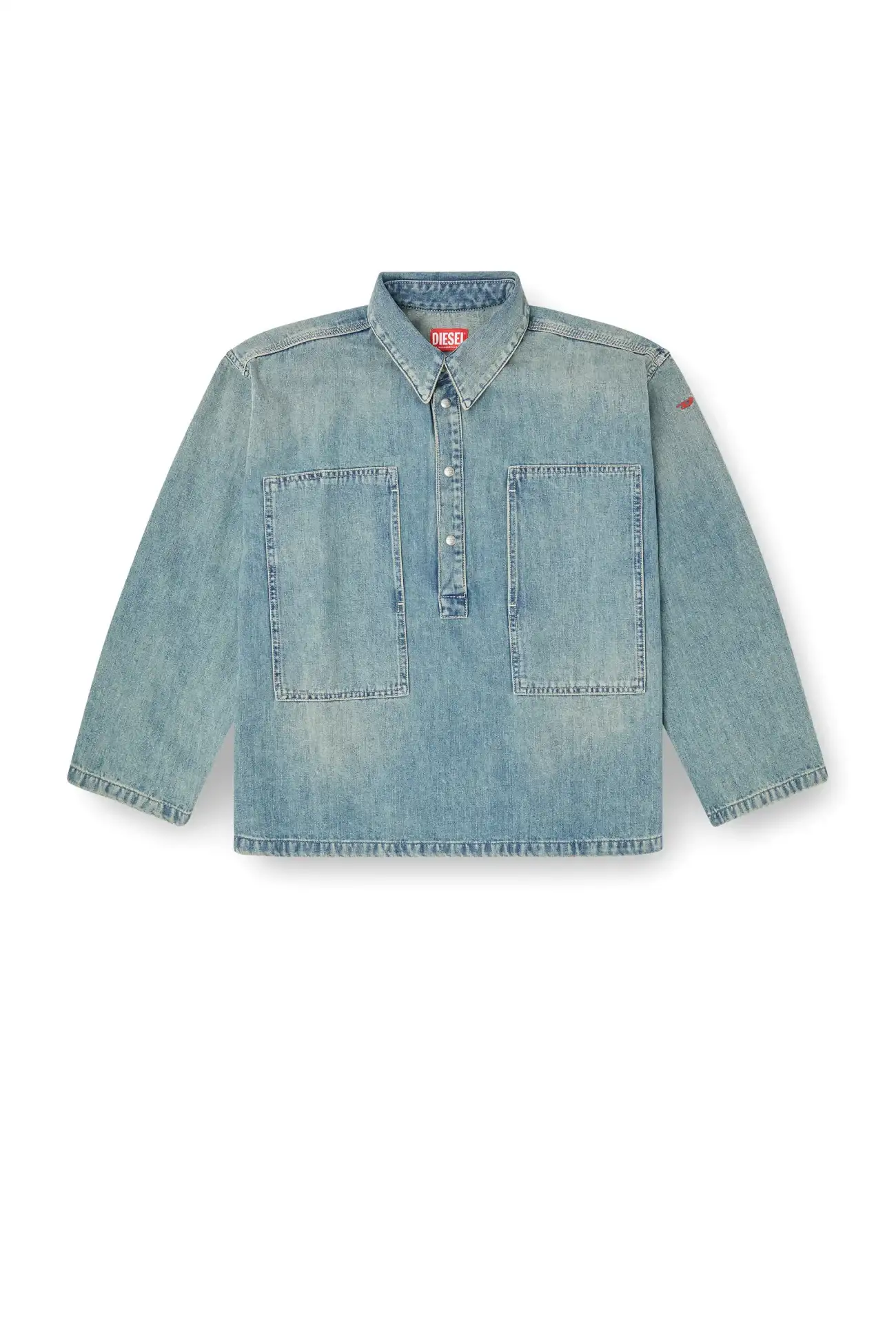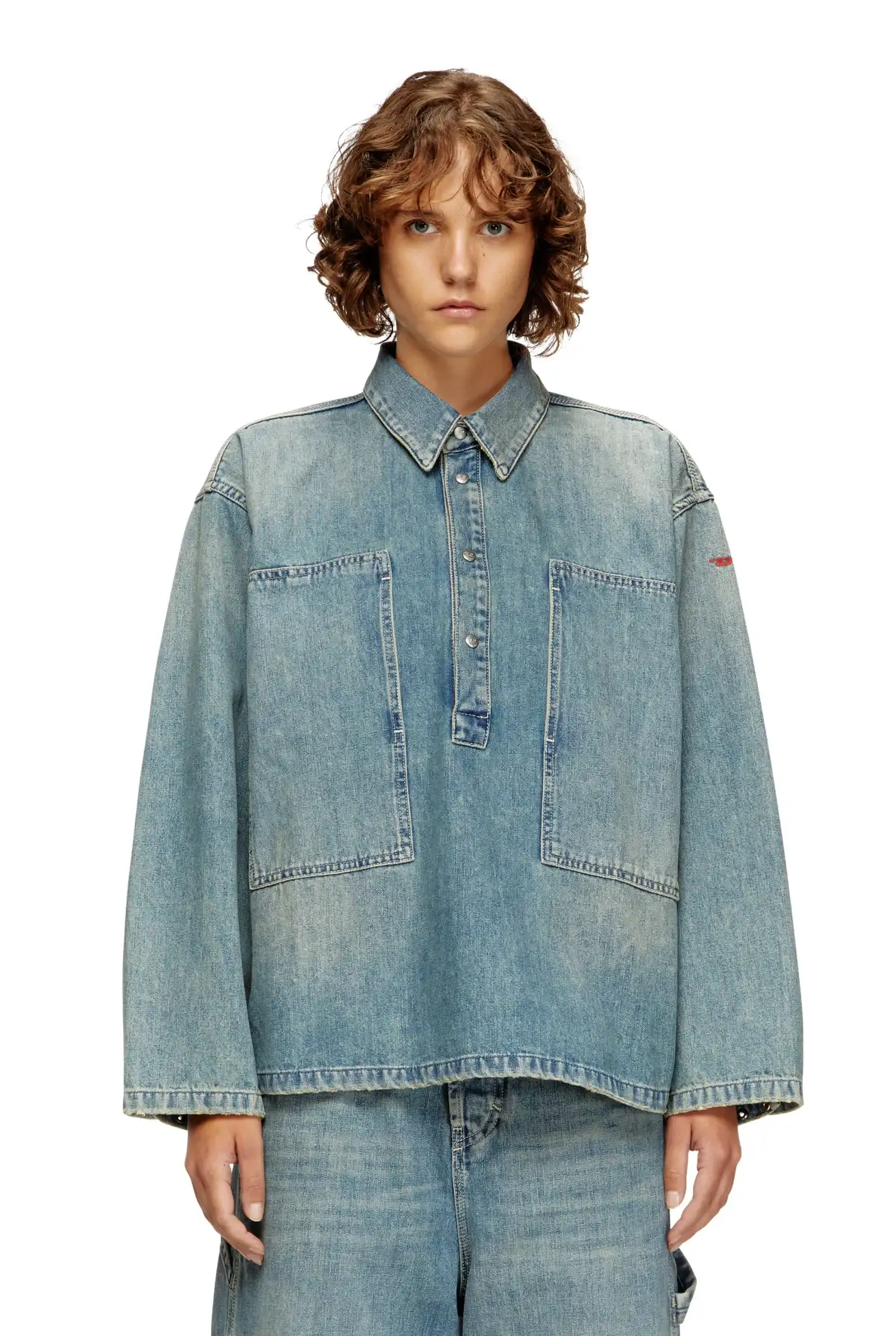טופ שרוול ארוך לנשים בגזרה רחבה בצבע כחול בהיר, צווארון פולו עם כפתורי תיקתק מתכת ממותגים, כיסי פאץ׳ רחבים בחזה הנפתחים מהצד, רקמת לוגו D אדום קטן על אחד השרוולים