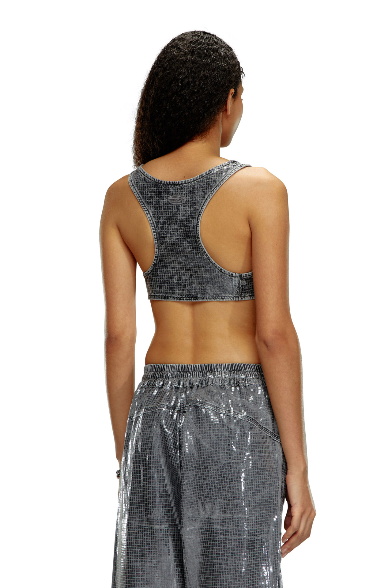 טופ בגזרת גופייה בצבע אפור עם ציפוי מבריק בדוגמת משבצות קטנות ומפתחי שכמות עגולים