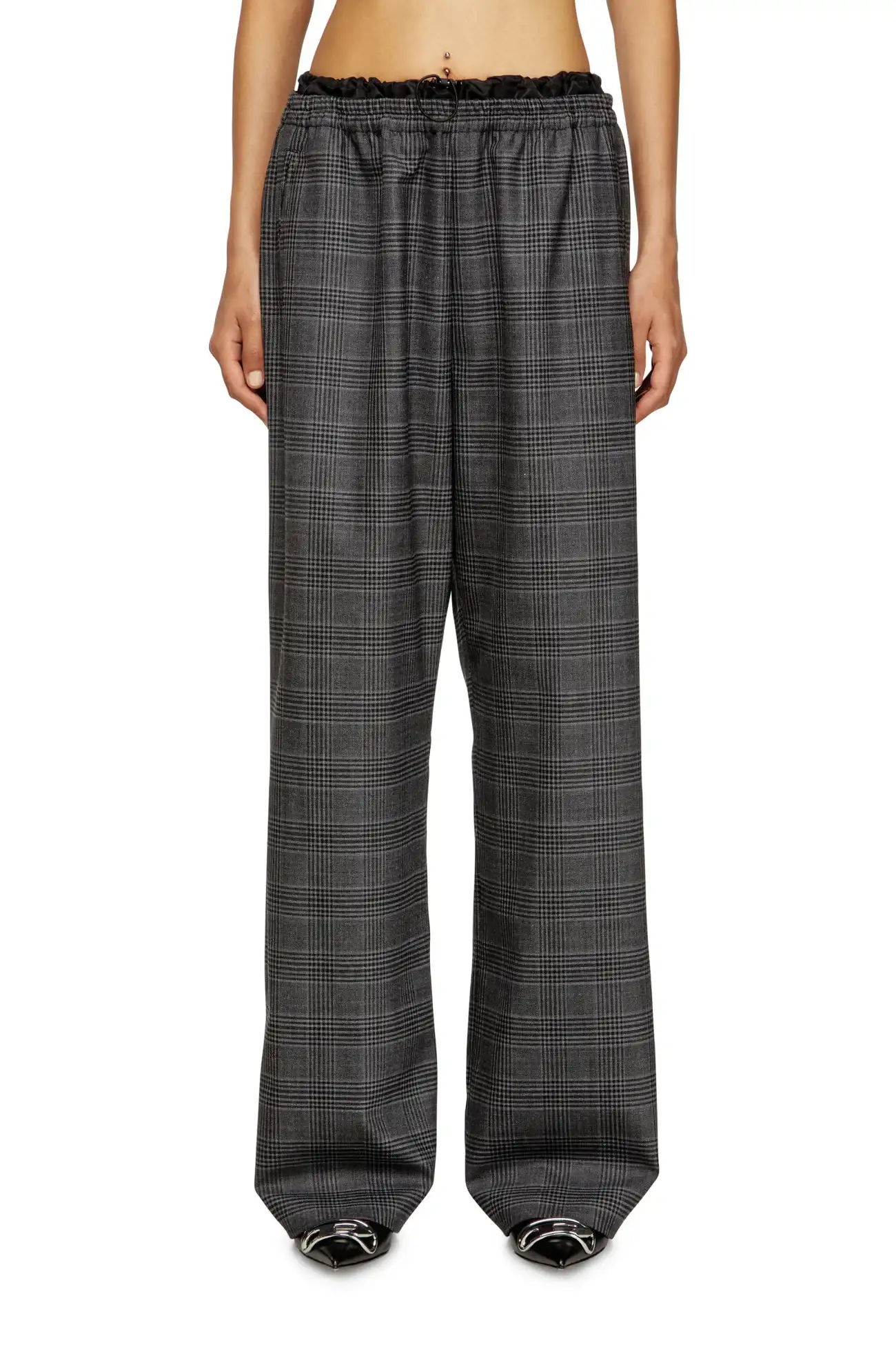 Wool trousers, wide and comfortable, in Prince of Wales fabric with nylon insert at the waist. The waist is adjustable thanks to a practical drawstring and an internal elastic band. There are welt pockets at the front and back, and the metal logo is visible on the back of the trousers.