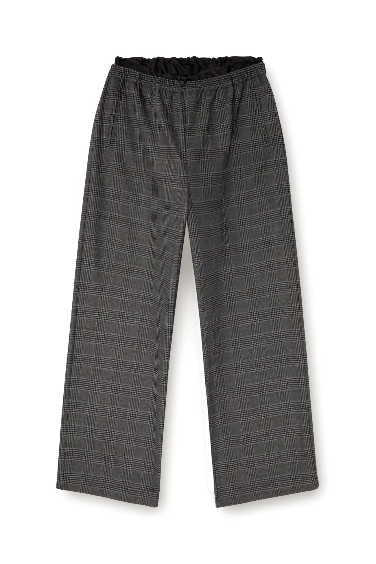 מכנסי צמר רחבים בצבע שחור, בד Prince of Wales עם תוספת ניילון במותן, שרוך מותן וגומי פנימי להתאמה, כיסי פס קדמיים ואחוריים ולוגו מתכתי מאחור