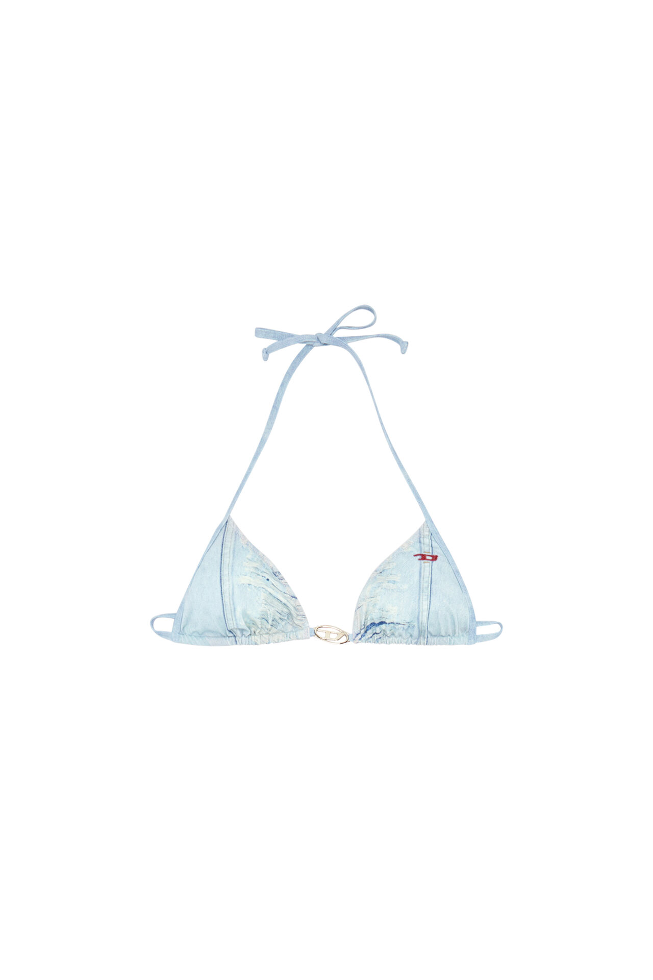 Crafted using recycled materials blended with stretch, this women’s bikini top is patterned with a trompe l'oeil print depicting distressed Diesel denim. It has padding-free triangle cups held together by Oval D hardware and a contrast red lining. Adjustable ties customise the fit.