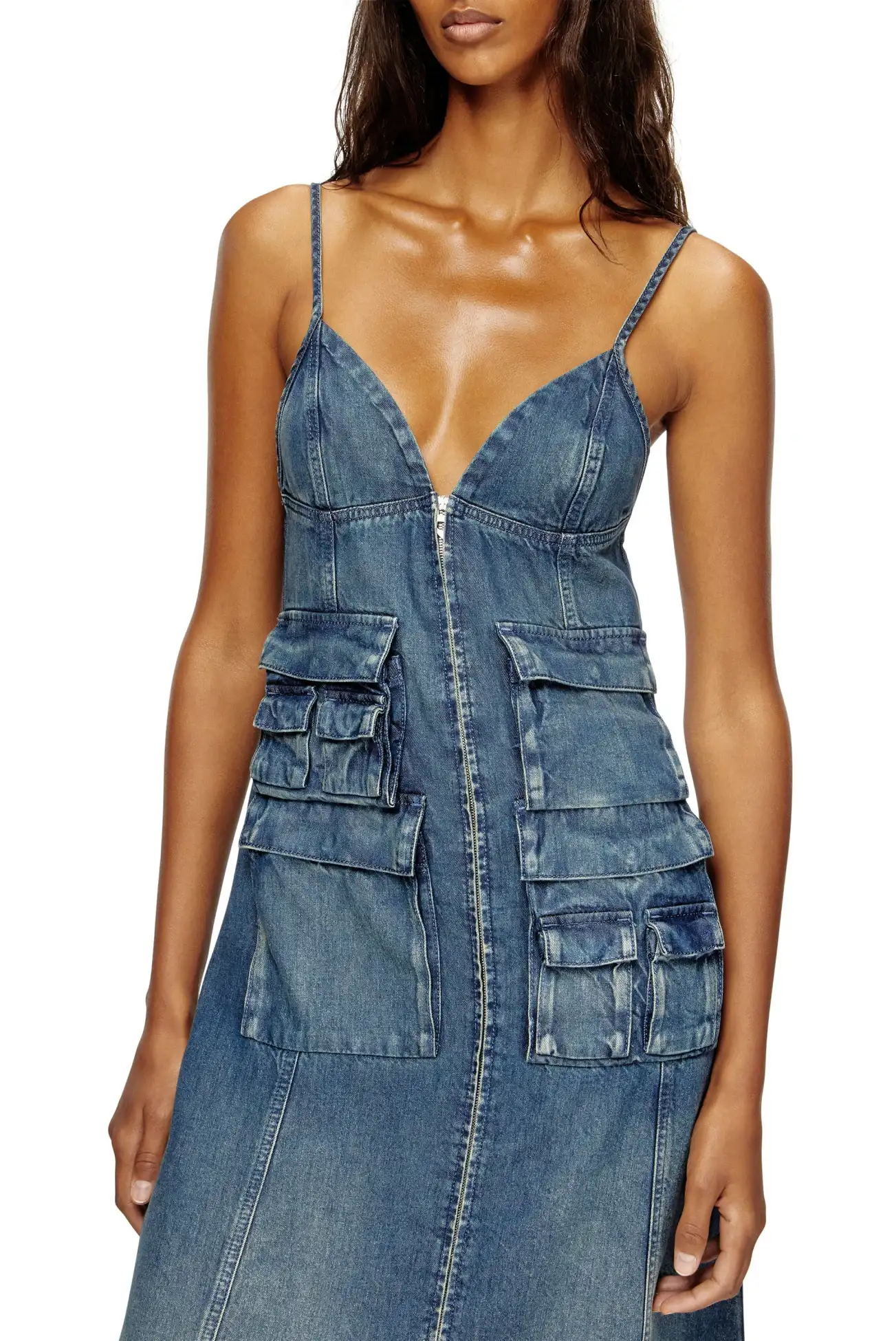 This women's mid-length dress is designed with a straight, empire-waist silhouette. The style features thin, adjustable shoulder straps and a front zip that's both decorative and functional. Cargo pockets add a signature utilitarian twist.