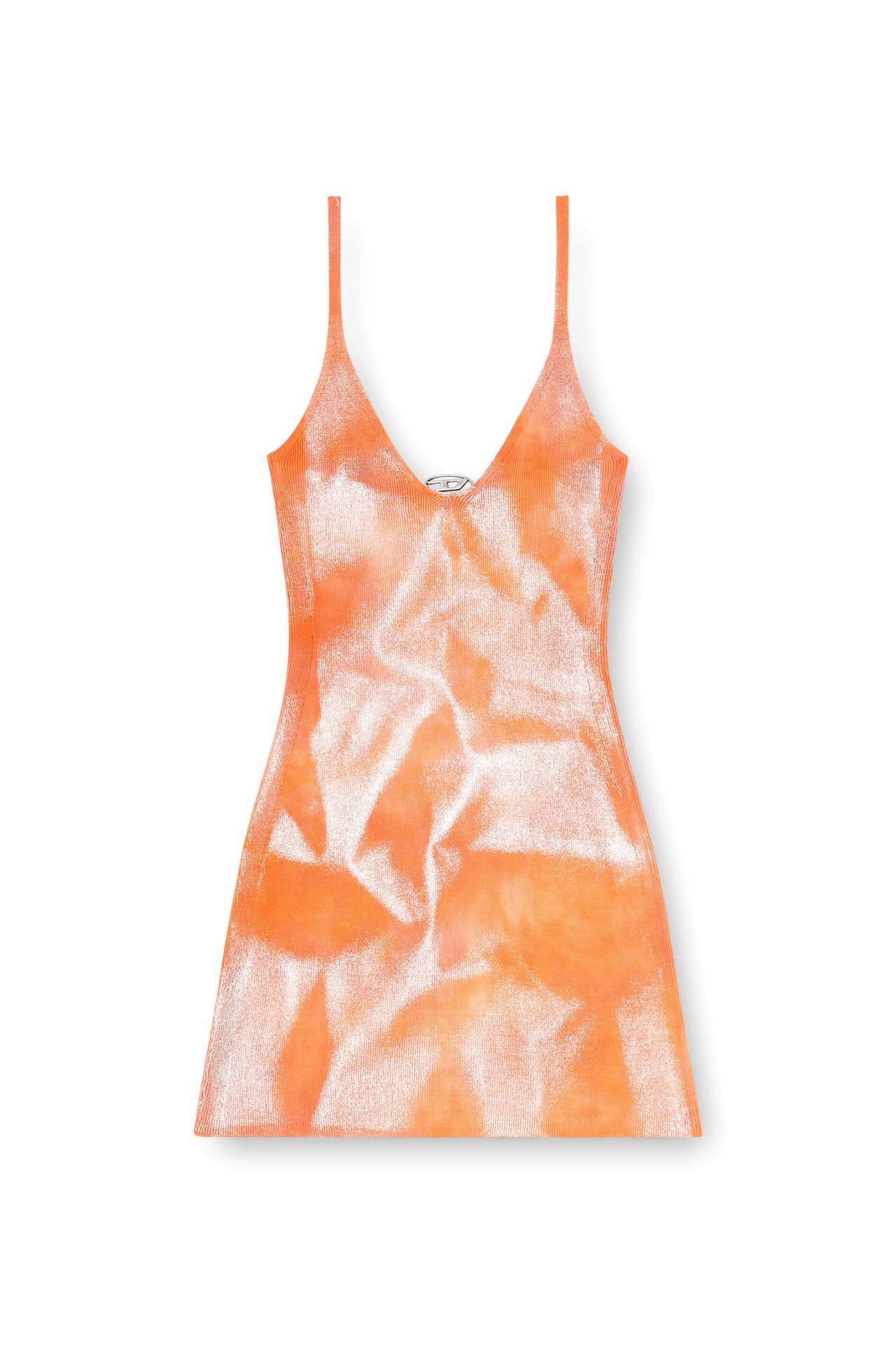 שמלת מיני צמודה בצבע כתום-ורוד, מבד סריג כותנה שעבר טיפול למראה כתמים דהויים וגימורים מטאליים, עם כתפיות דקות ולוחית לוגו קטנה במרכז המחשוף