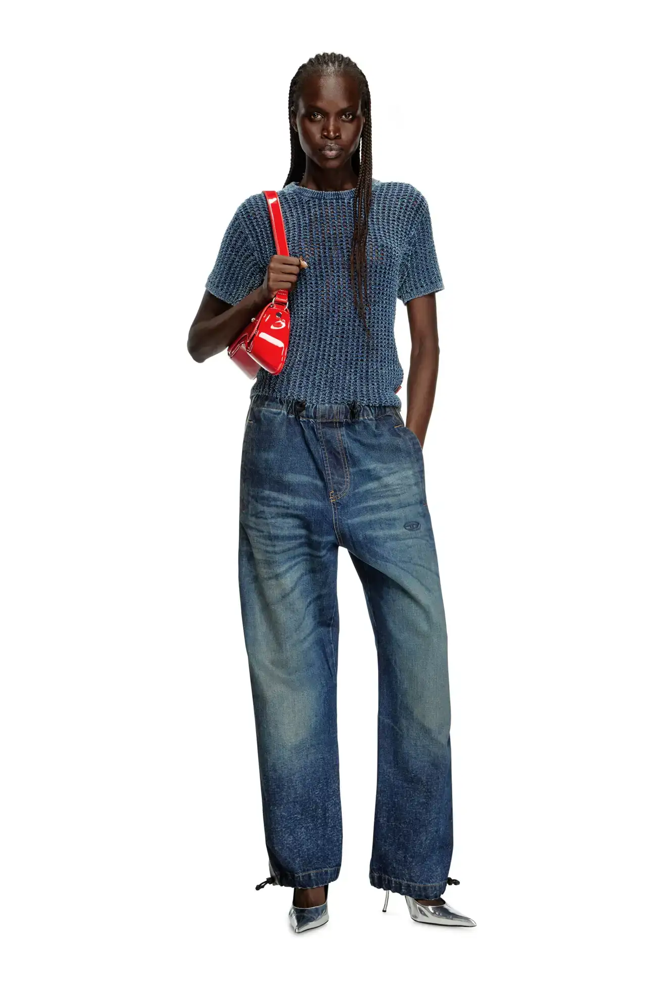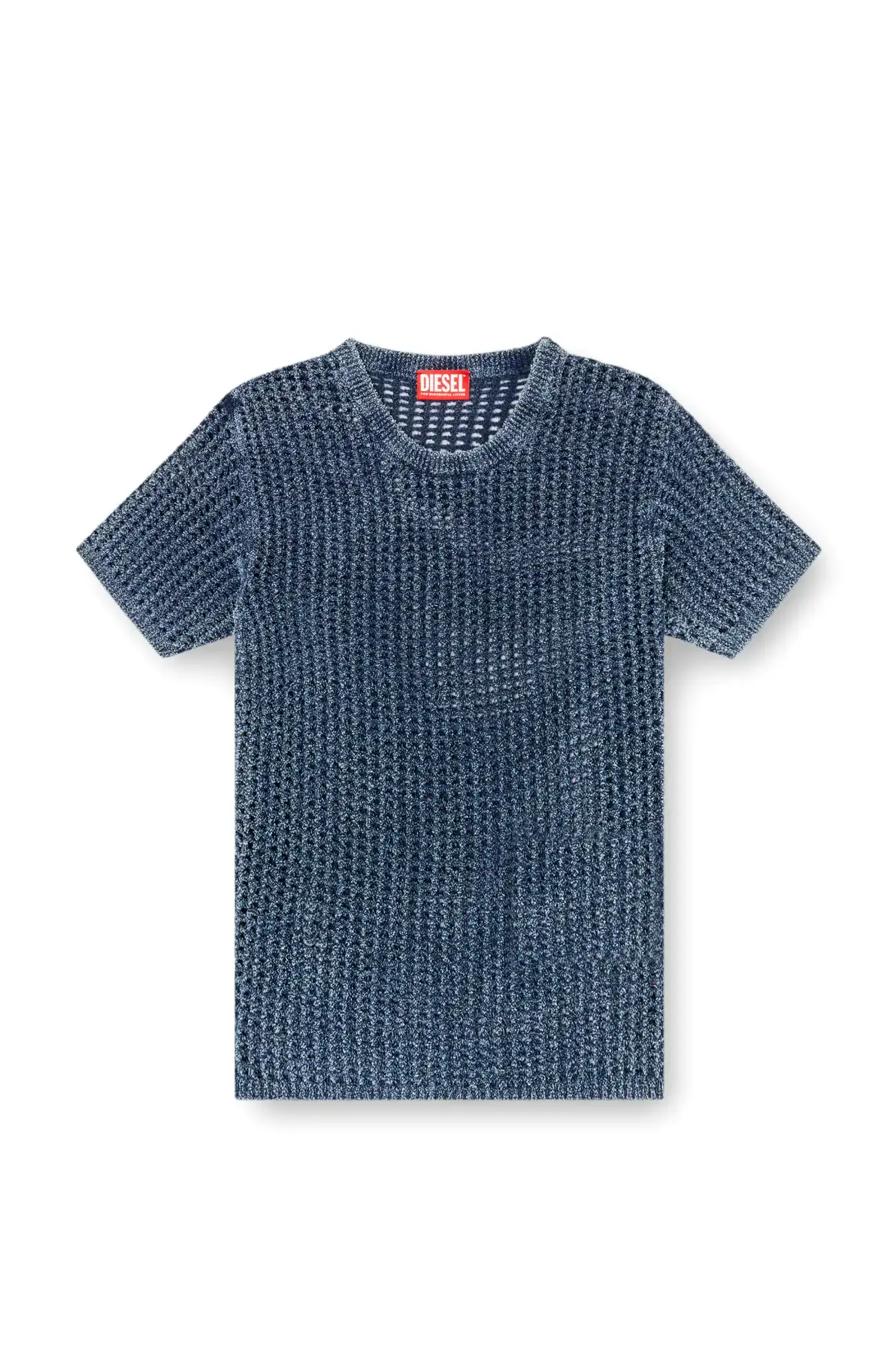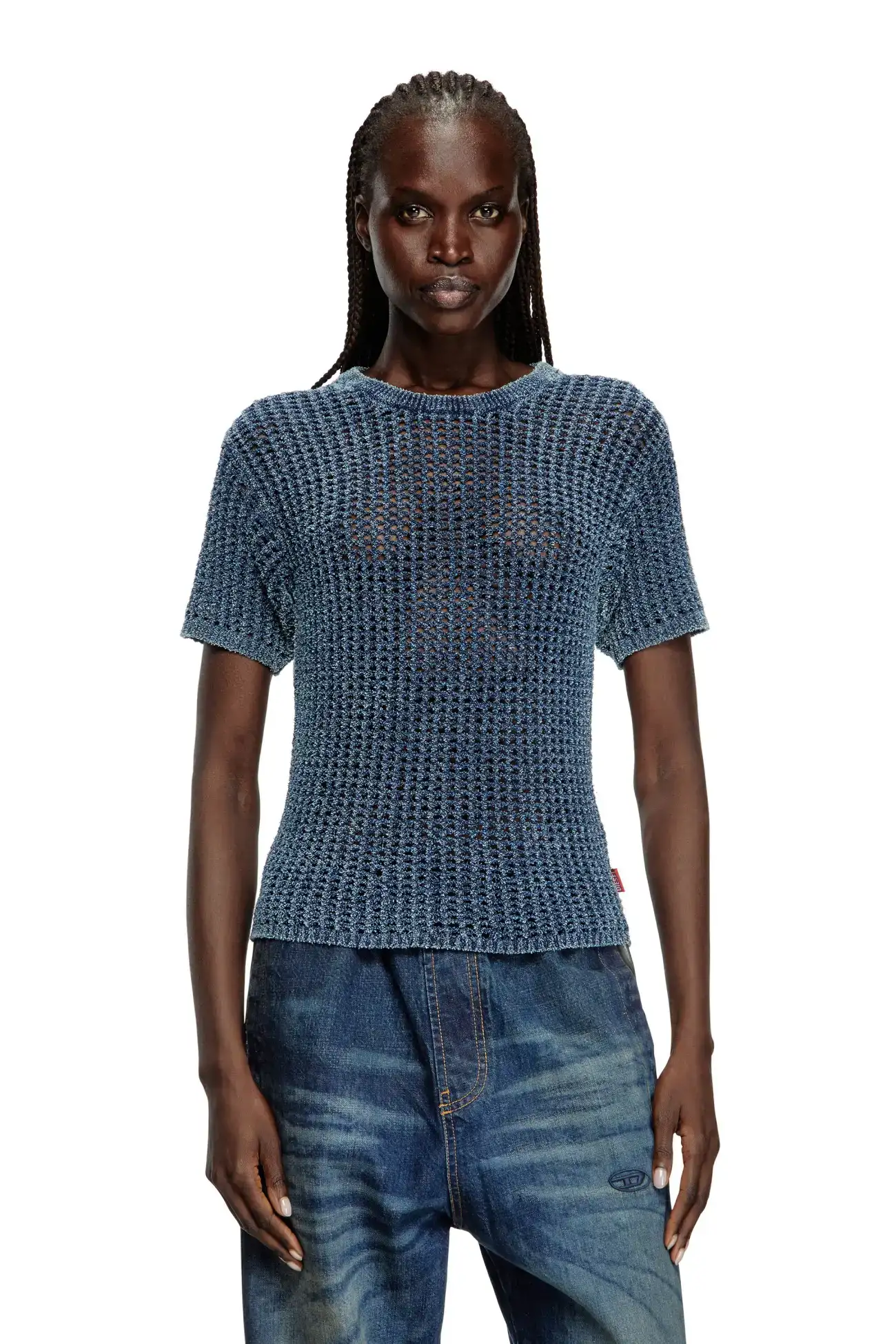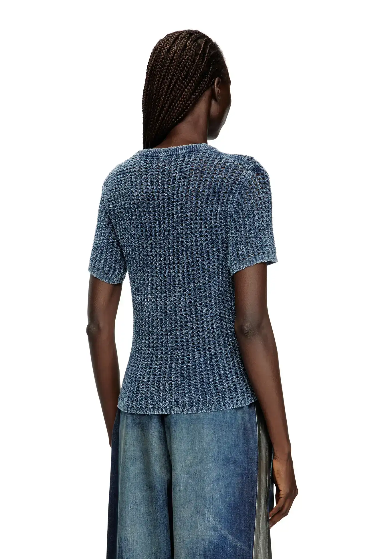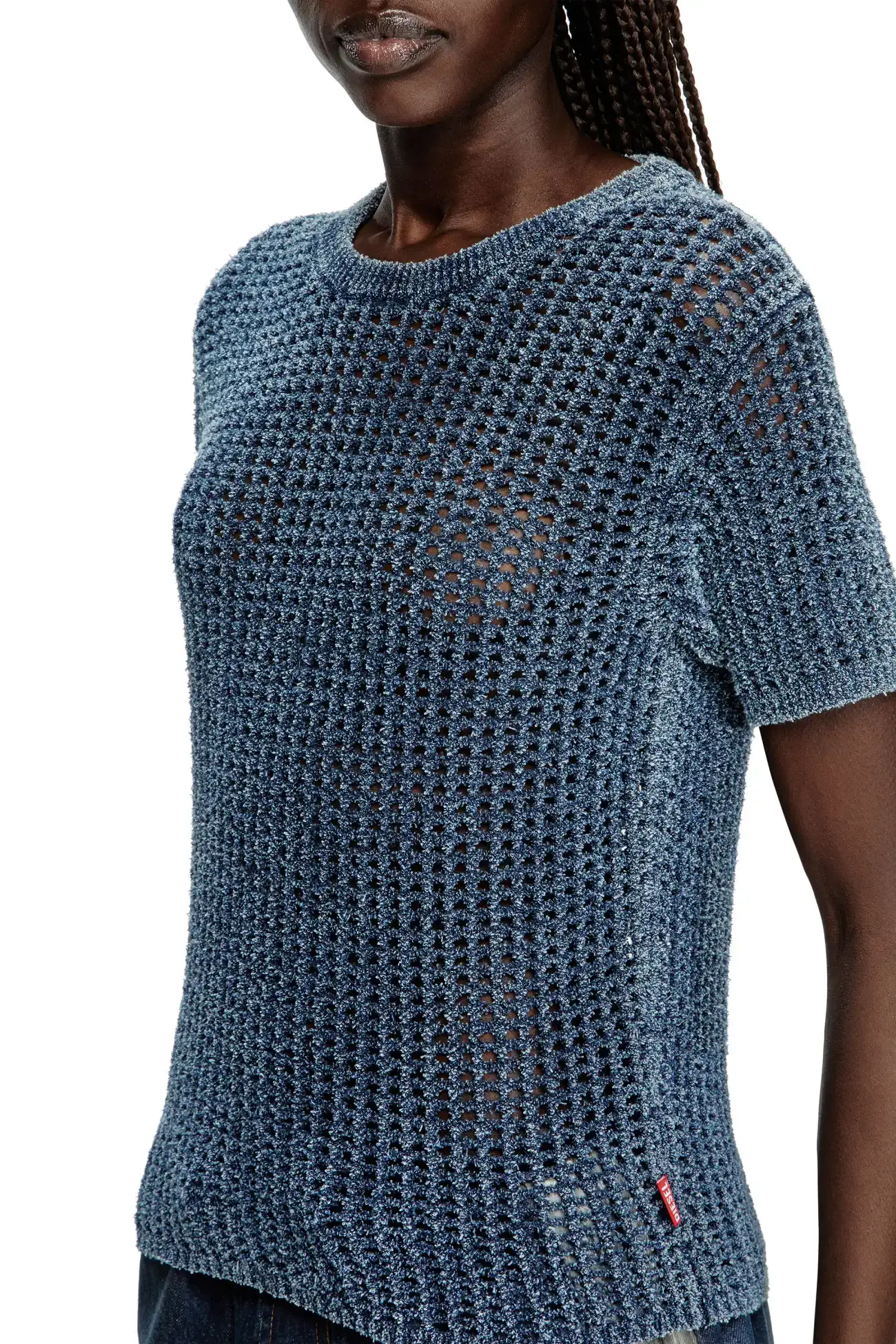 חולצת סריג בסריגה פתוחה שמעניקה לה שקיפות, עם מפתח צוואר עגול ושרוולים קצרים. עשויה סיבי דנים אינדיגו רך, עם אחוז גבוה של כותנה אורגנית, בצבע כחול עם גימור דהוי בעדינות
