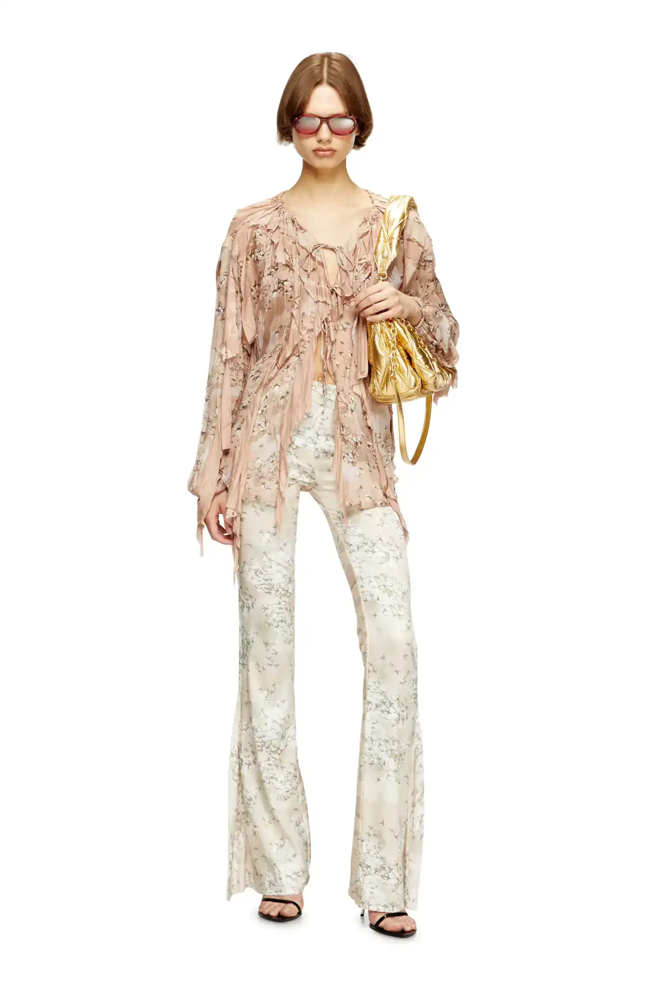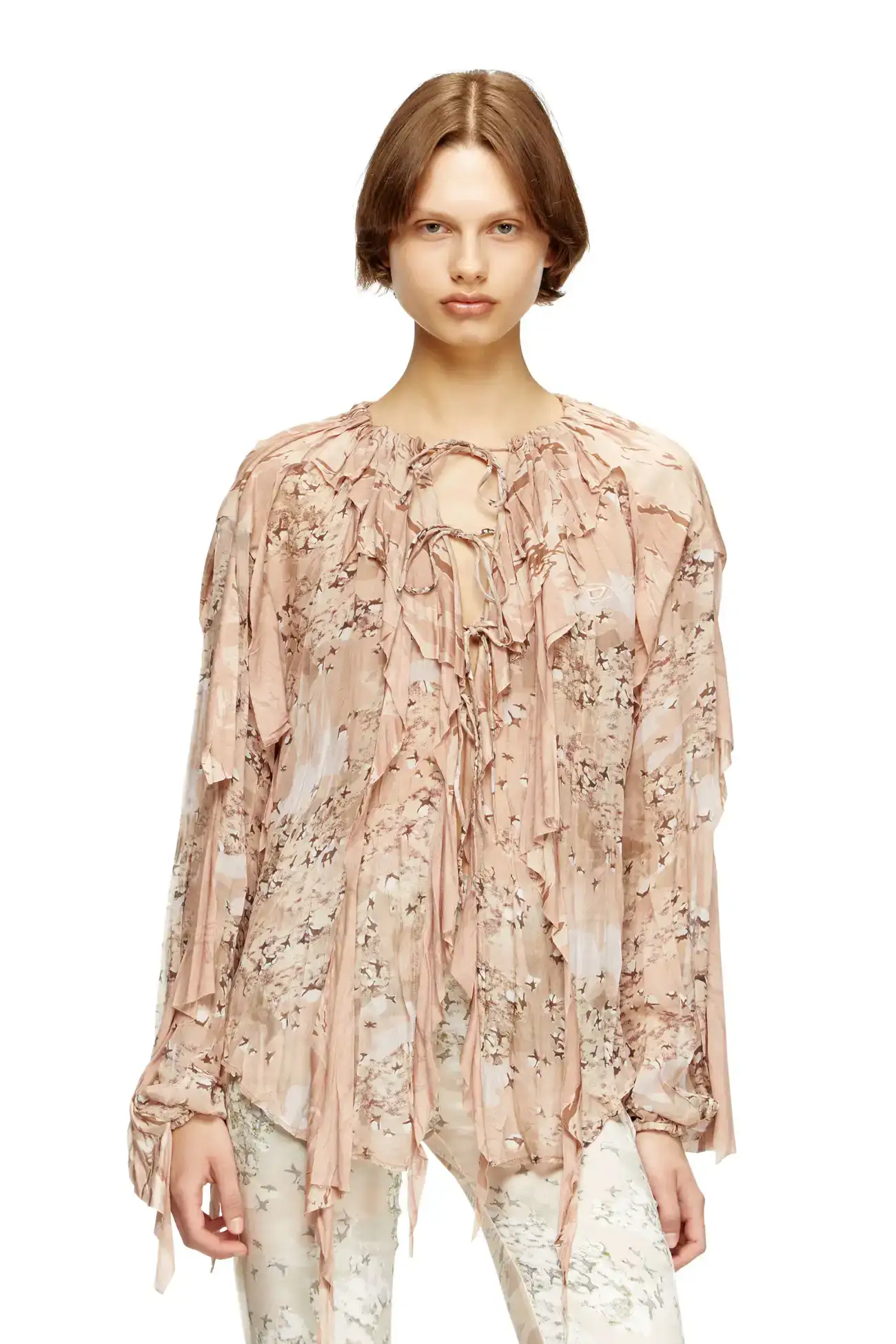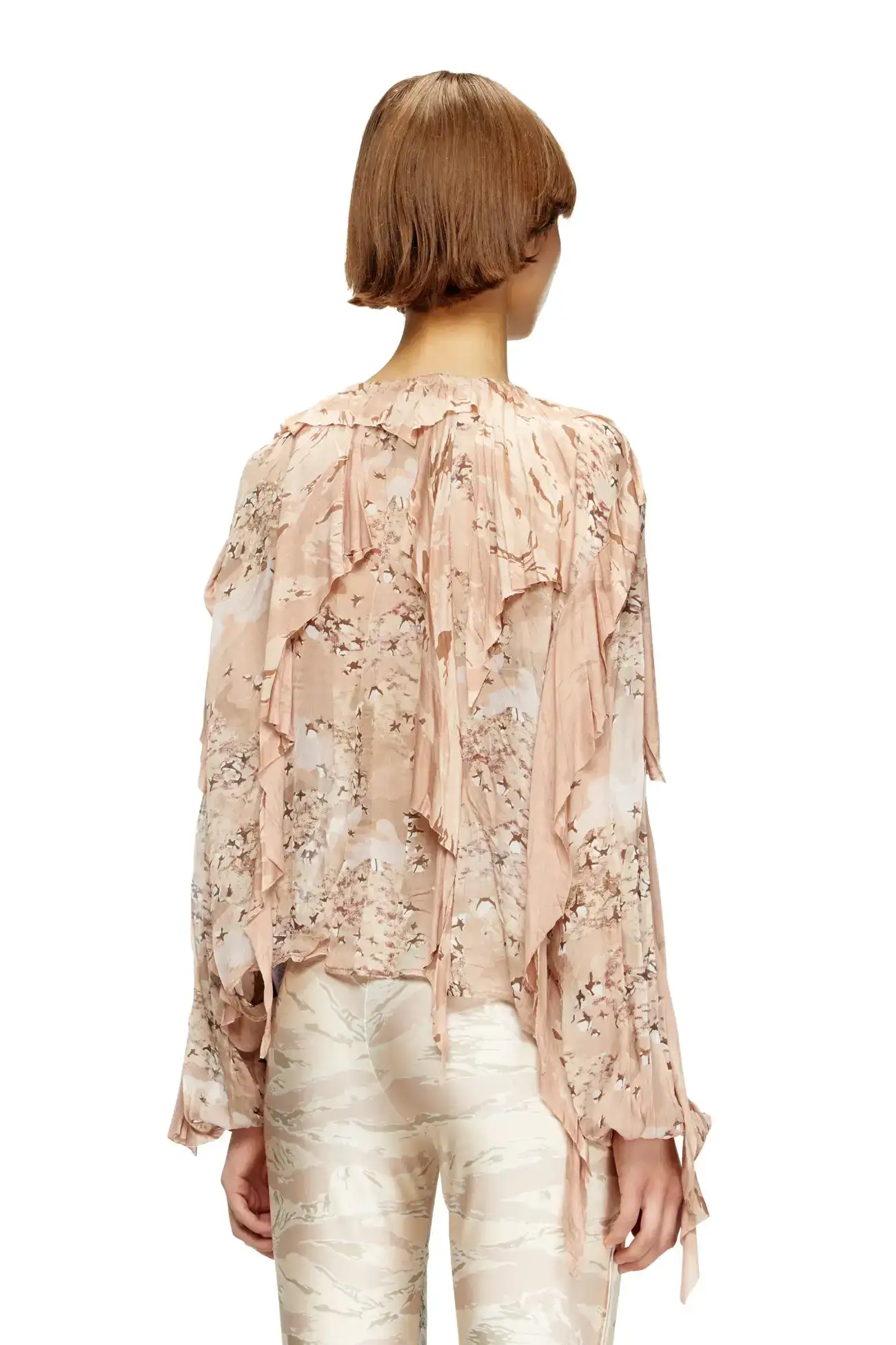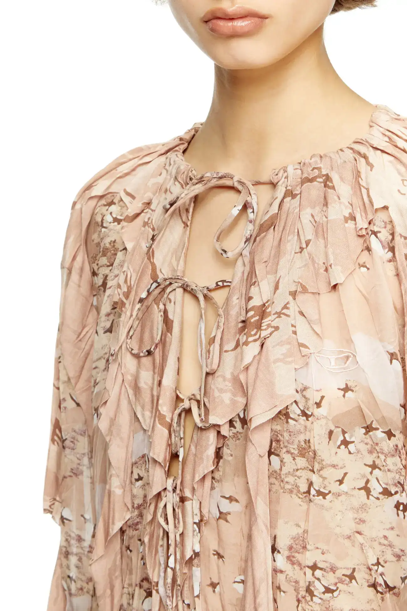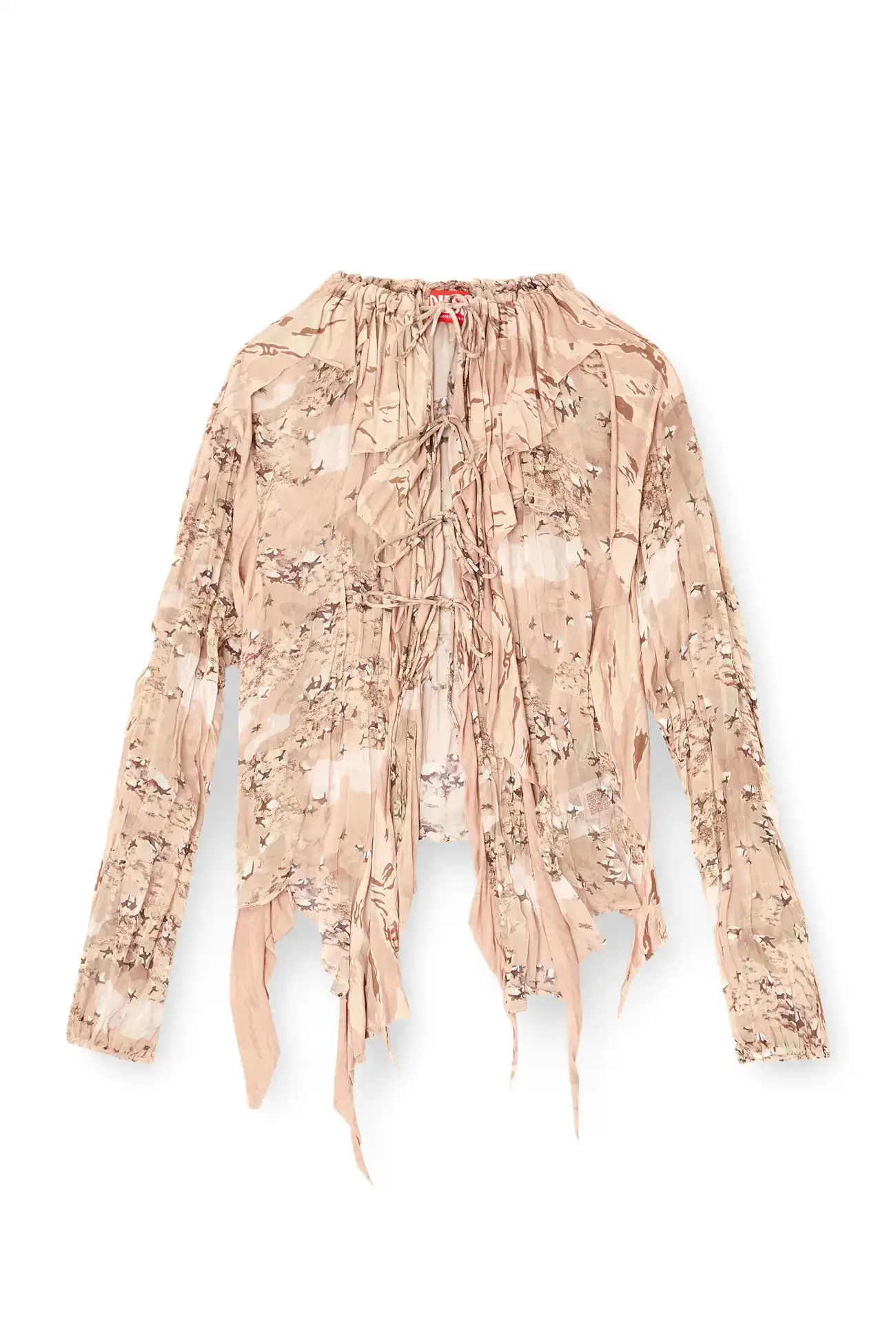 This women's blouse is a mash-up of camo prints in muted light brown hues. Cut from fluid chiffon with a steam-crinkled finish, its relaxed silhouette is styled with raw-cut asymmetrical jersey flounces, delicate front ties and a gathered drawstring collar for striking movement.