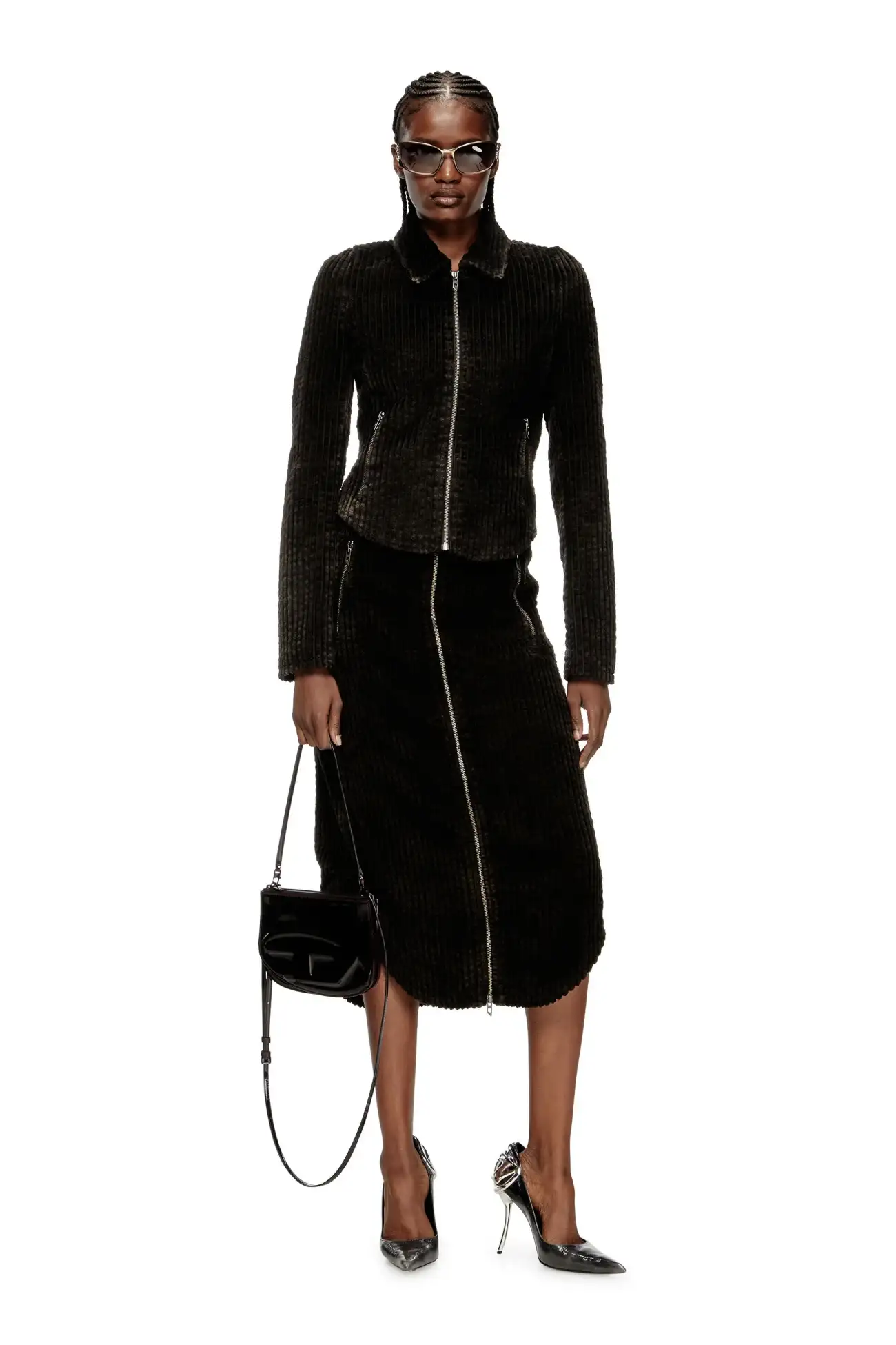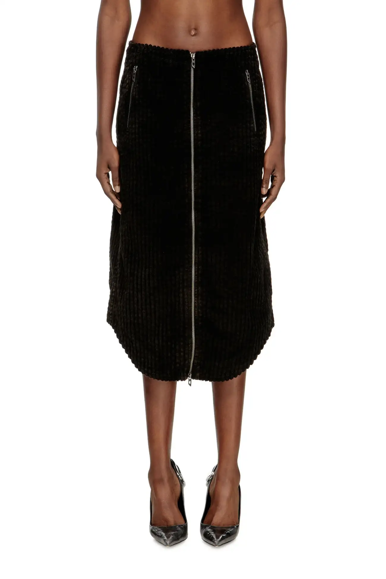 חצאית מידי מכותנה בצבע שחור, אפקט worn-in, פתיחת רוכסן קדמית מלאה עם מושכי Oval D, כיסים קדמיים עם רוכסן ופאץ' Oval D טון-על-טון