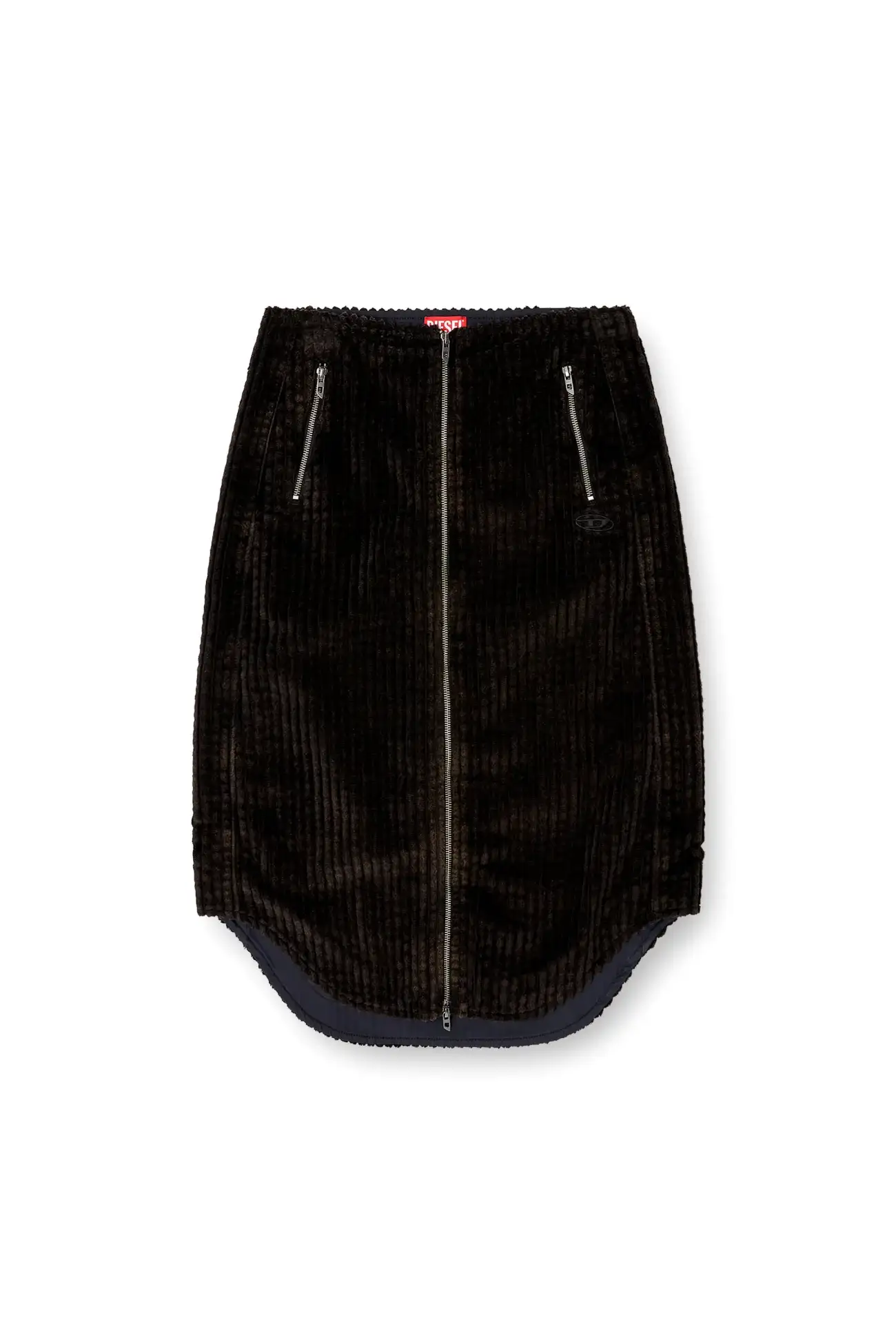 Cotton midi skirt with a used effect. It features a rounded hem and a full zip front opening, with pulls displaying the iconic Oval D logo. The two front pockets also have zip closures with logo pulls, and another Oval D tone-on-tone patch is applied on the front under the left pocket.