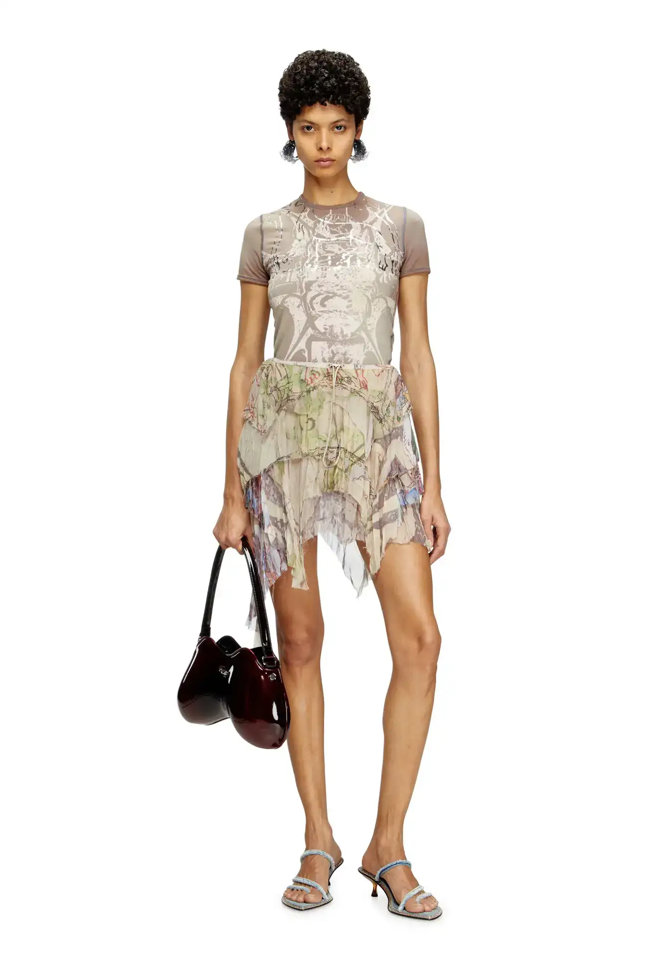 This crinkled TENCEL™ muslin skirt hangs in asymmetrical layers with raw-cut edges for a tattered look. The all-over print is an artistic collab, mixing medieval scenes with heraldic designs. Finished with a toggle stopper at the waist.