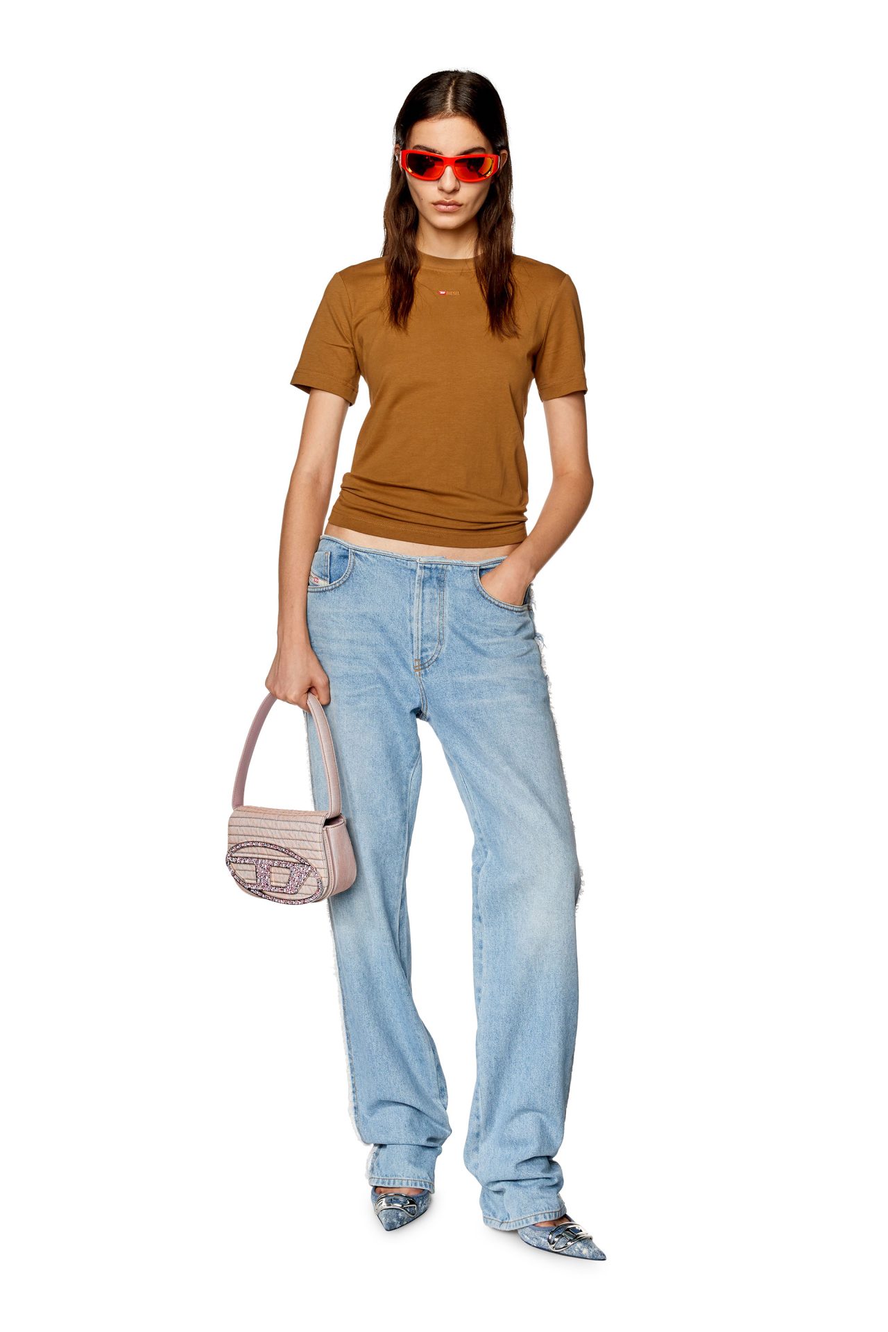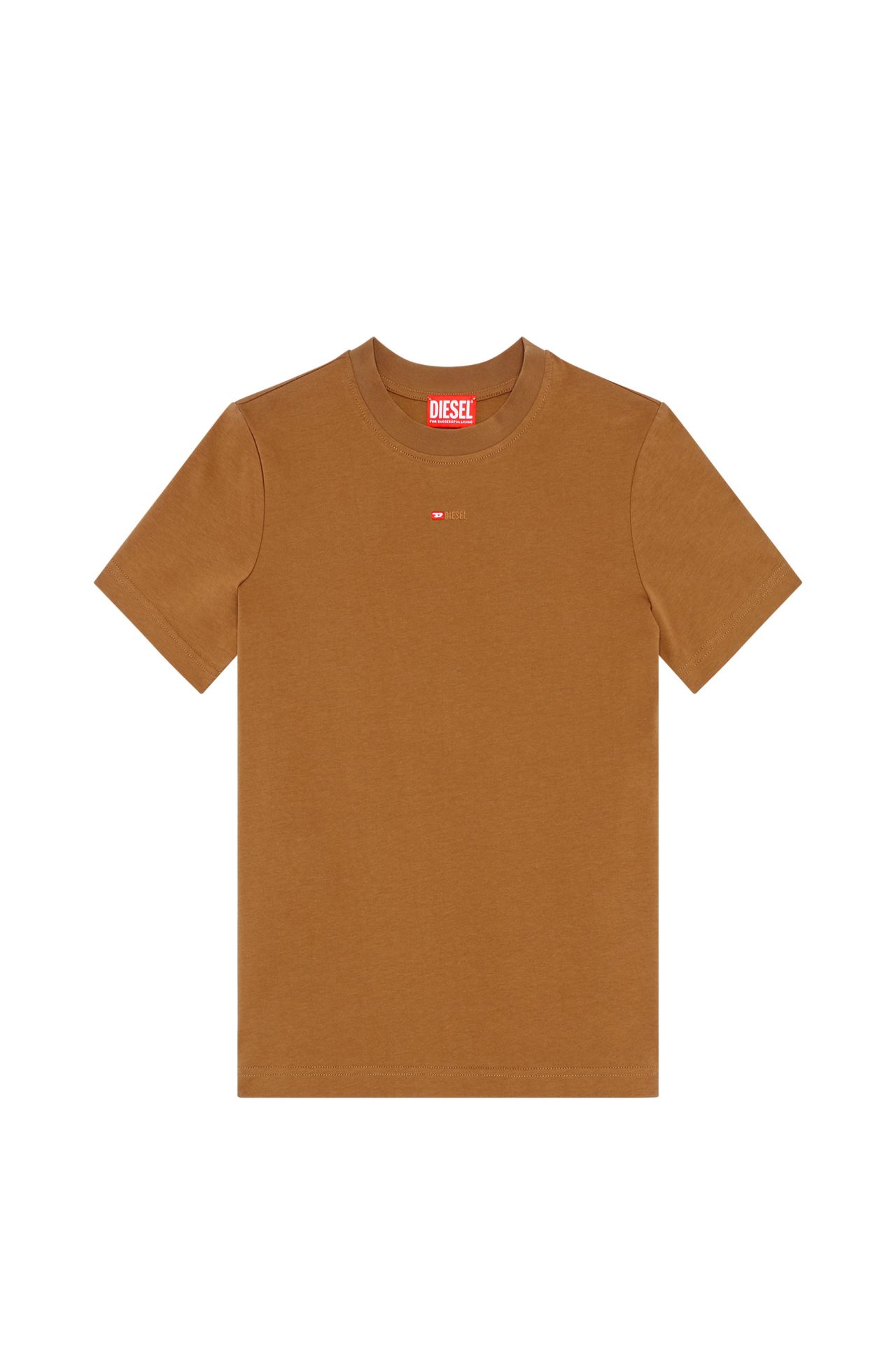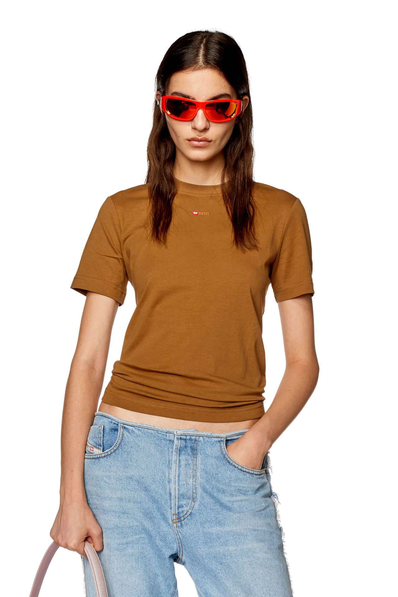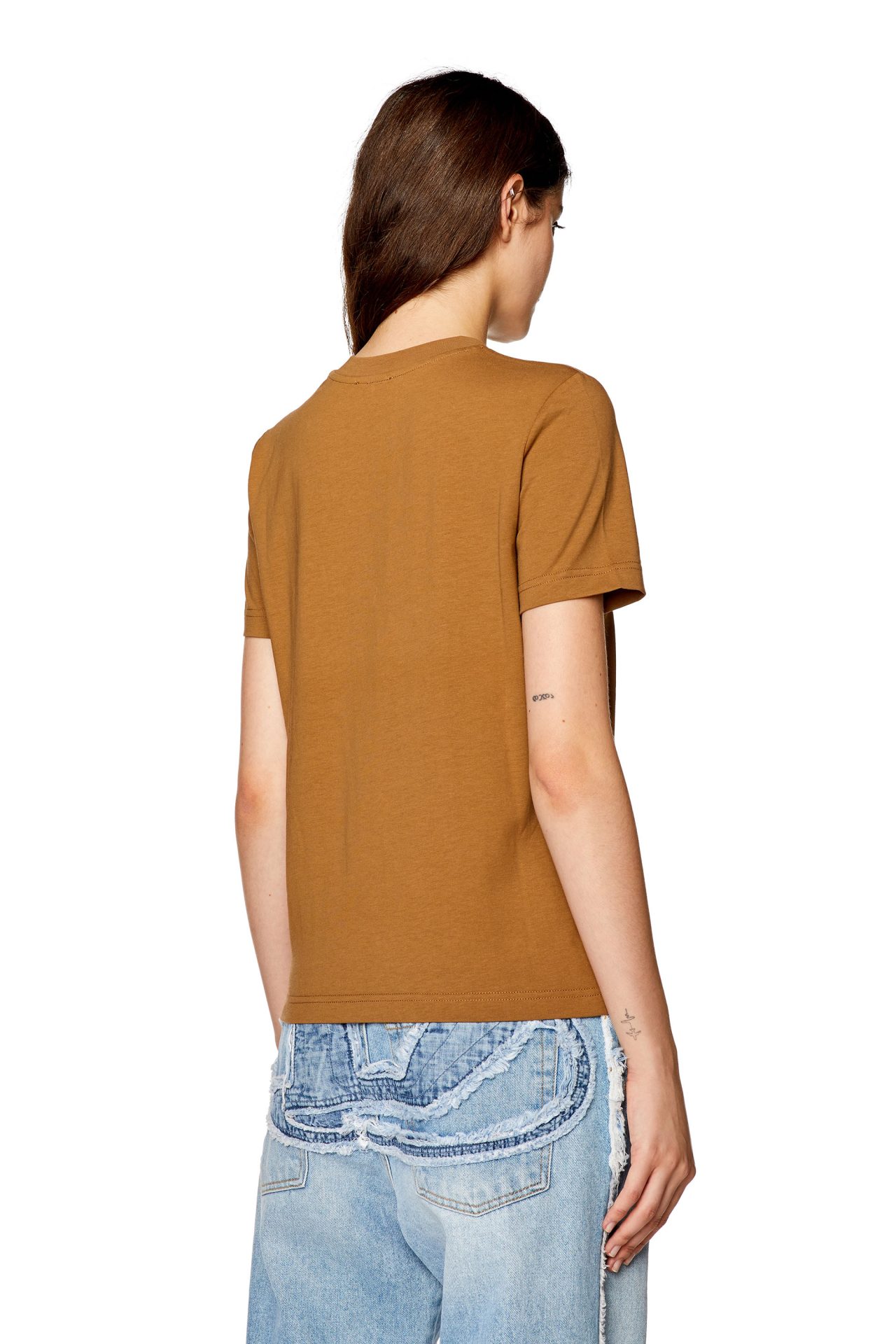 חולצת טי קצרה בצבע חום בהיר עם לוגו קטן רקום על החזה