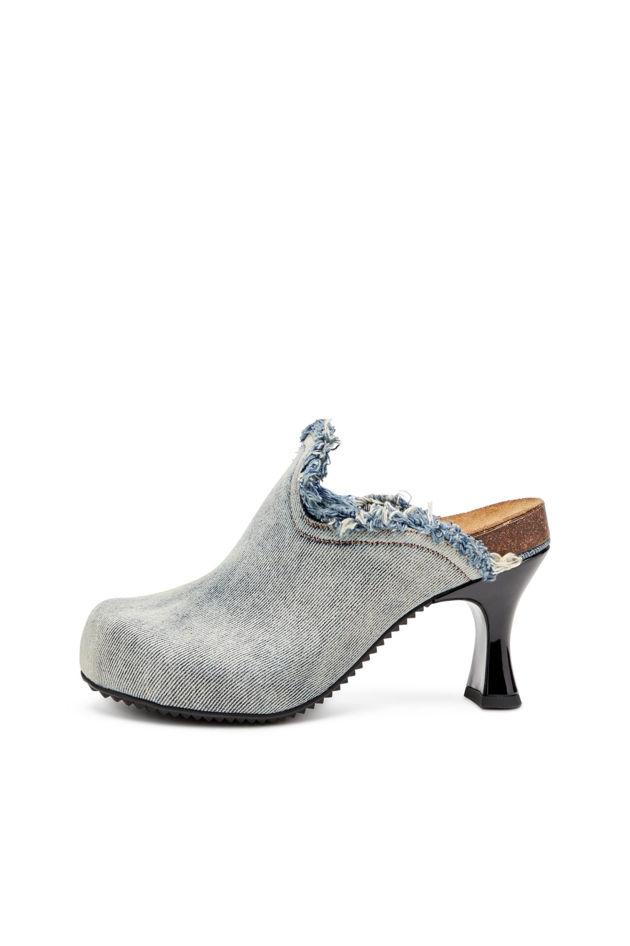 These women’s mules rework the rustic, bohemian vibe of a clog in a contemporary way. Set on high-gloss heels with a chunky fluted profile, they have a frayed denim upper detailed with the iconic fifth pocket logo flag. The moulded cork-blend footbed and serrated sole ensure comfort and grip.