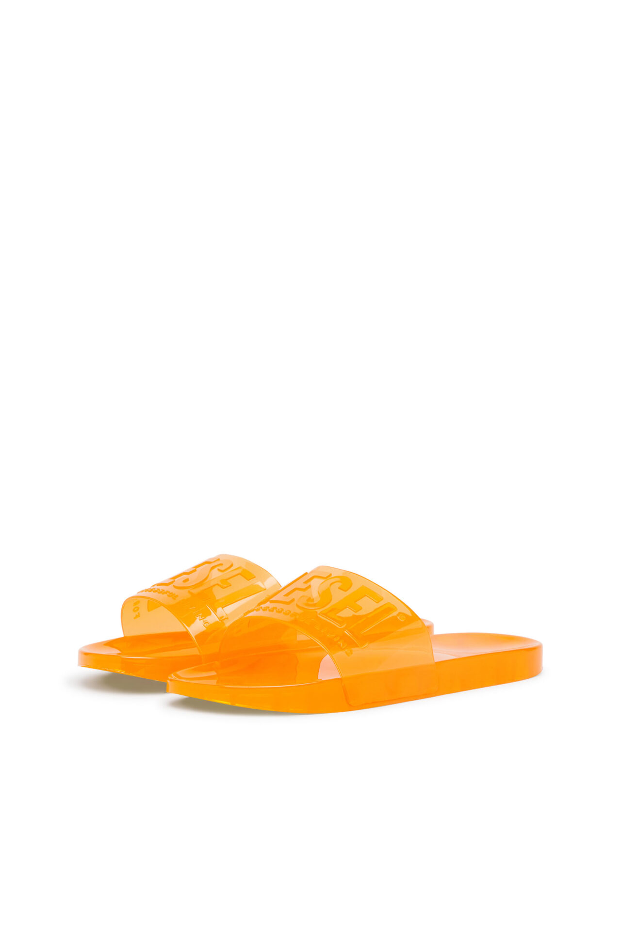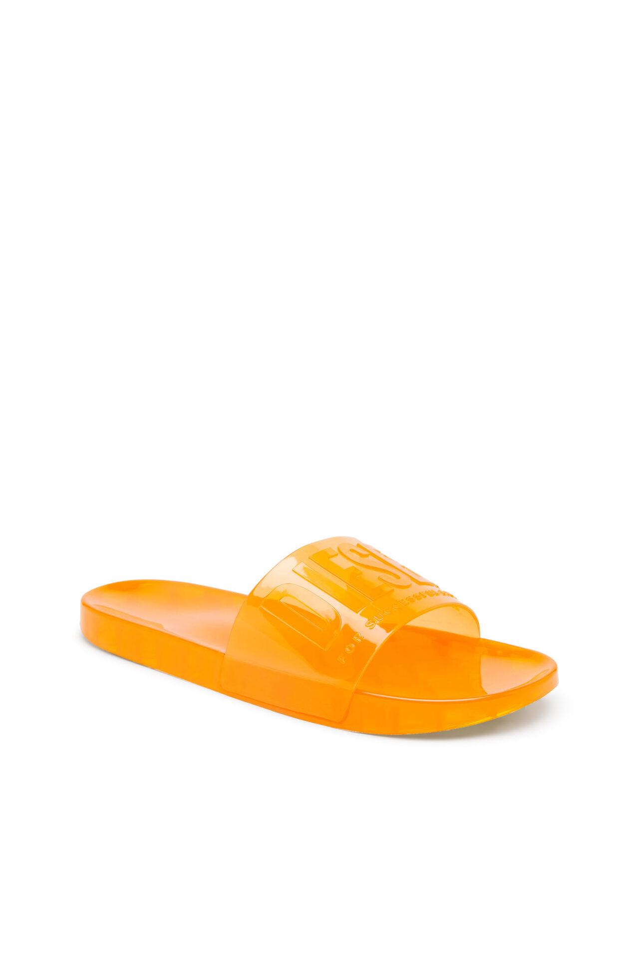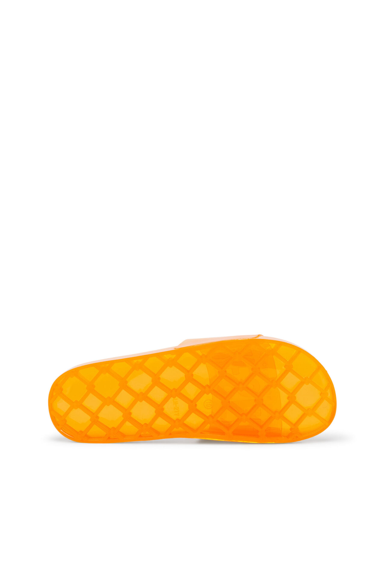 כפכפי סלייד שקופים בצבע כתום ניאון, עשויים PVC בעיצוב יוניסקס, עם לוגו דיזל על הרצועה