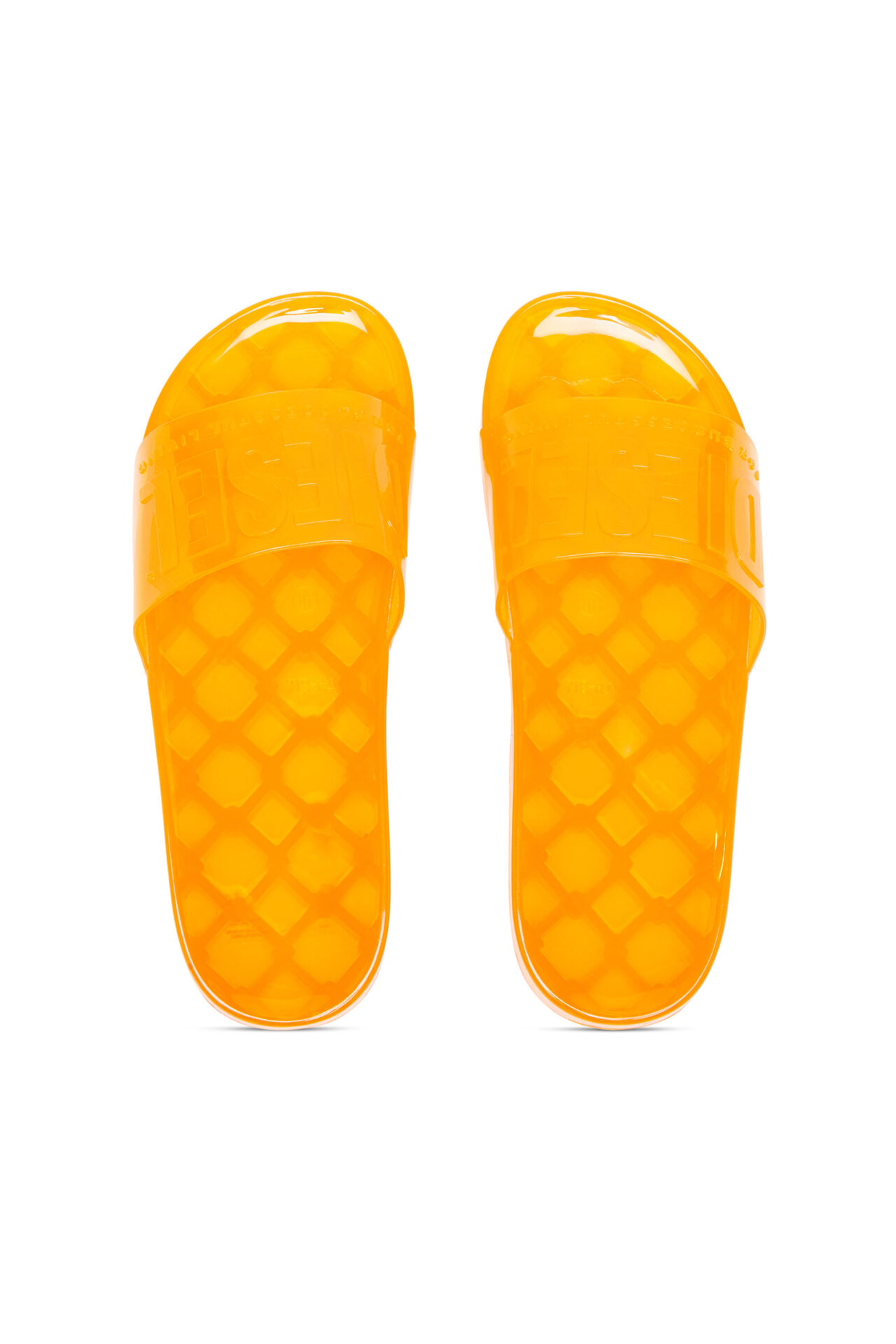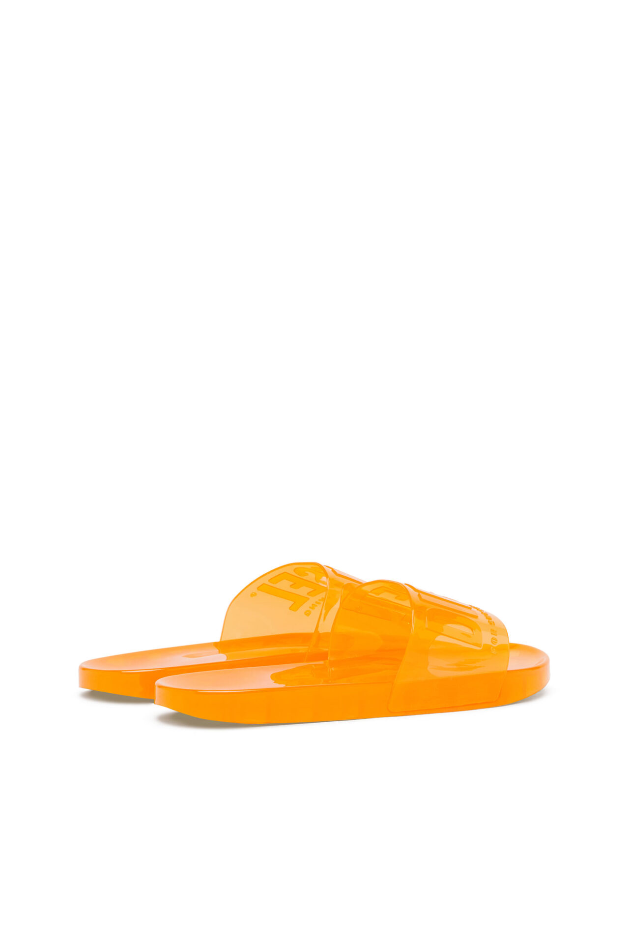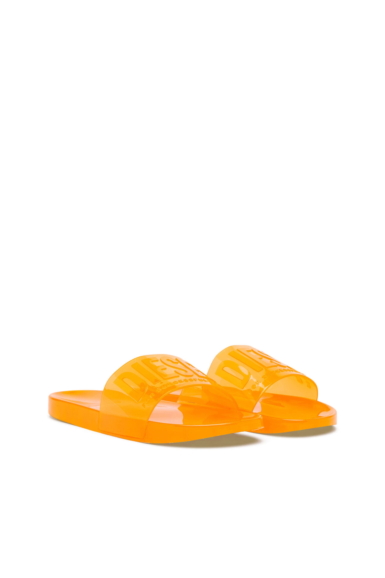 כפכפי סלייד שקופים בצבע כתום ניאון, עשויים PVC בעיצוב יוניסקס, עם לוגו דיזל על הרצועה