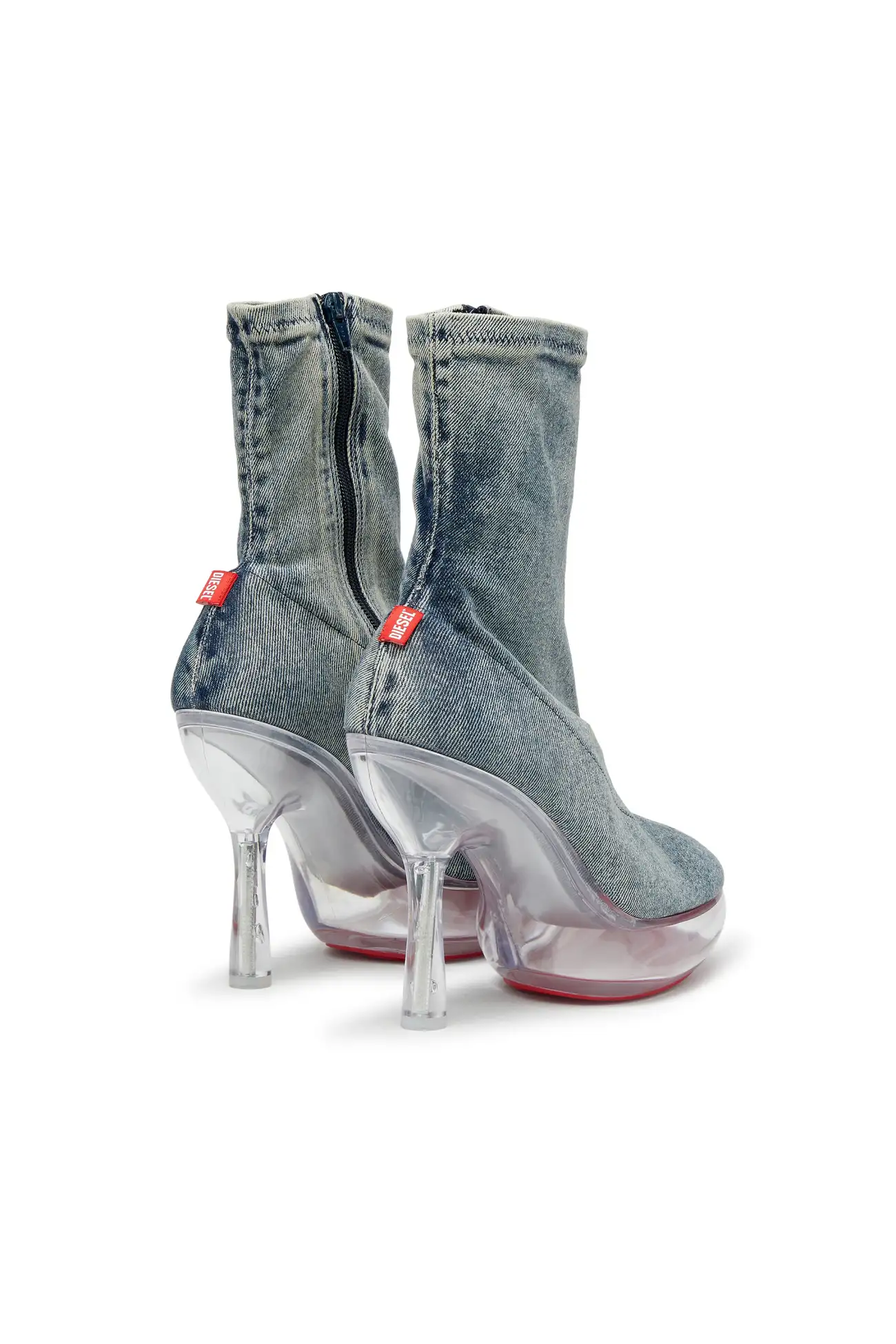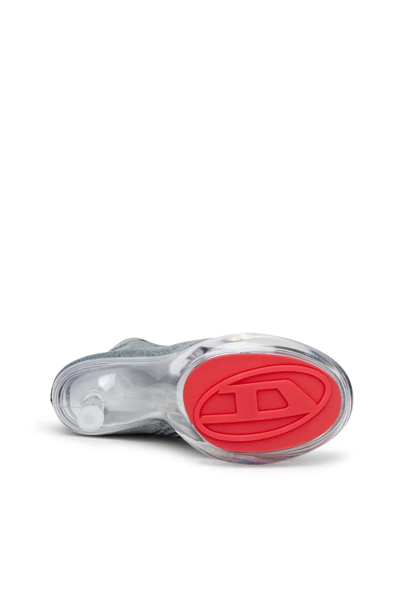 מגפי דנים לנשים עם רוכסן צדדי. החלק העליון מדנים אלסטי בשטיפת dirty wash ומונח על פלטפורמה בגובה 3 ס"מ ועקב 12 ס"מ מפלקסיגלס שקוף ליצירת גובה מודגש. סוליית גומי עם לוגו Oval D מוסיפה אחיזה.