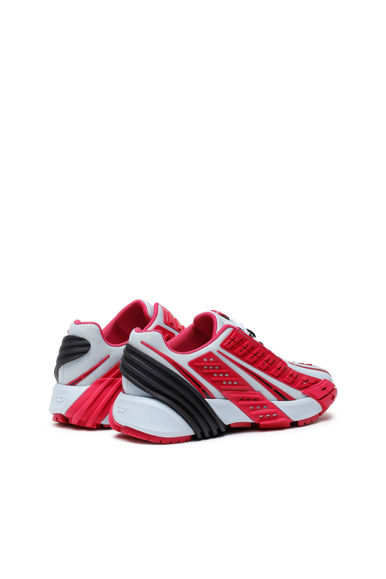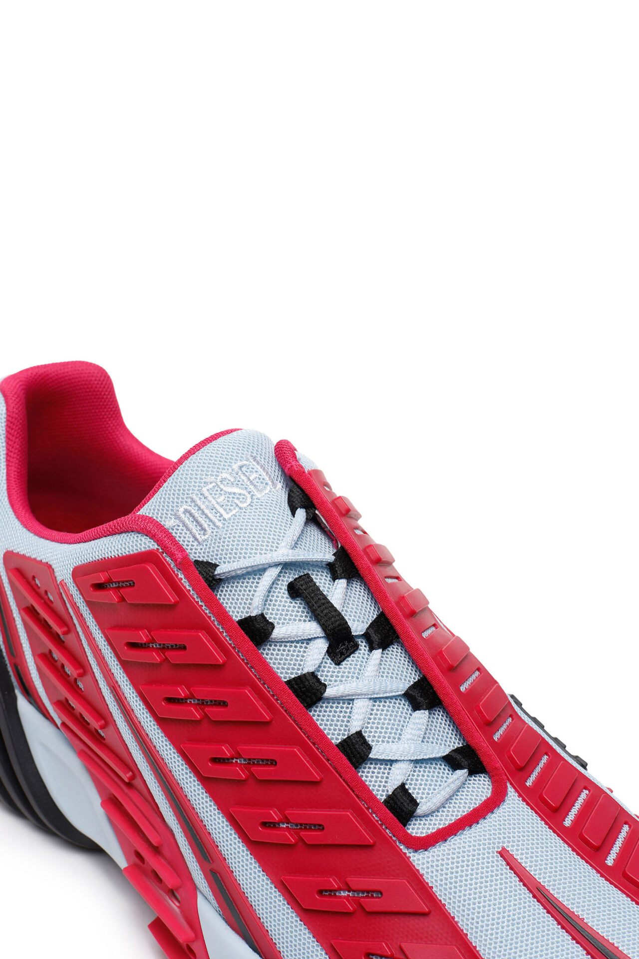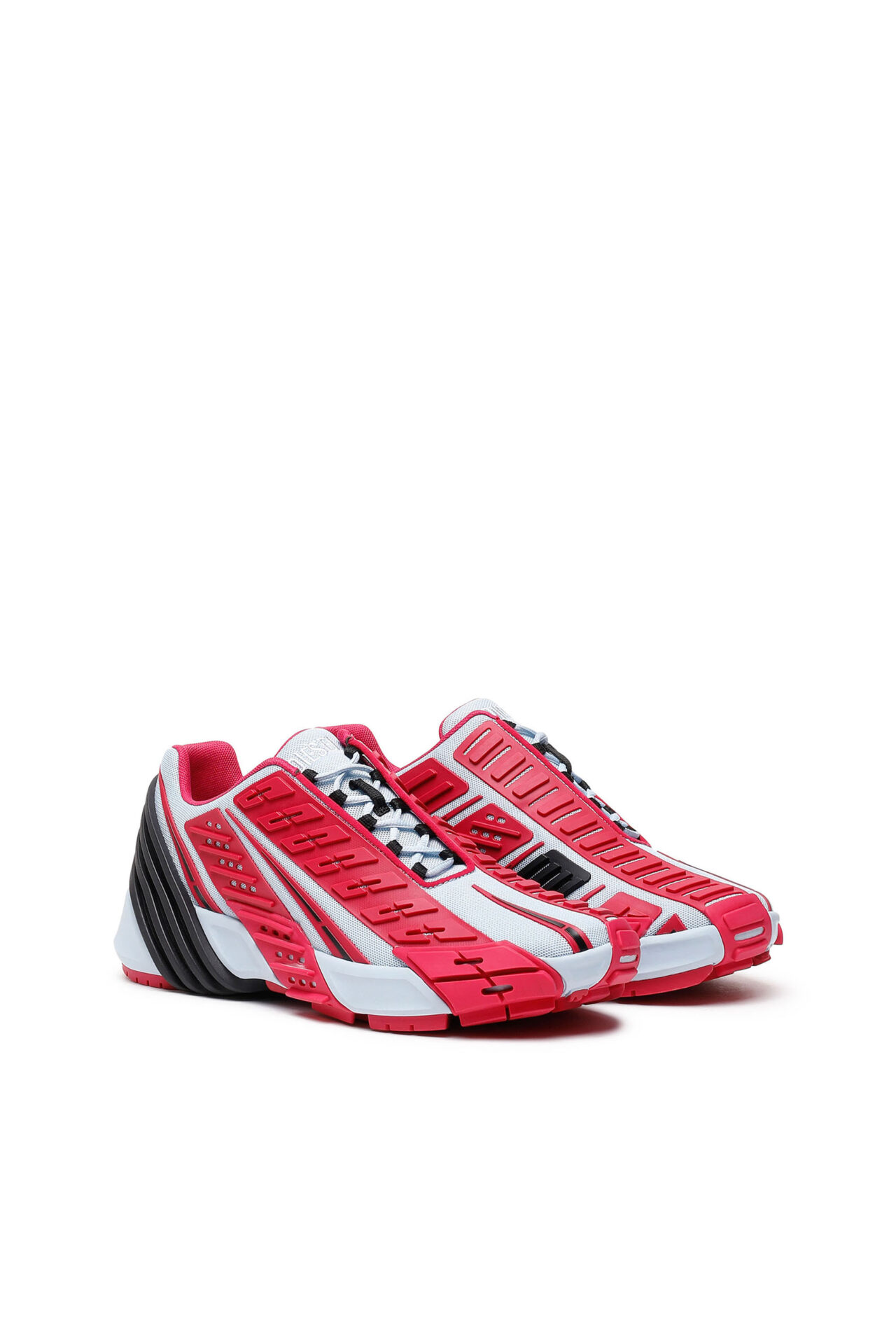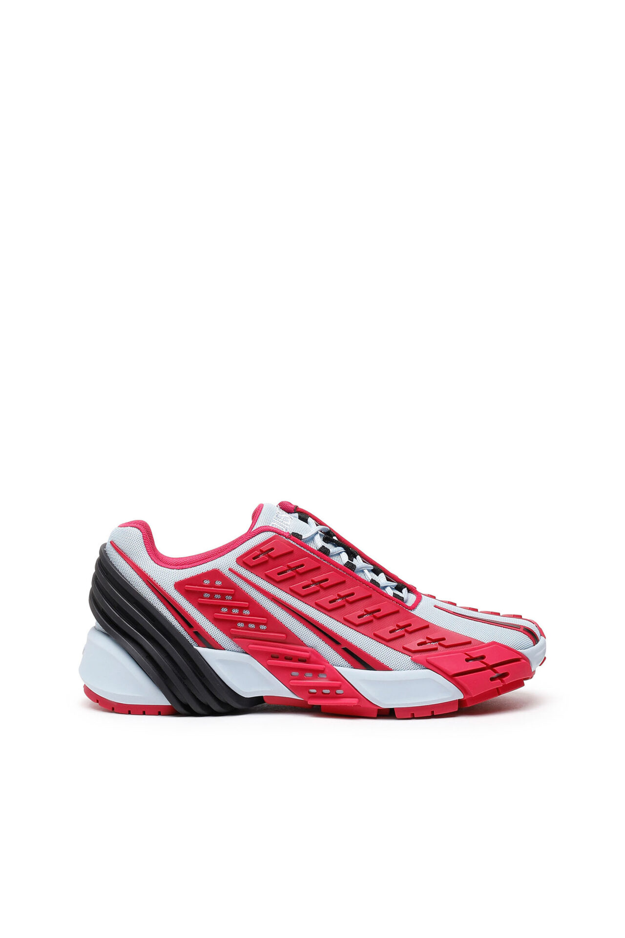 These sneakers are defined by the multi-textured moulded overlays that wrap around the shoe, becoming part of the unique industrial tread pattern. The upper is made from closed mesh and finished with an asymmetric lace-up .